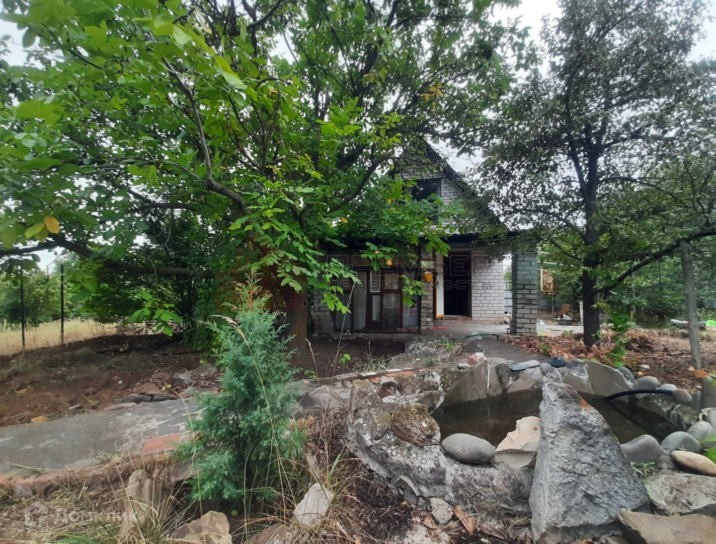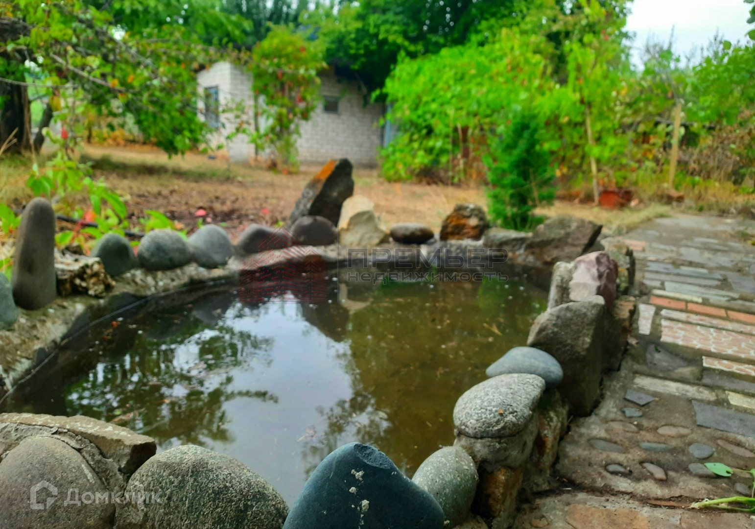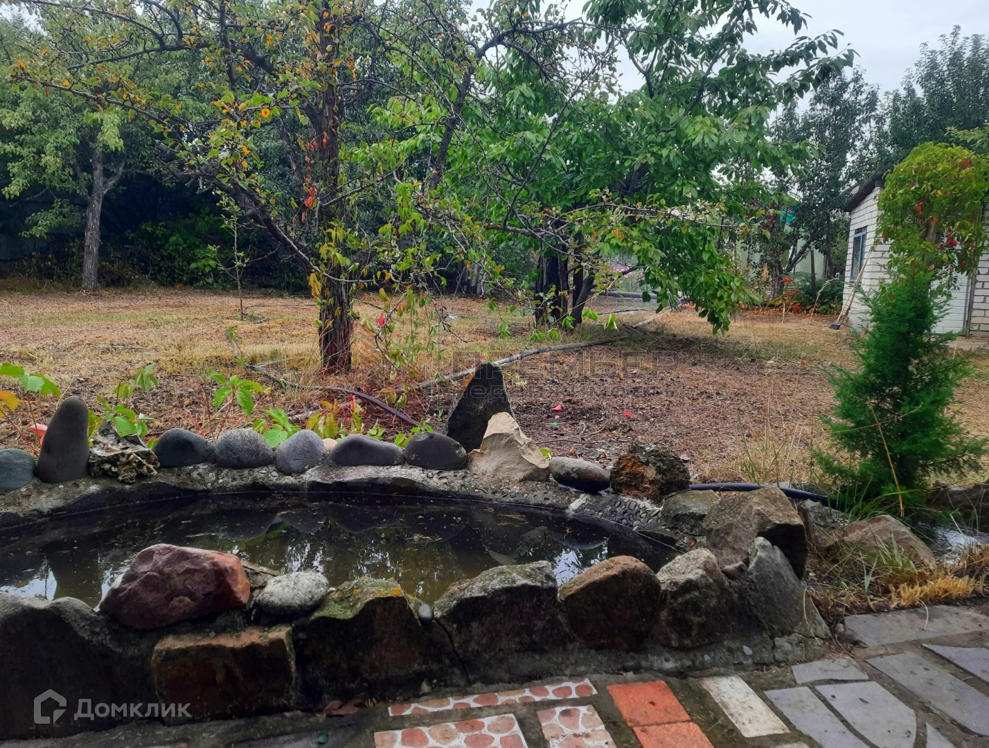 На участке много плодовых деревьев, есть бетонные дорожки. Альпийская горка, прудик.