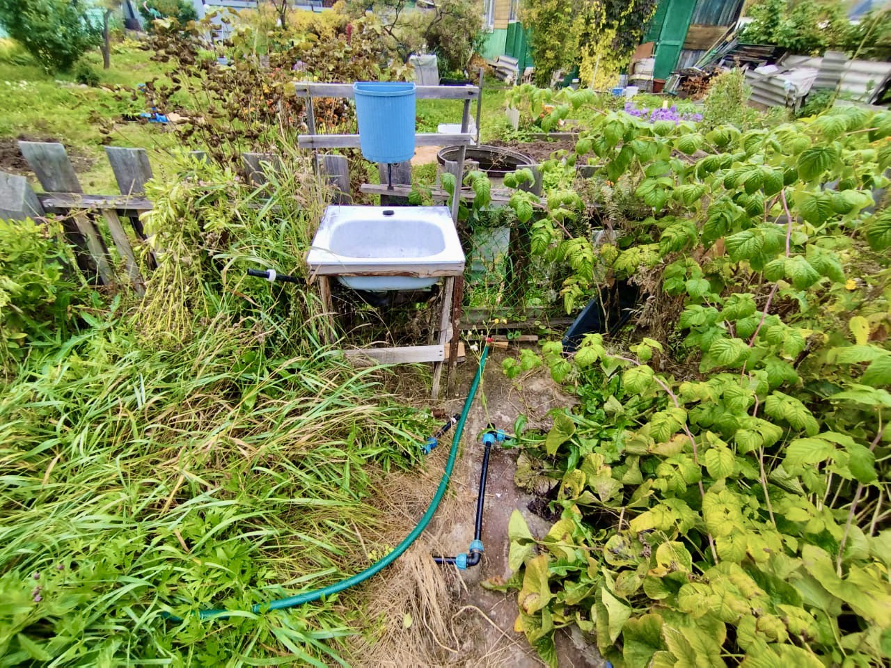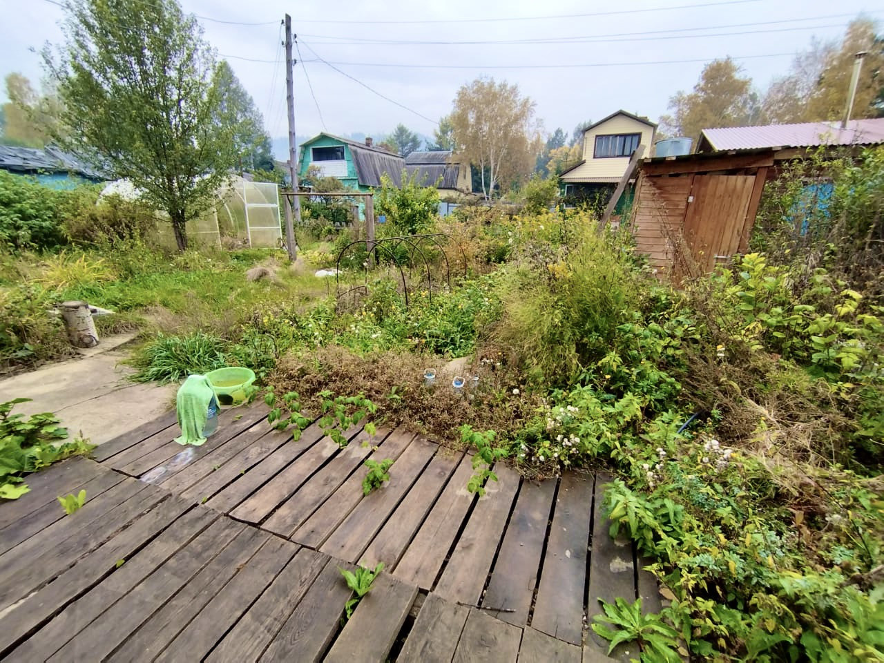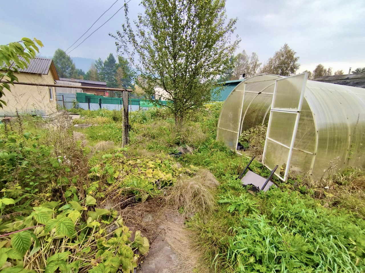 На участке есть теплица из поликарбоната, грядки, огуречная теплица, душ летний и летний водопровод.