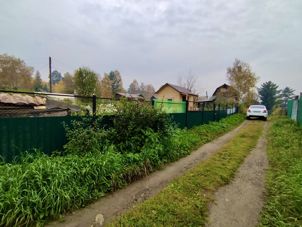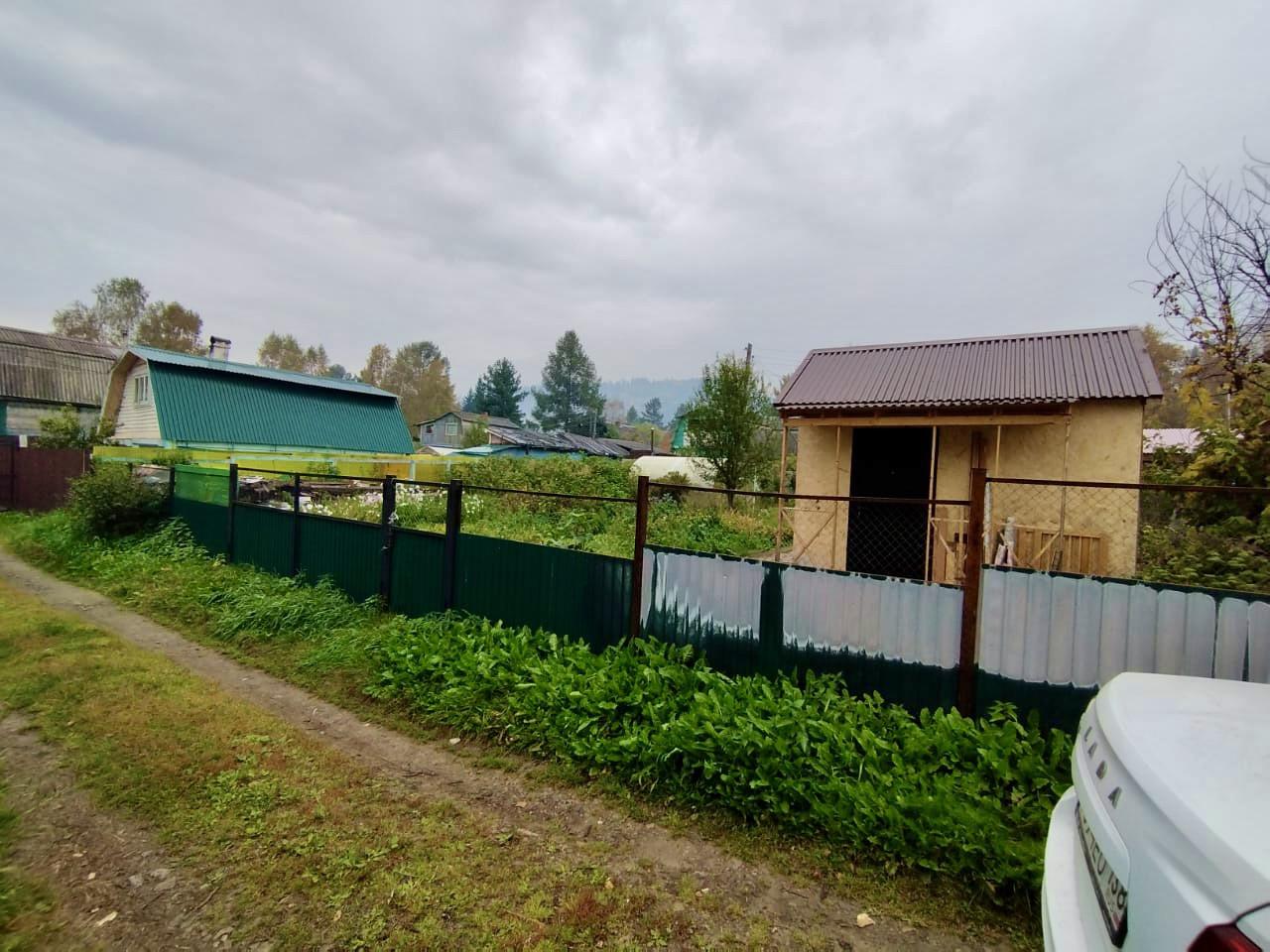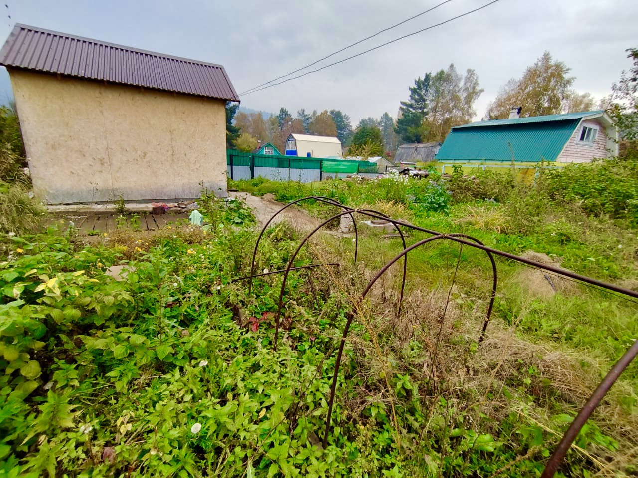 На участке есть теплица из поликарбоната, грядки, огуречная теплица, душ летний и летний водопровод.