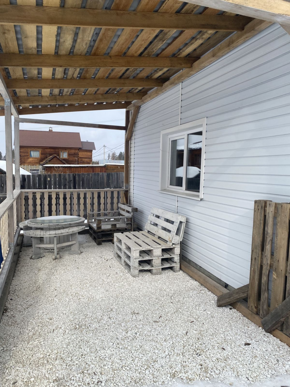 Рядом с домом есть место для отдыха под навесом как летняя терраса.