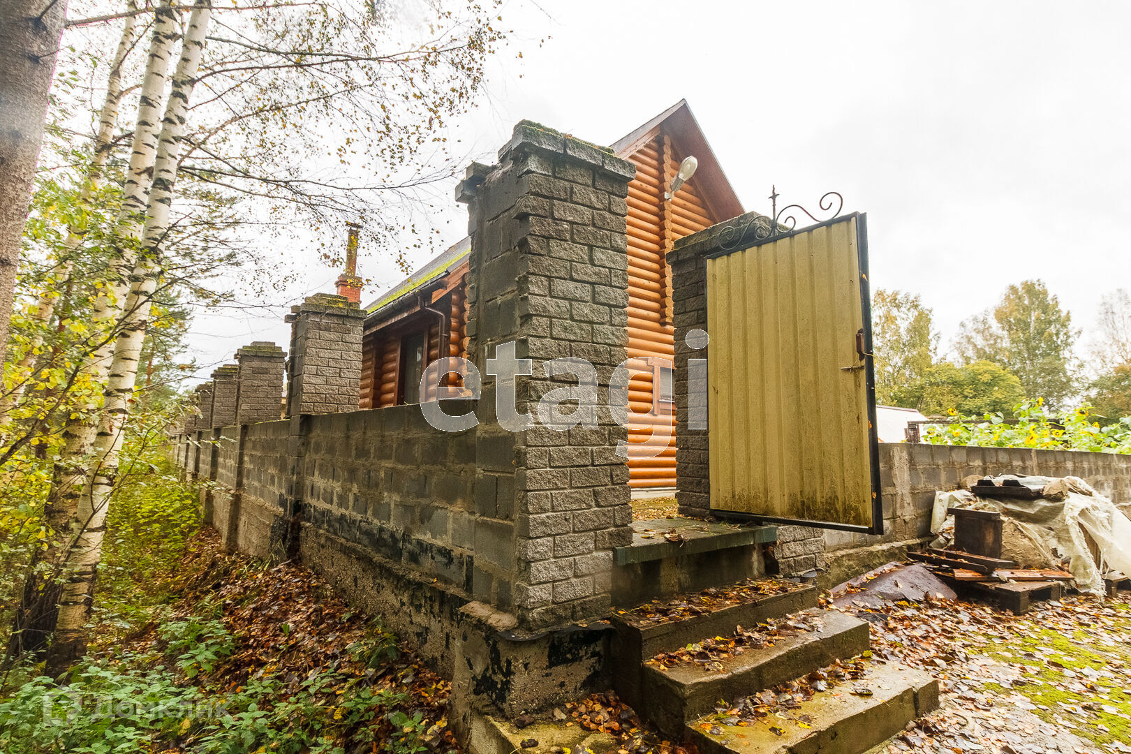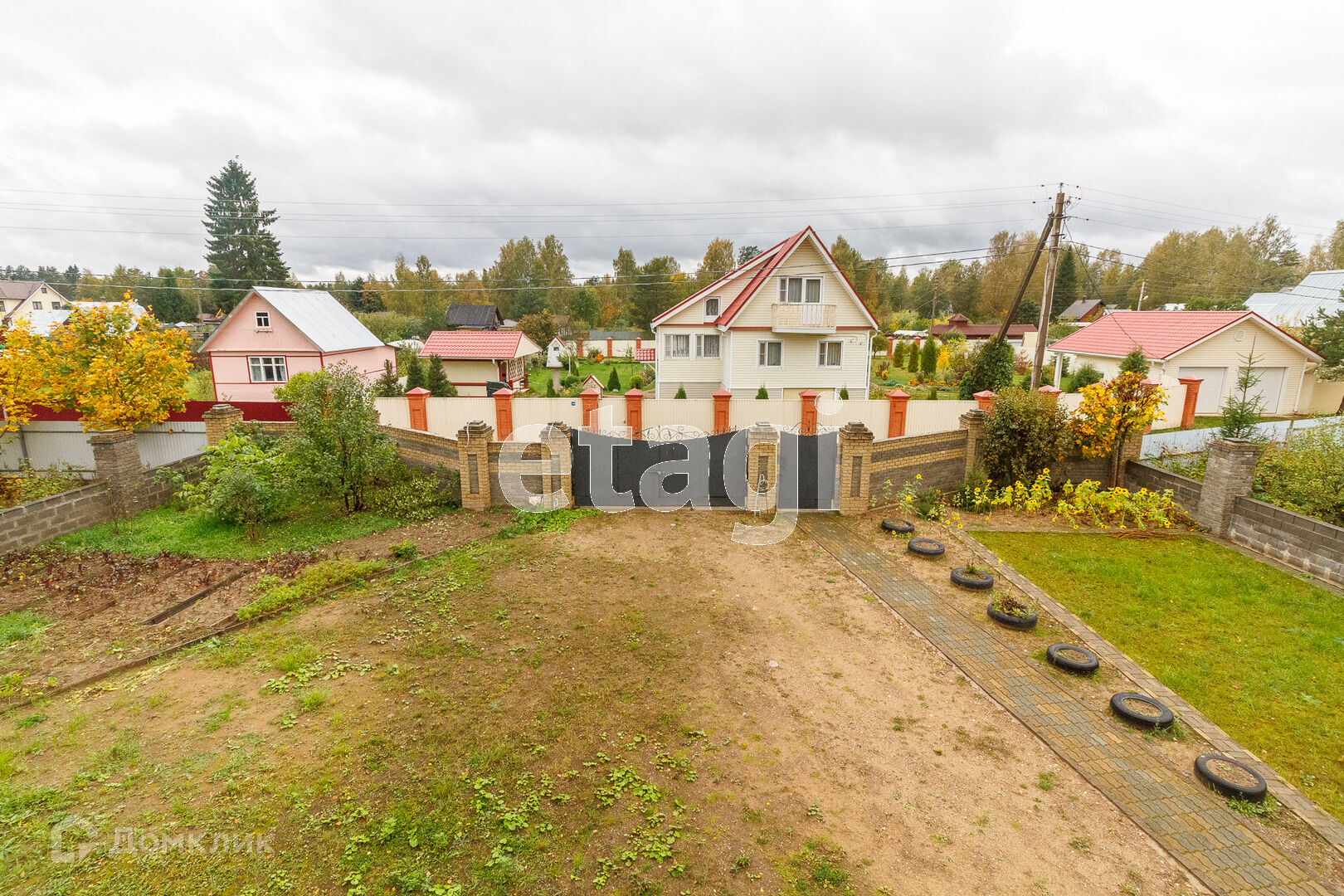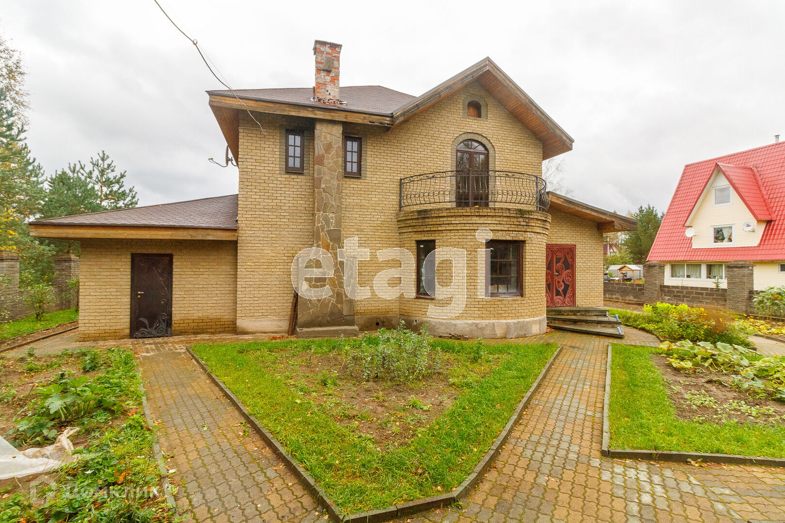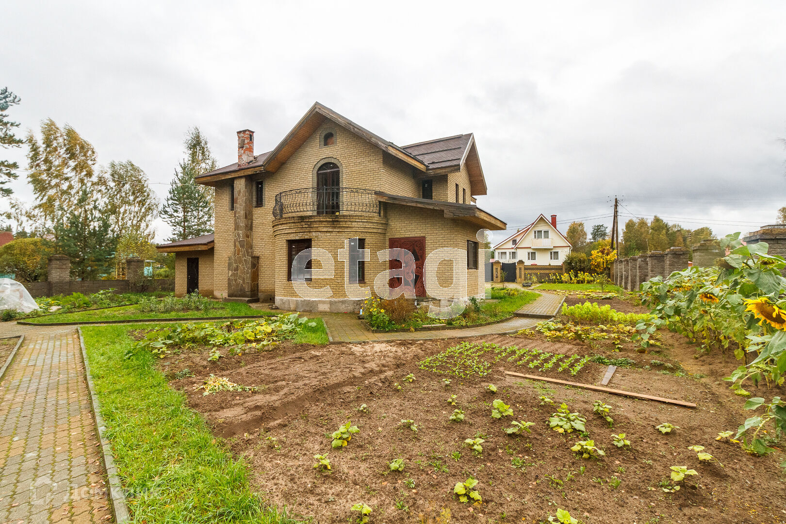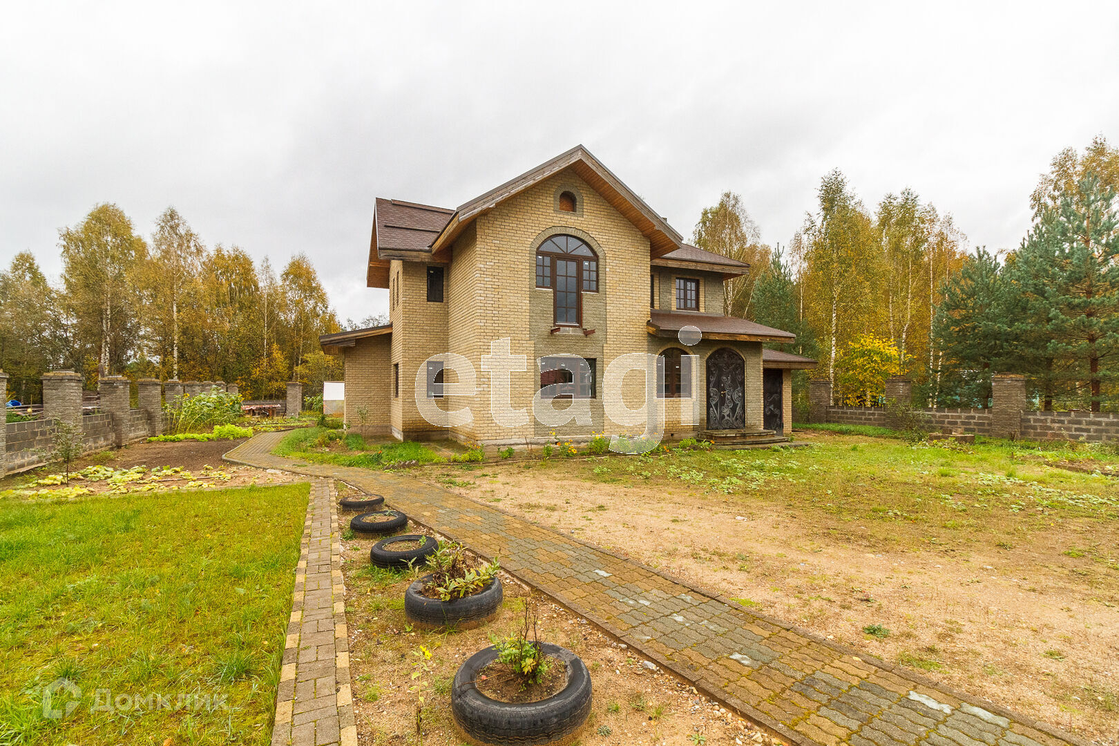 По всей территории в 15 соток ограждён кирпичным забором. На участке все тропинки выложены плиткой. Сам дом построен из кирпича. Внутри дома черновая отделка. На первом этаже имеется 2 комнаты в одной из которых находится печь с стеклянной дверью камина, которая создаёт приятный уют. Так же на первом этаже имеется 2 раздельных санузла. Под домом вкопаны 4 кольца для септика.