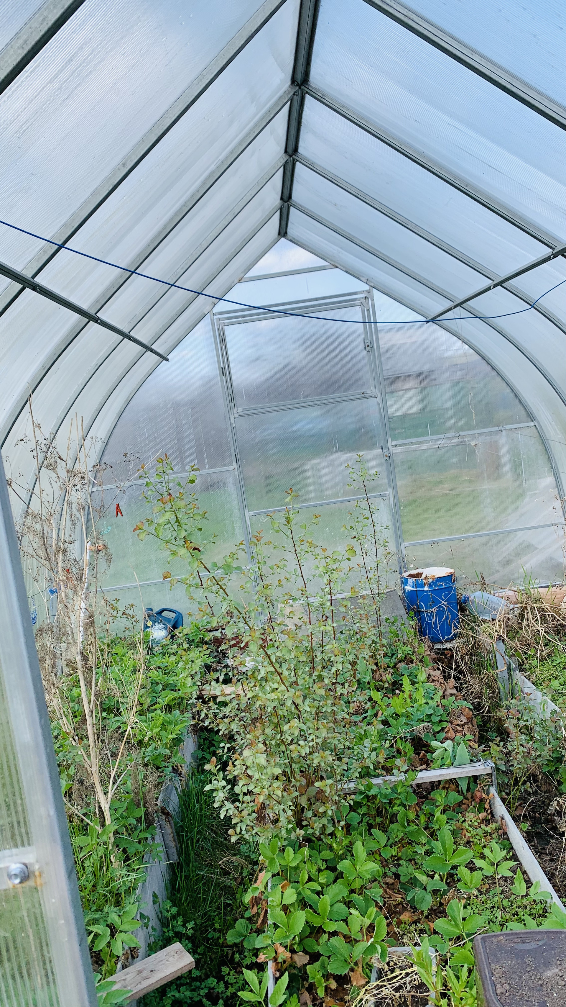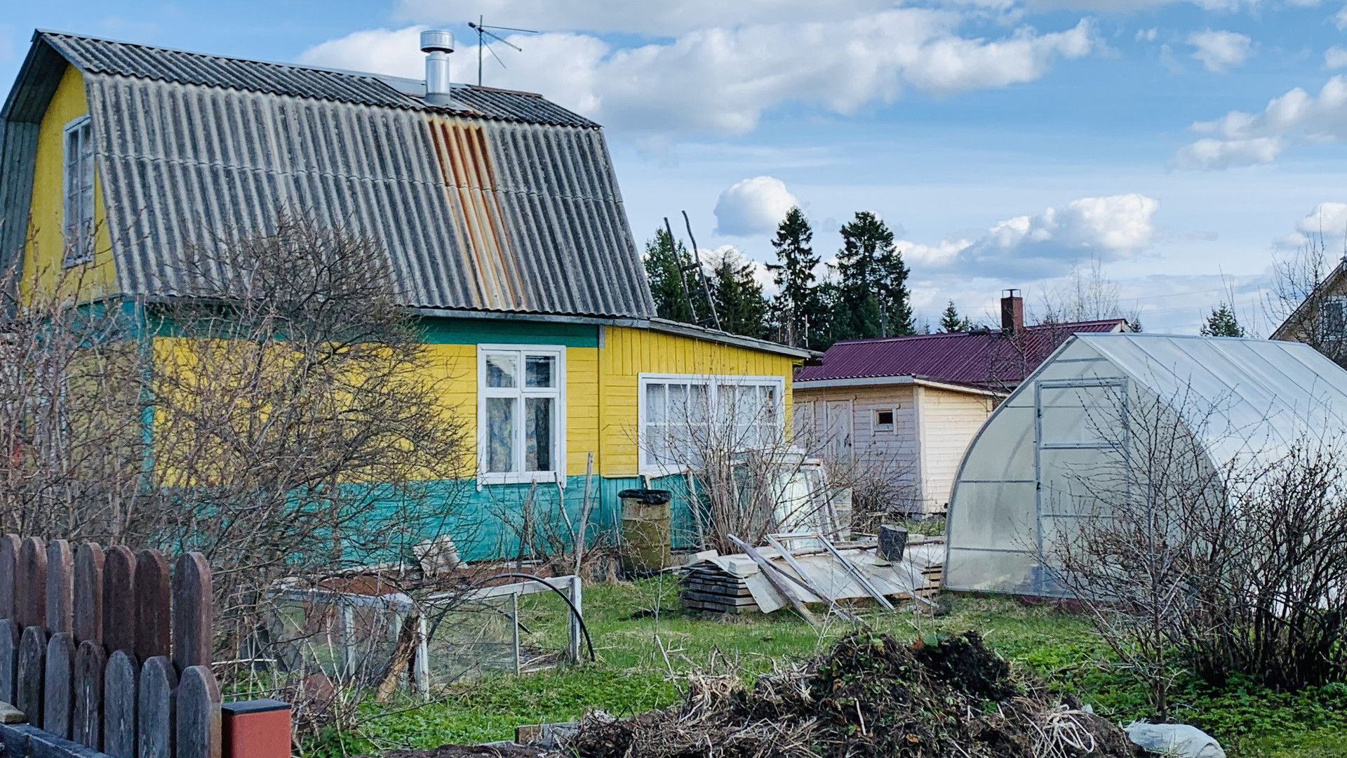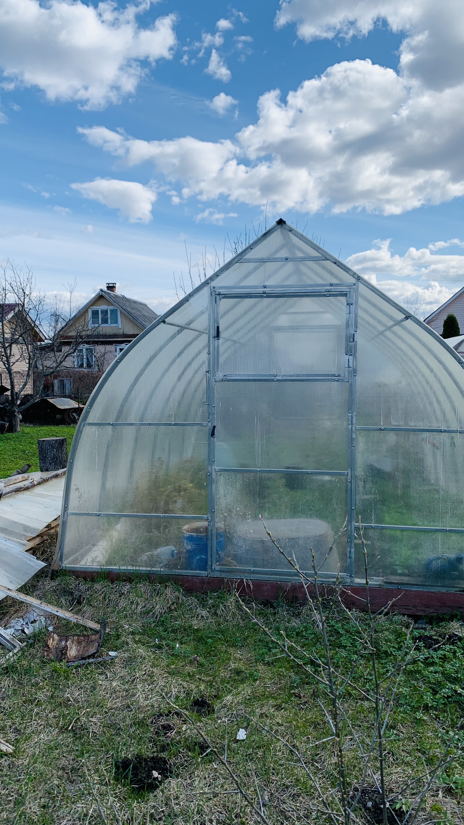 Новая бытовка, две теплицы. туалет. Посадки: кусты смородины, малины, облепиха. яблони.