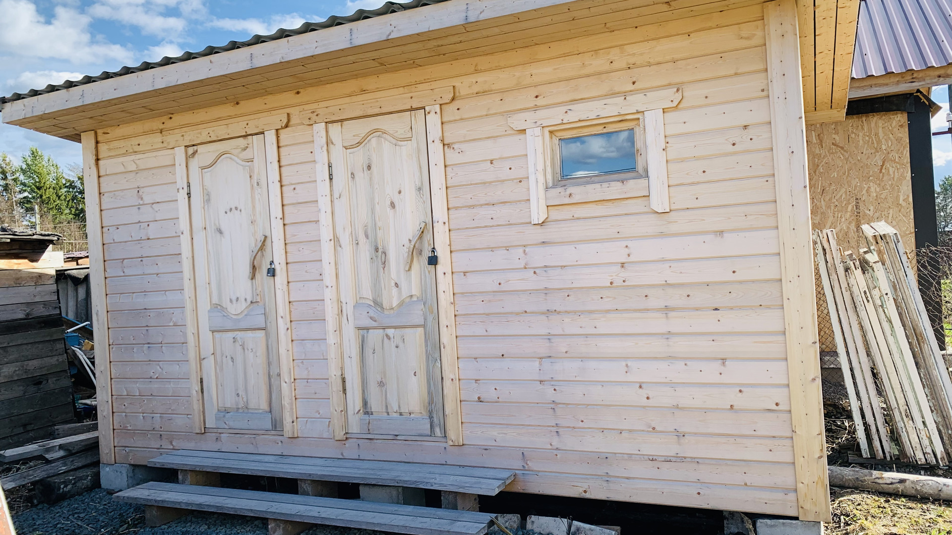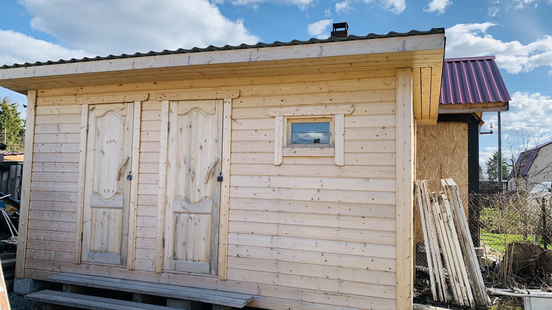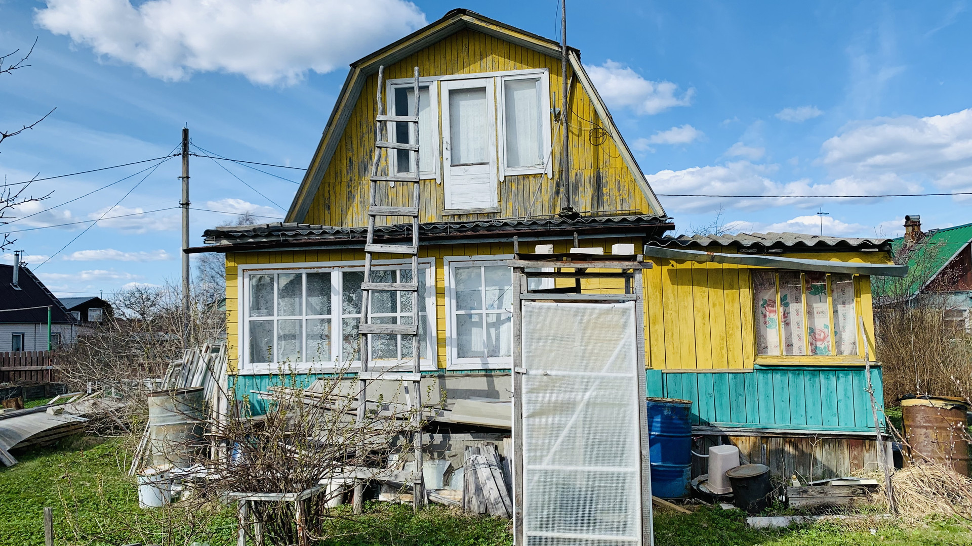 Новая бытовка, две теплицы. туалет. Посадки: кусты смородины, малины, облепиха. яблони.