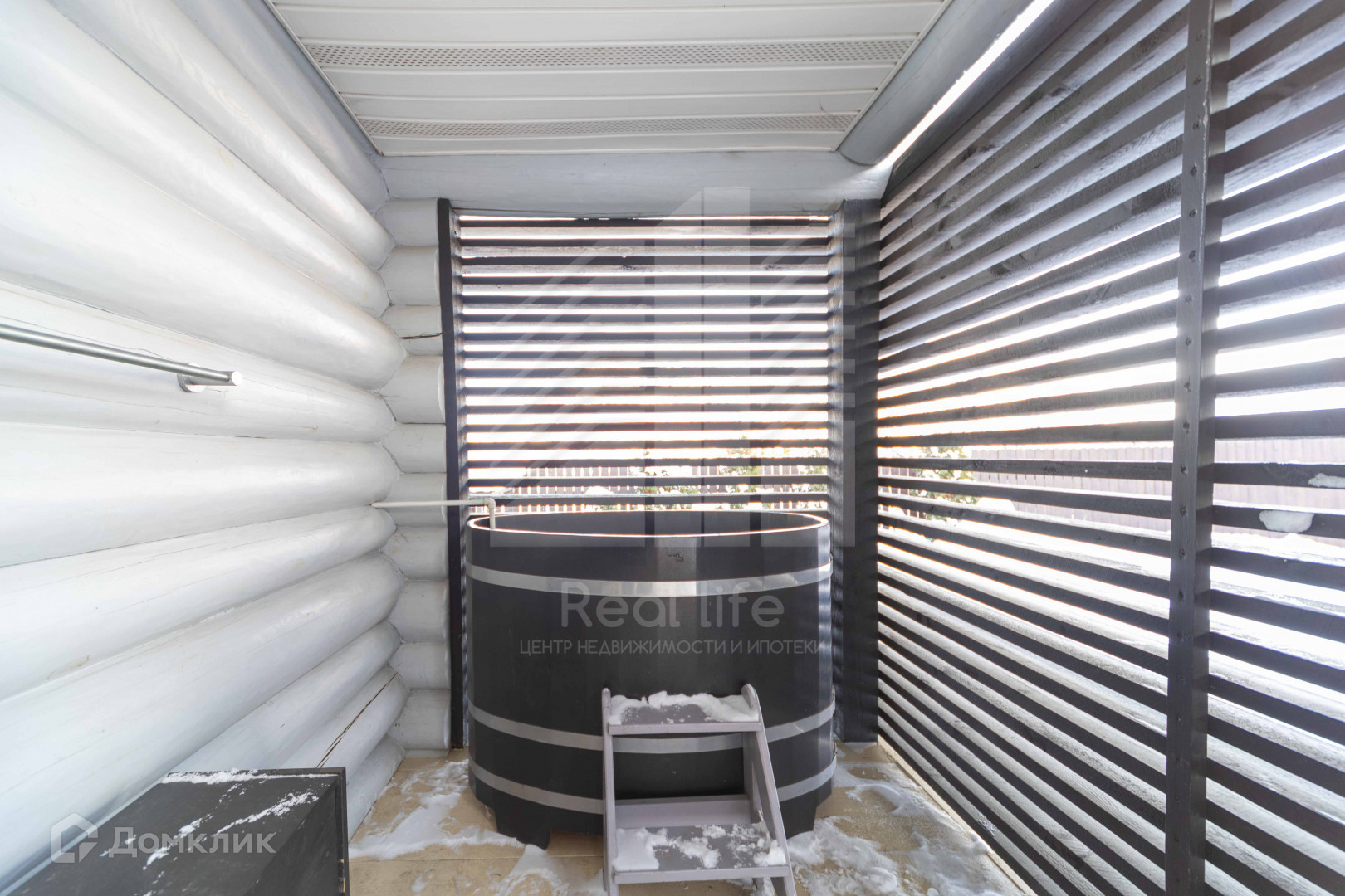 Из дома выход на просторное патио, с купелью и видом на декоративный пруд.