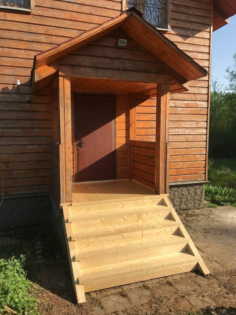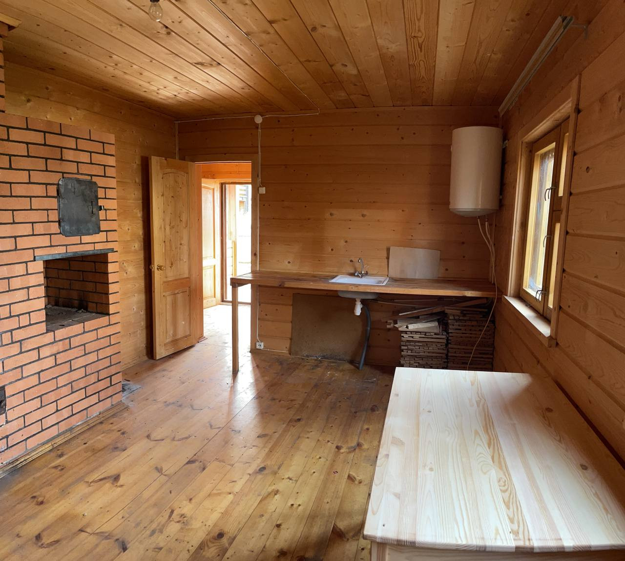 - лестница, печка, горячая (бойлер) и холодная вода, металлическая дверь,
