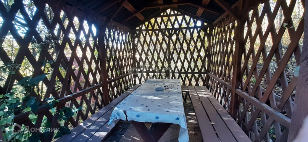 Замечательное дополнение к дому - большая беседка, спрятанная в деревьях. Некоторые из них (миндаль, яблони, ирга) цветут в начале лета. Беседка вмещает большую компанию или семью.