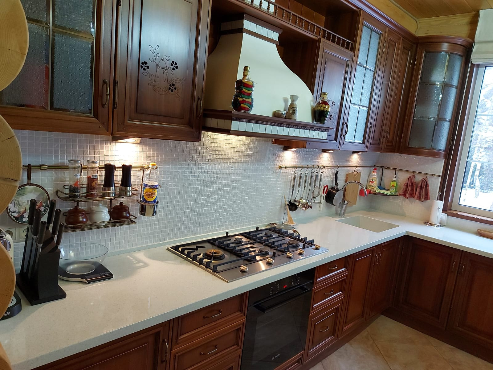 Дом оснащён деревянной мебелью в едином стиле, - авторский проект (ручная работа). В просторах первого этажа: Холл, Кабинет, Комната, Санузел, Большая кухня (Новая плита на 5 конфорок, столешница на 65 см. - искусственный камень). Обеденная группа, Гостиная – ВТОРОЙ СВЕТ! Каминная зона, оборудованная профессиональной электронной системой с использованием акустической аппаратуры. Дизайн декорирован прекрасными картинами, коваными элементами на заказ, люстра с сусальным золотом. Винтовая лестница из ценной породы дерева с выходом на комнату отдыха. На втором этаже: Спальня с женским будуаром, Вторая Спальня, Детская комната, Просторный санузел. Дом полностью укомплектован Европейской бытовой техникой. Застекленная Веранда с уютным уголком для отдыха – ВТОРОЙ СВЕТ! Мебель на балконе - новая и установили автоматические окна. Отопление - ГАЗОВЫЙ КОТЁЛ, Видеонаблюдение. Трехфазное напряжение (на каждую линию установлен стабилизатор напряжения). Установлен Газгольдер-6,5 кубов. Основным направлением строительства такого дома является их практичность и натуральные материалы.