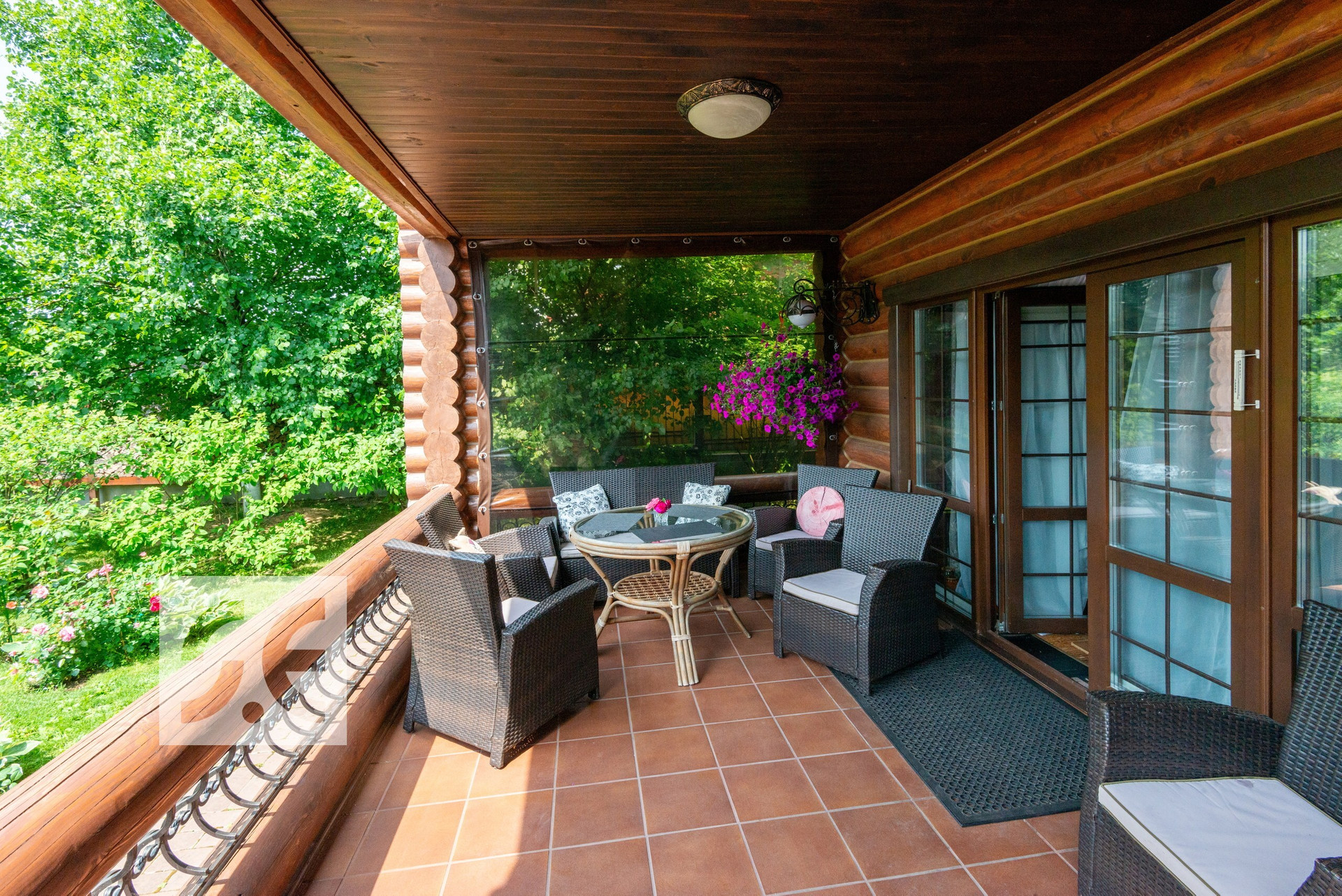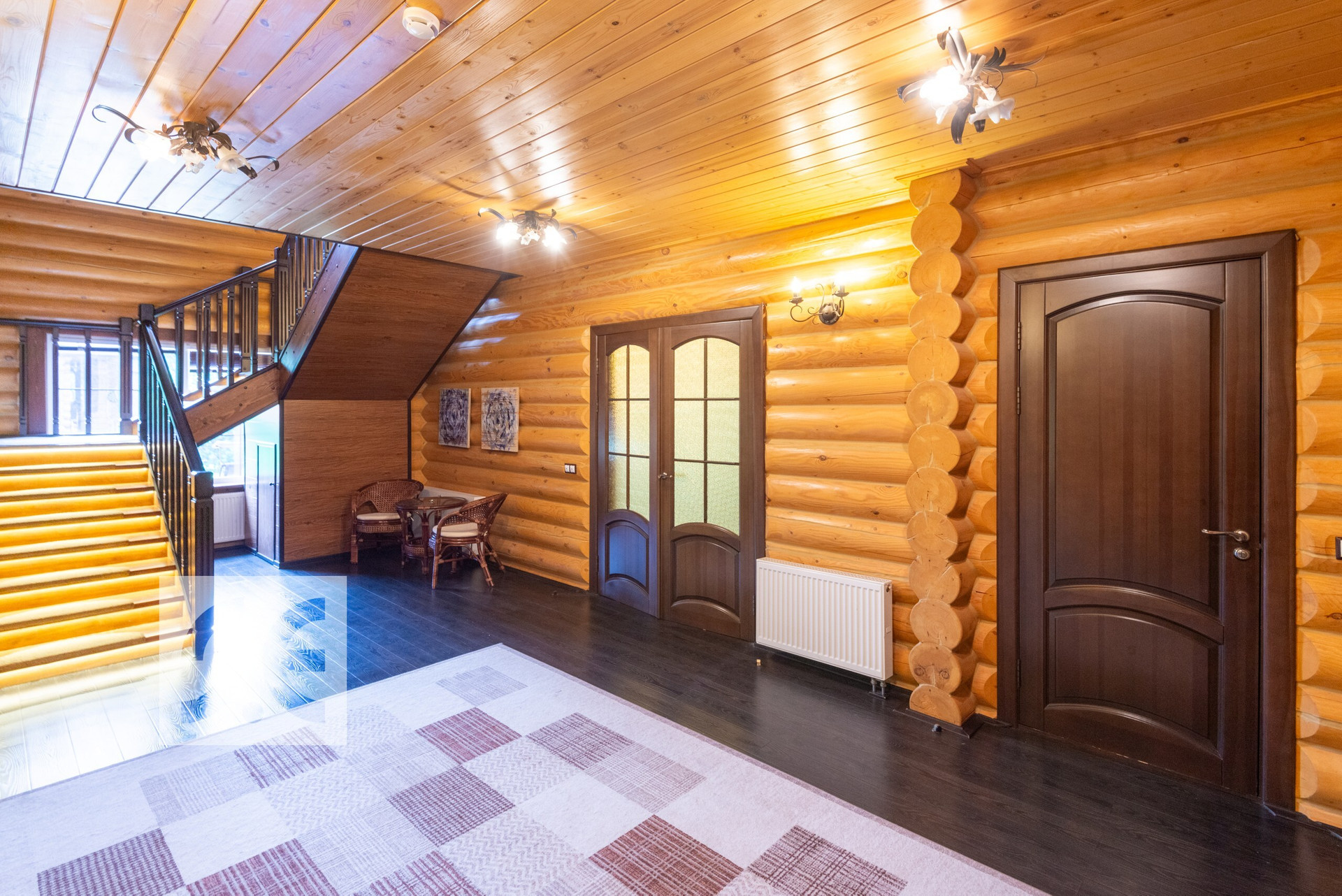 Дом собран из цилиндрованного бревна хвойных пород, d 26 см. площадью 294 м2 с пристройкой и террасами в стиле шале. В доме два этажа, пять спален (в среднем по 20 м2), гостиная и кабинет (43 и 40 м2), гардеробная, кухня (20 м2), библиотека, просторные холлы, два камина, терраса, три балкона. Дом имеет капитальную пристройку (навес), где спокойно могут поместиться два автомобиля любого размера.