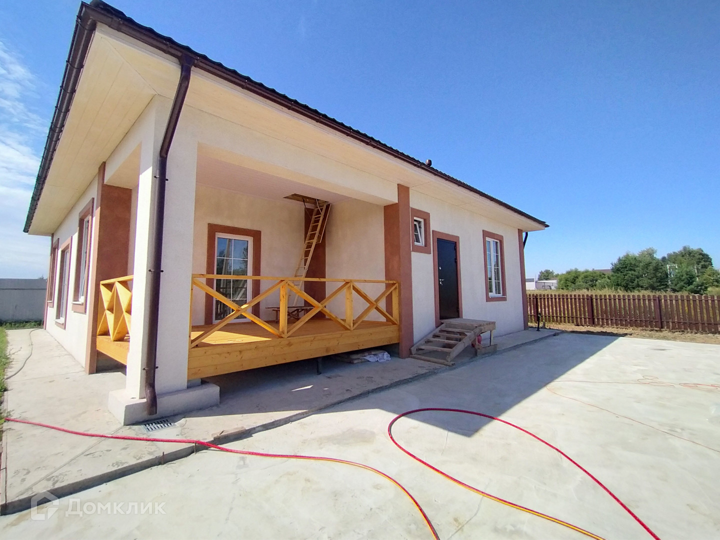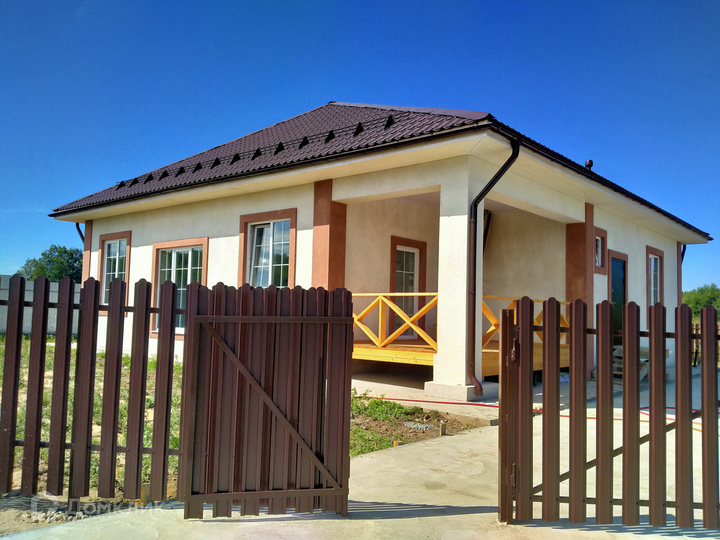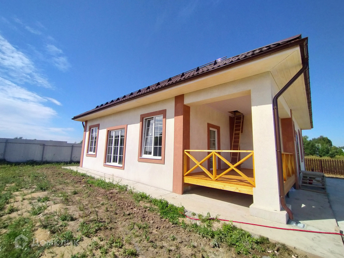 Дом  1 этаж, из газобетонных блоков на монолитной плите, под  чистовую отделку. Выполнена отделка фасада мраморной крошкой. Крыша из металлочерепицы.   Окна Rehau, водосточная система.