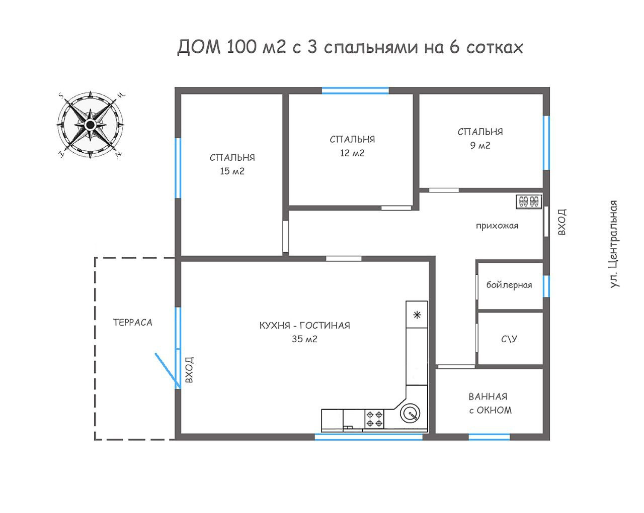 3 СПАЛЬНИ, КУХНЯ-ГОСТИНАЯ 35 м2 с выходом на террасу, БОЙЛЕРНАЯ, ВАННАЯ с окном, с\у, ПРИХОЖАЯ.