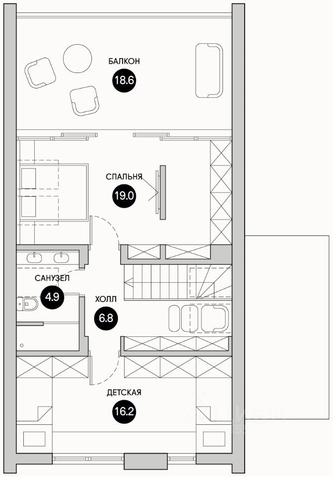 На втором этаже две спальни 16,2м2 и 19м2, холл и с/у.