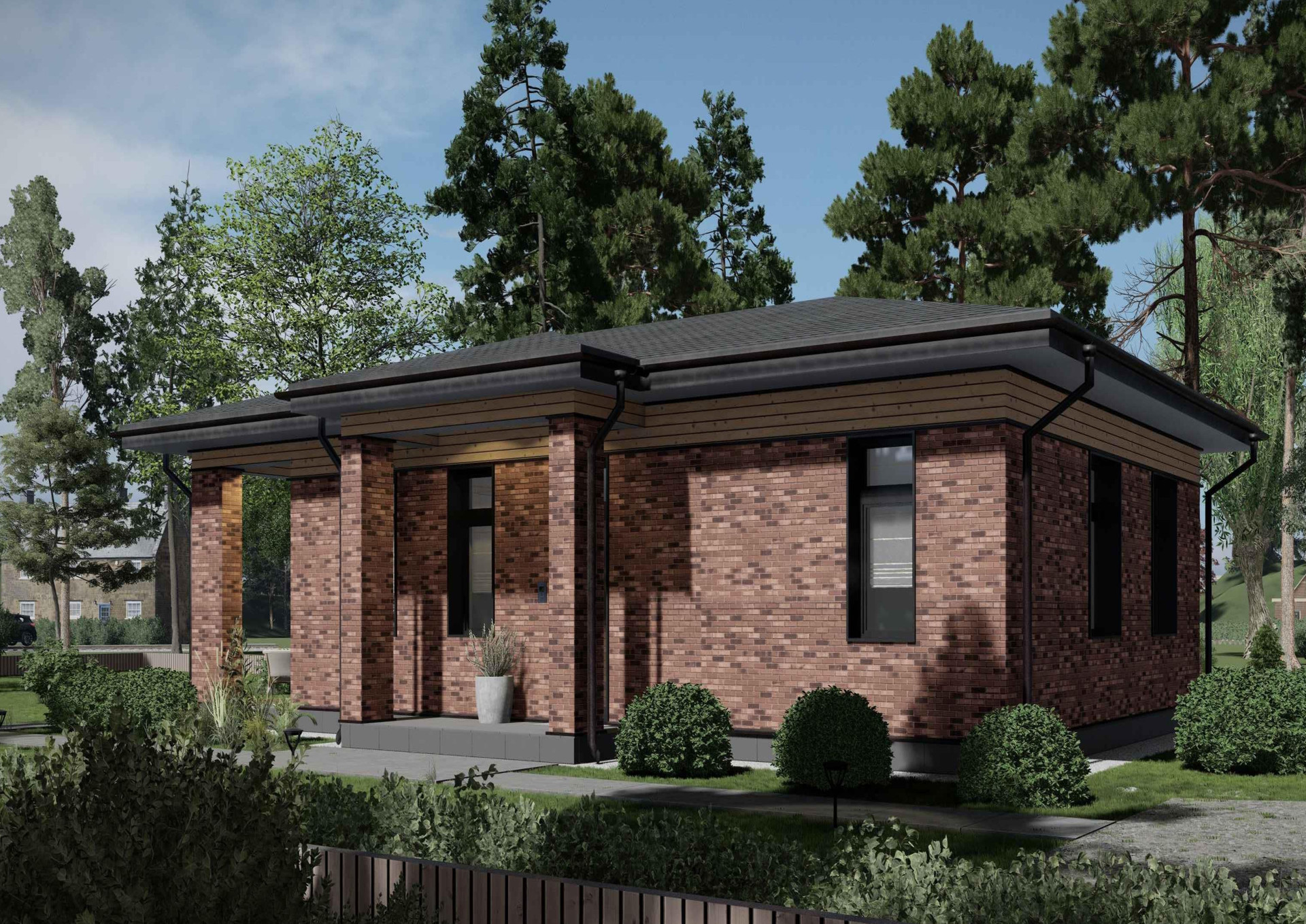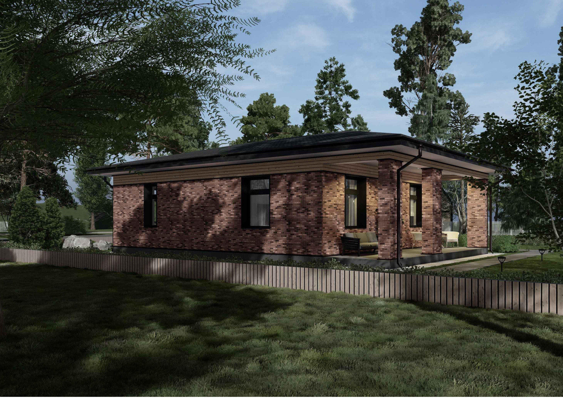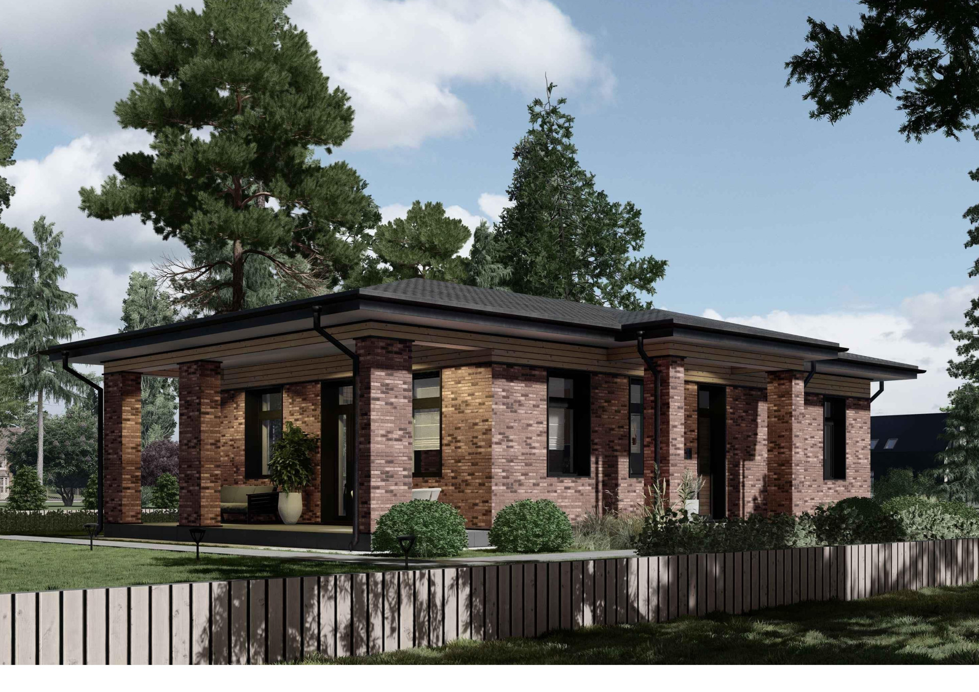 Данный проект идеально подойдет для жизни семьи, ведь одноэтажность дома делает его максимального безопасным для юркой малышни и возрастных родителей. Удобный выход на улицу через террасу, большая площадь остекления, лаконично вписывает дом, в природный ландшафт позволяя вам в полном объеме насладиться красотой окружающего мира.