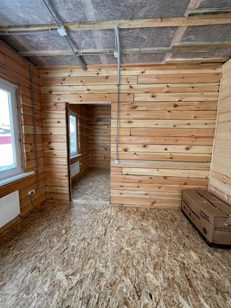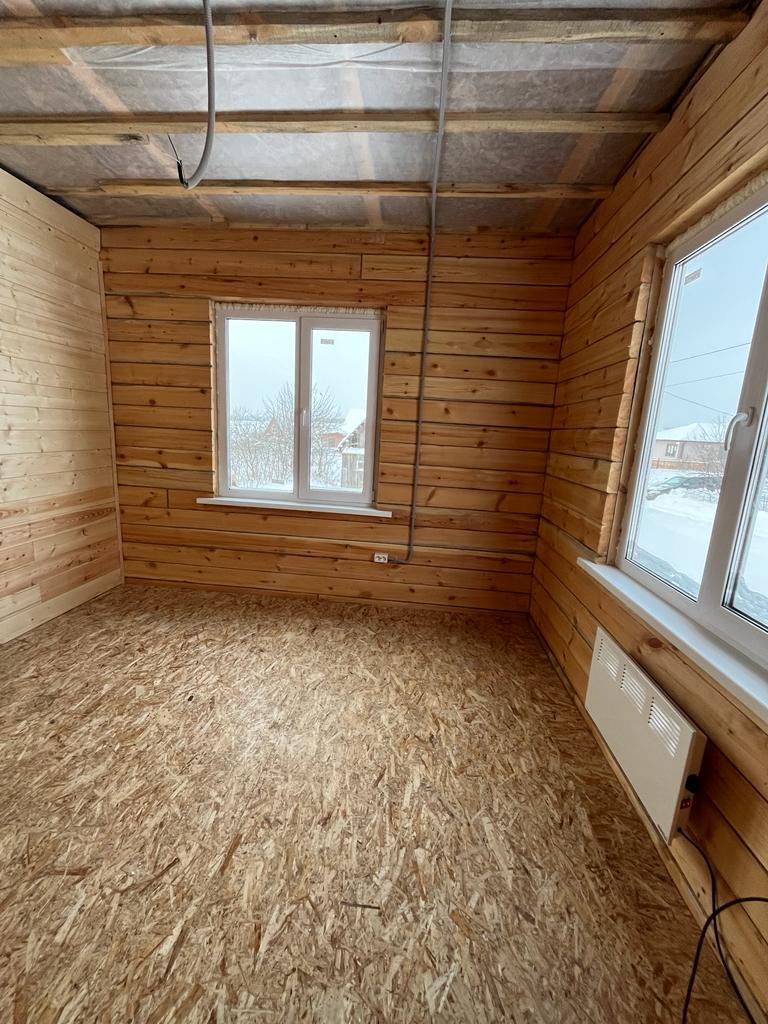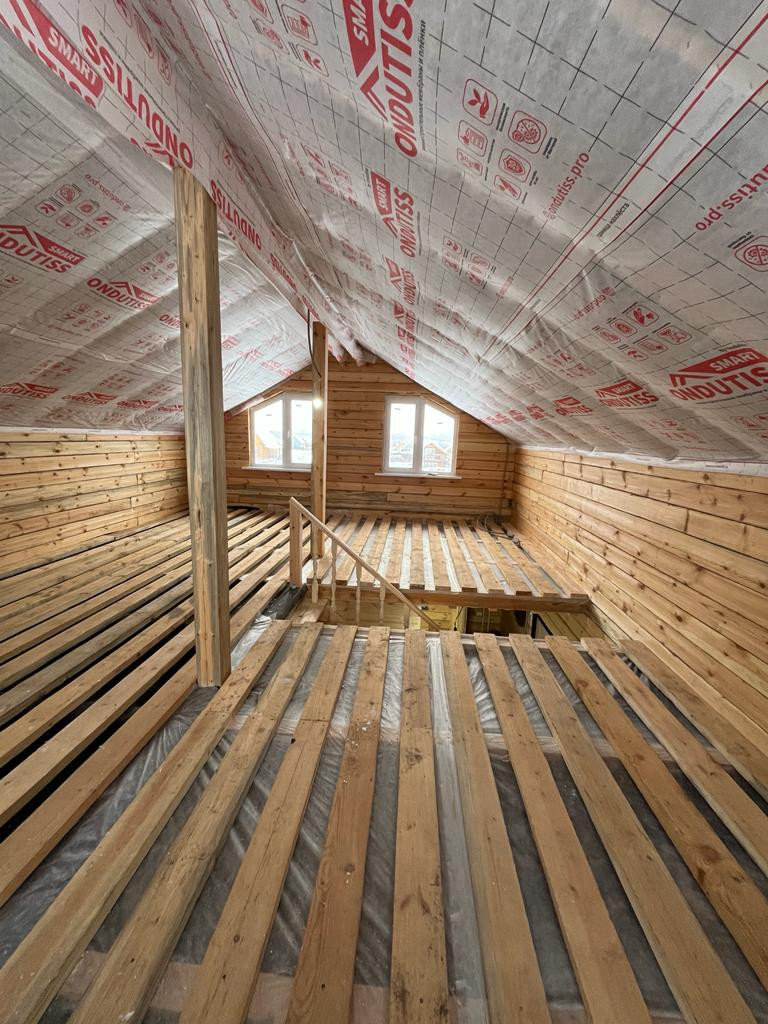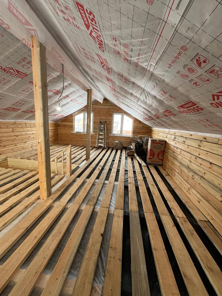 Полы, потолок, крыша: утеплены минеральной ватой Knauf, толщина утеплителя 200 мм, 100 мм и 150 мм соответственно.