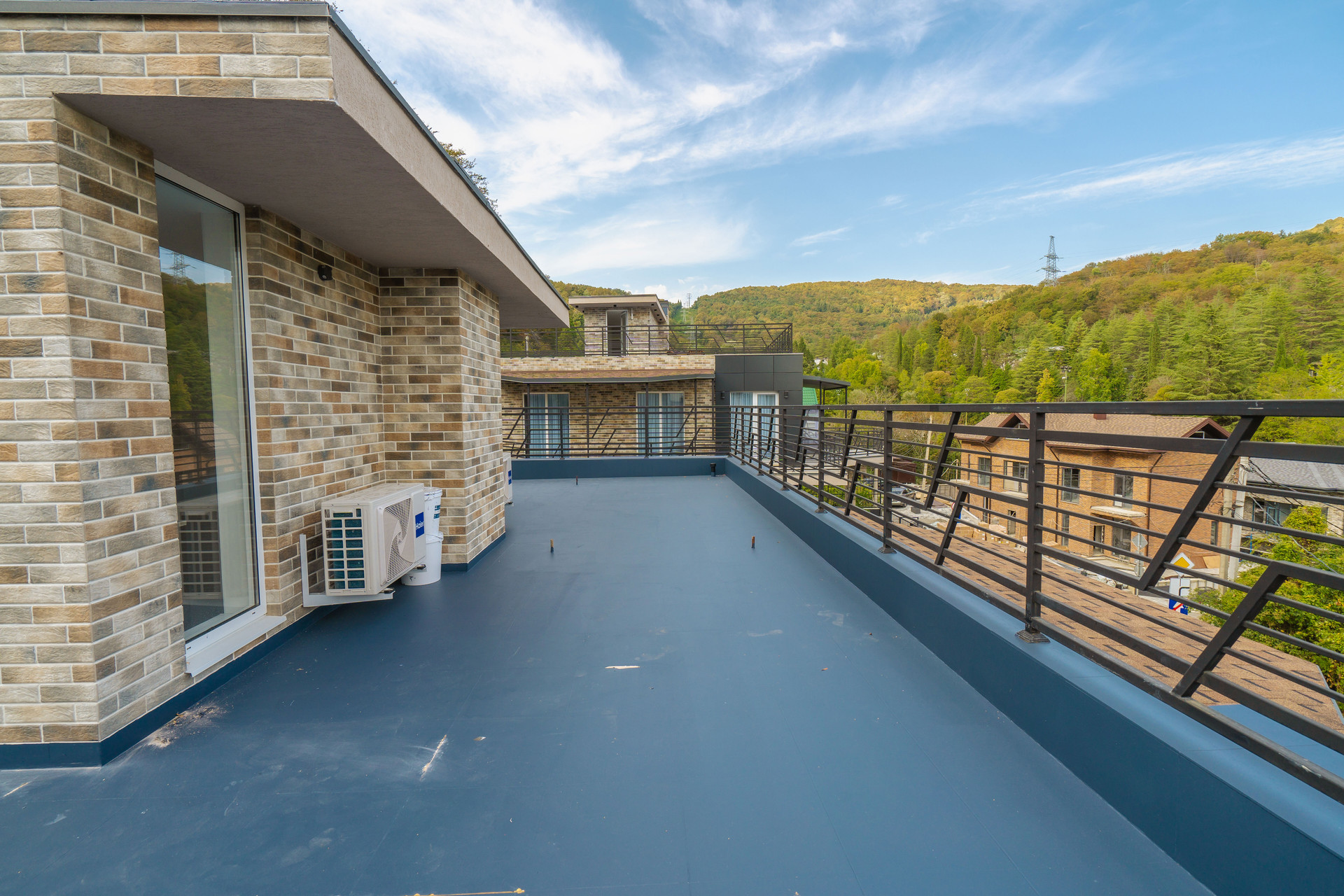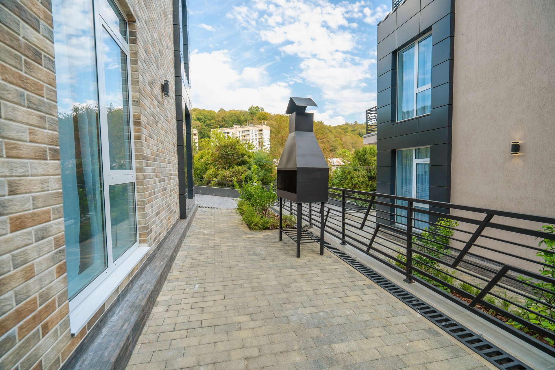 Территория комплекса закрытая и включает в себя бассейн с комфортными зонами для отдыха и сауну.
