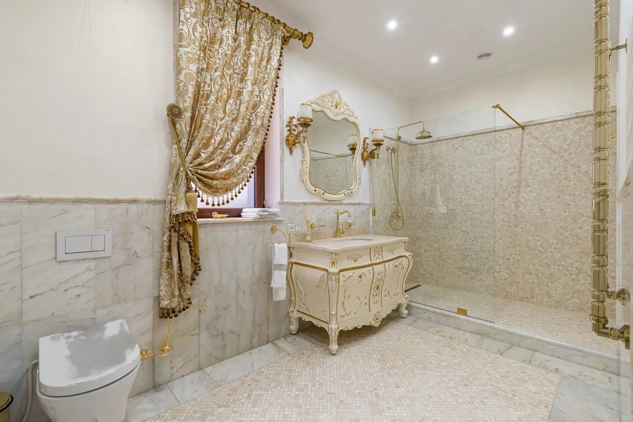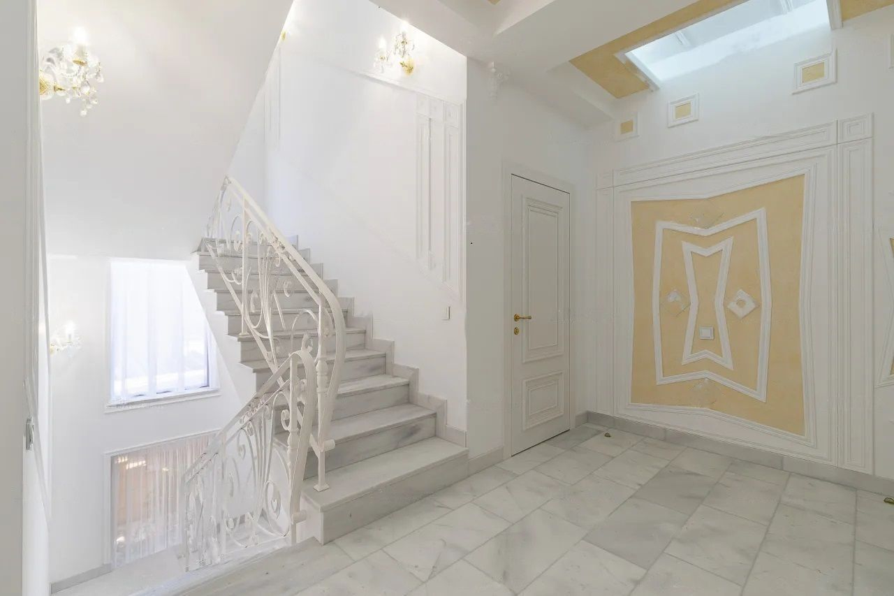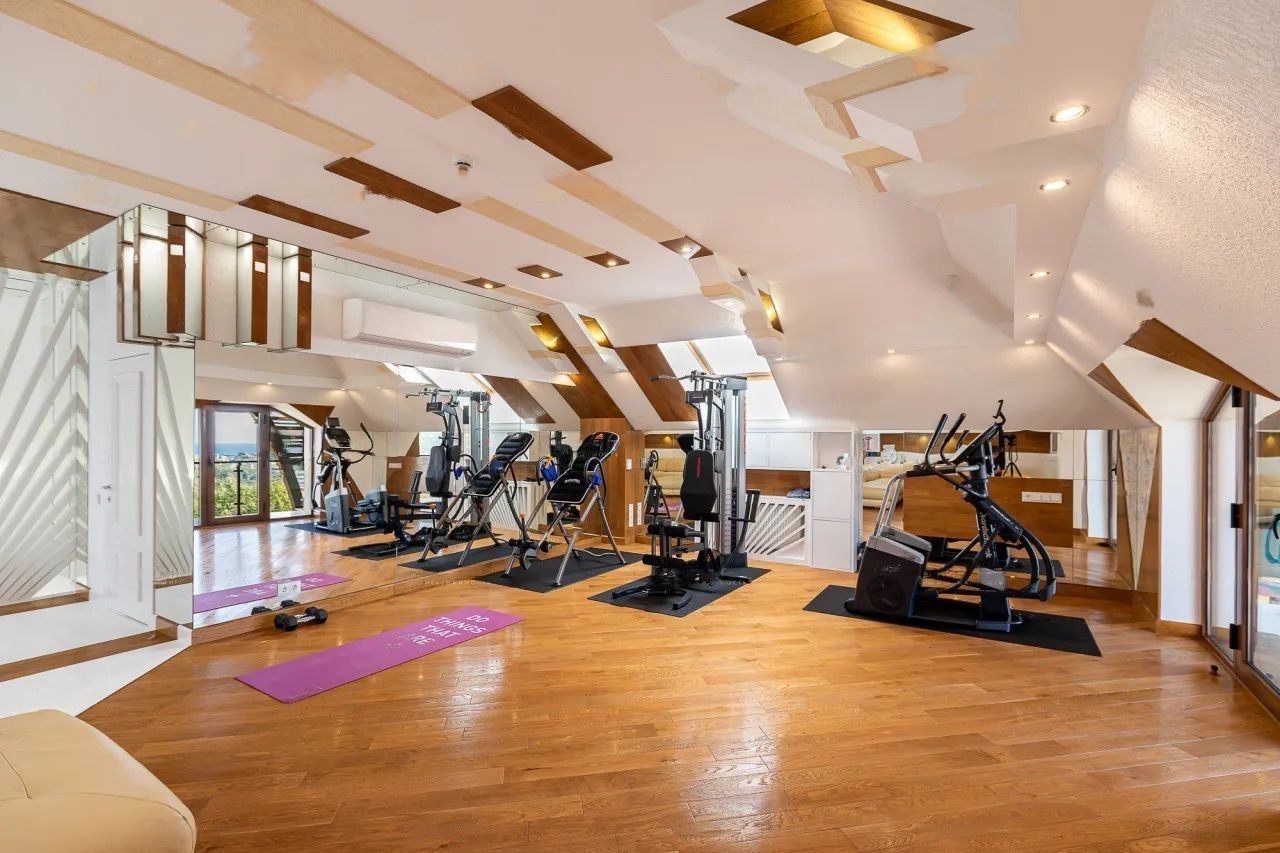 Площадь дома составляет 390 квадратных метров. В цоколе есть отдельная квартира, которую можно использовать как гостевые апартаменты или же отдать ее под размещение обслуживающего персонала – горничных, охраны. Также на участке есть отдельная баня с гостевым домом, собственный тренажерный зал.