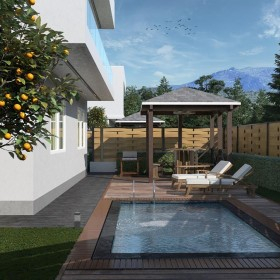 Дом на участке 4 сотки, на территории будет выполнено озеленение, так же круглогодичный подогреваемый бассейн и зона для отдыха (беседка).