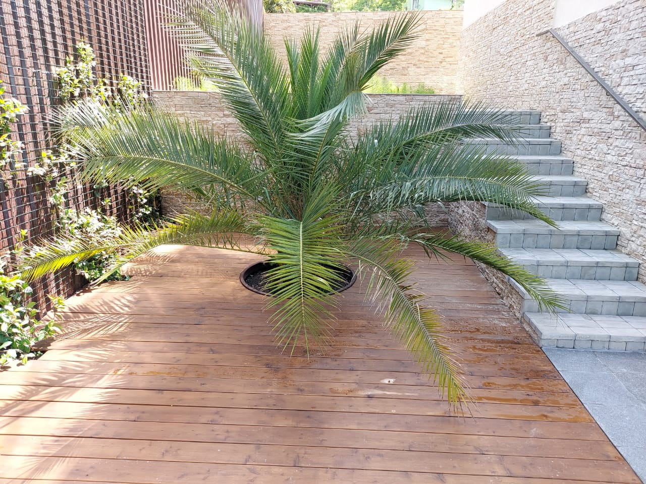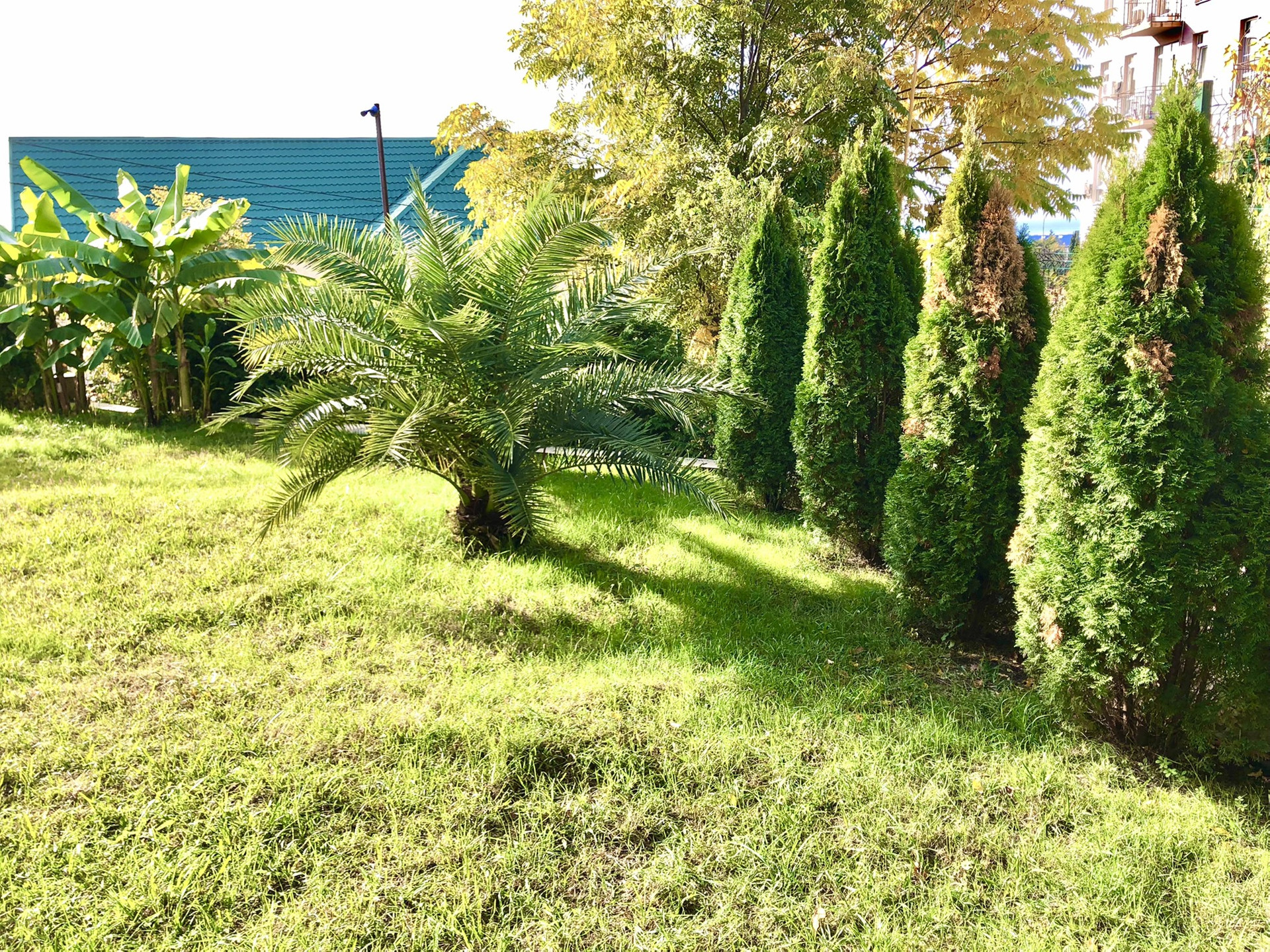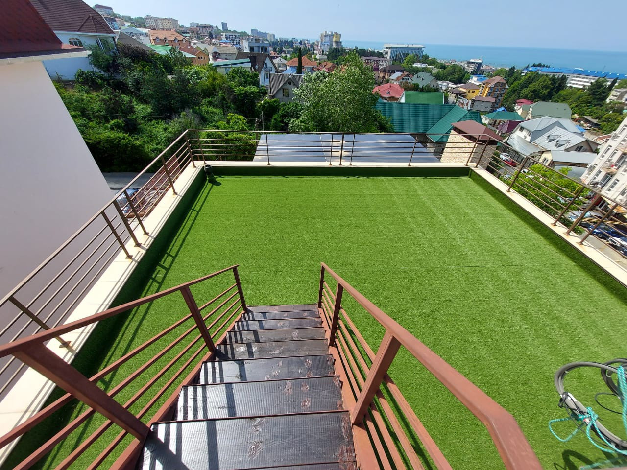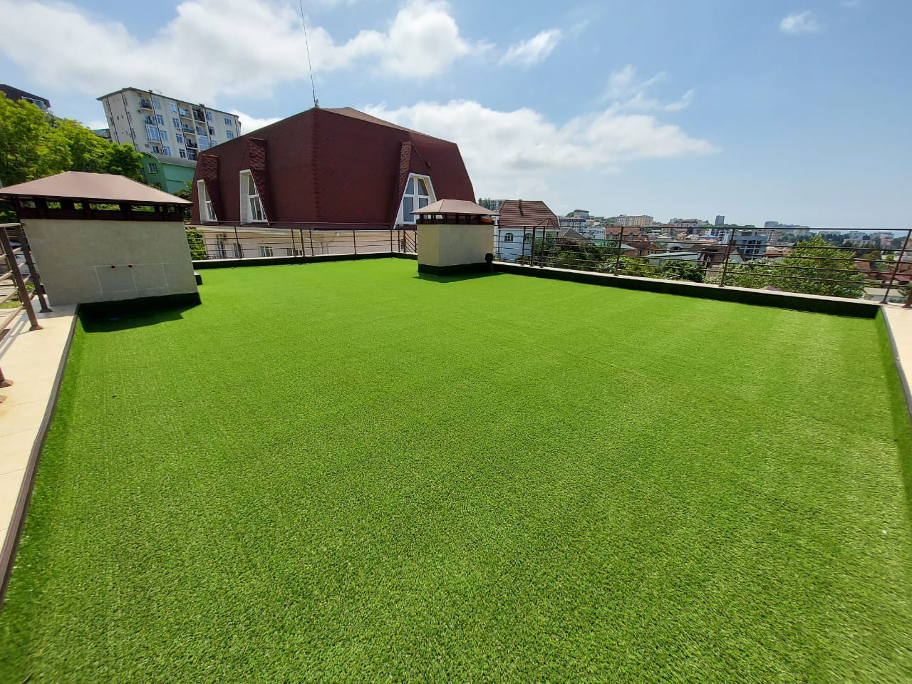 Эксплуатируемая кровля с искусственным газоном и лаунж зоной.
