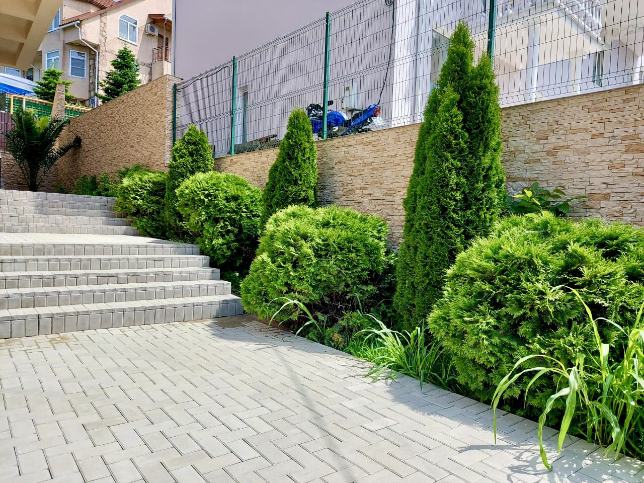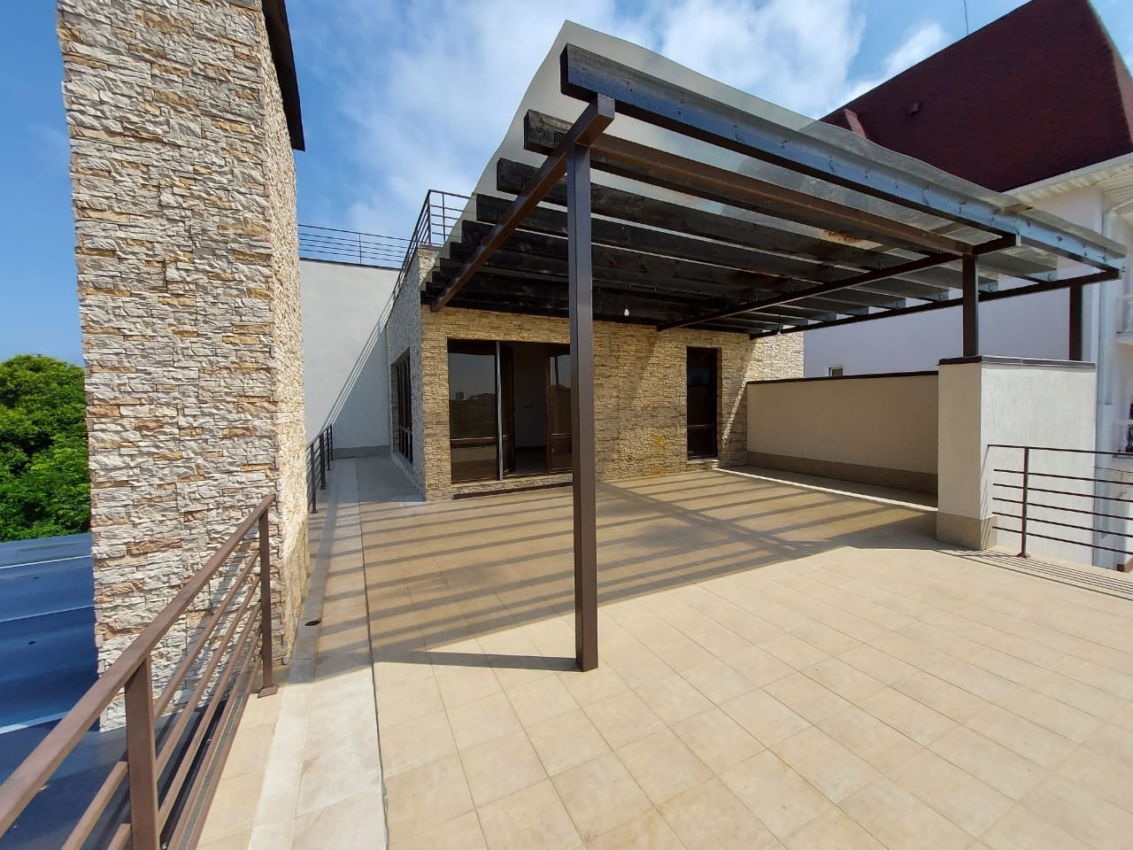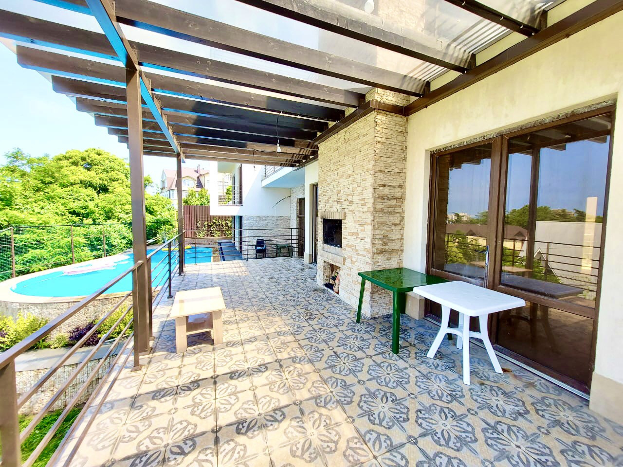 На территории имеется место под летнюю кухню с зоной для барбекю, а также парковка на 4 авто.