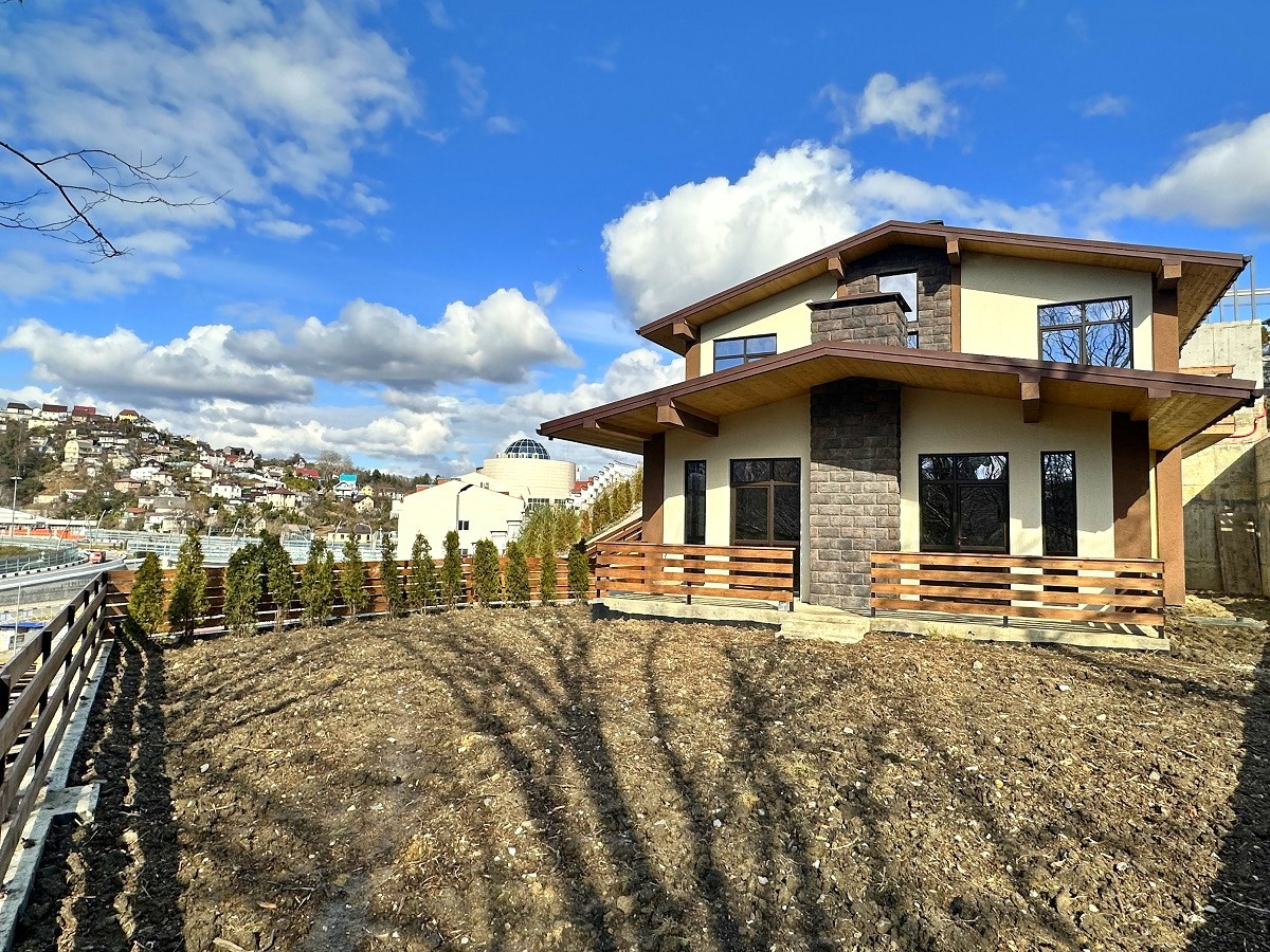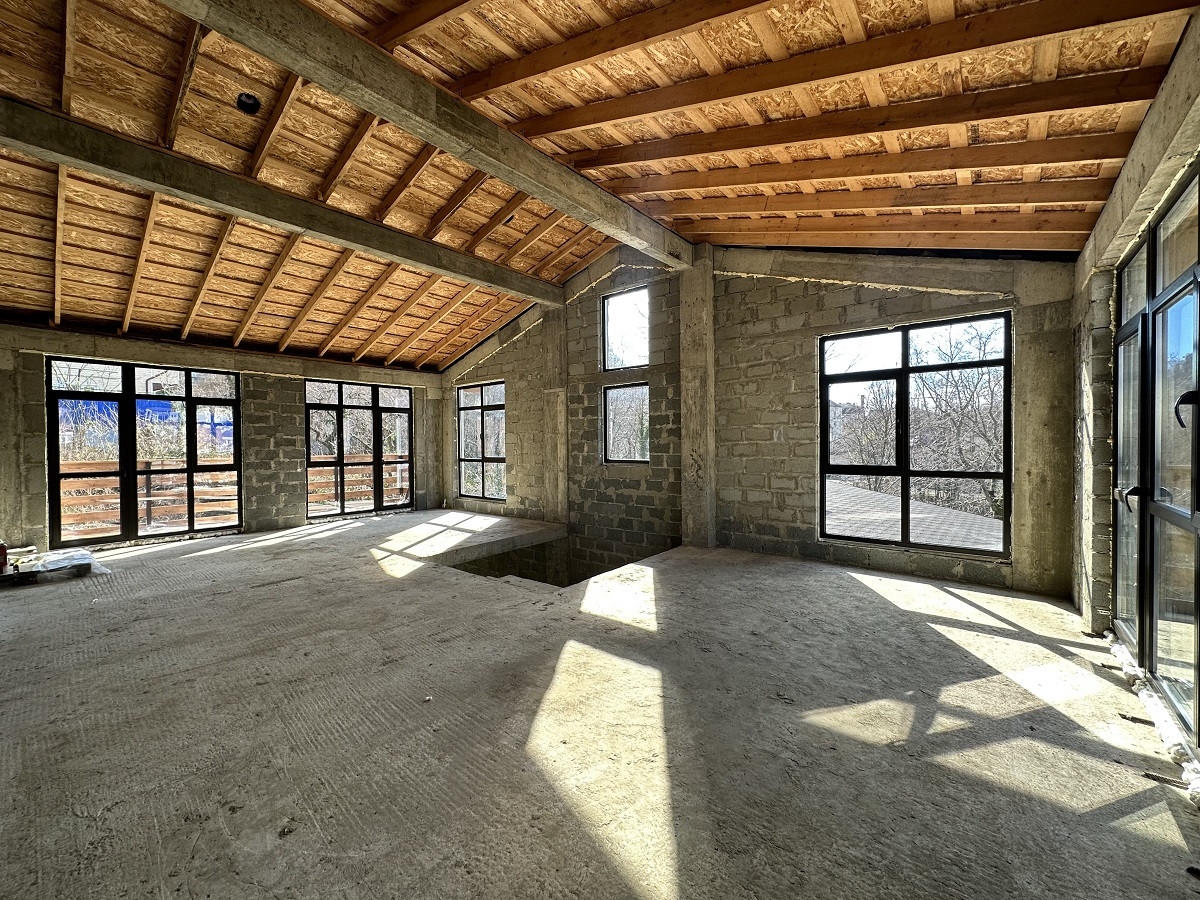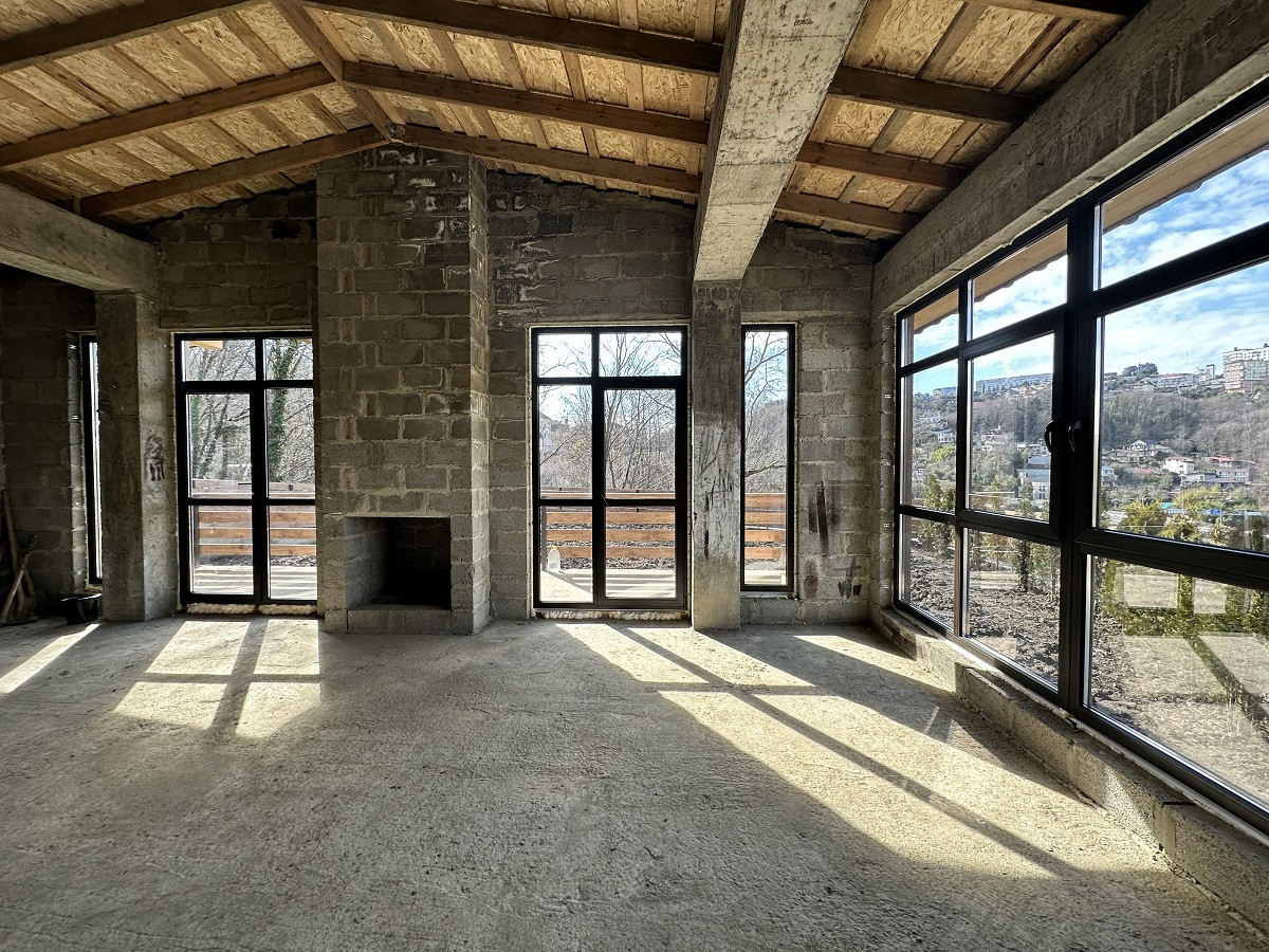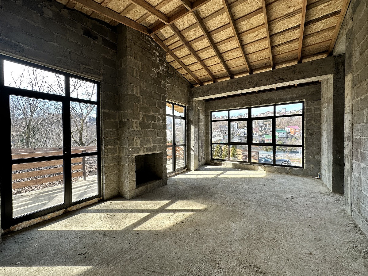 Площадь дома 170 кв.м.,  без внутренней отделки, что позволит выполнить дизайн интерьера на Ваш вкус. На первом этаже планируется просторная кухня-гостиная, ванная комната, спальня, каминный зал с выходом на террасу. Второй этаж - 3 спальни, гардеробная, санузел и балконы. Благодаря рациональному  расположению окон все помещения светлые и просторные. С балкона открывается красивый вид на горные вершины и жилой массив.