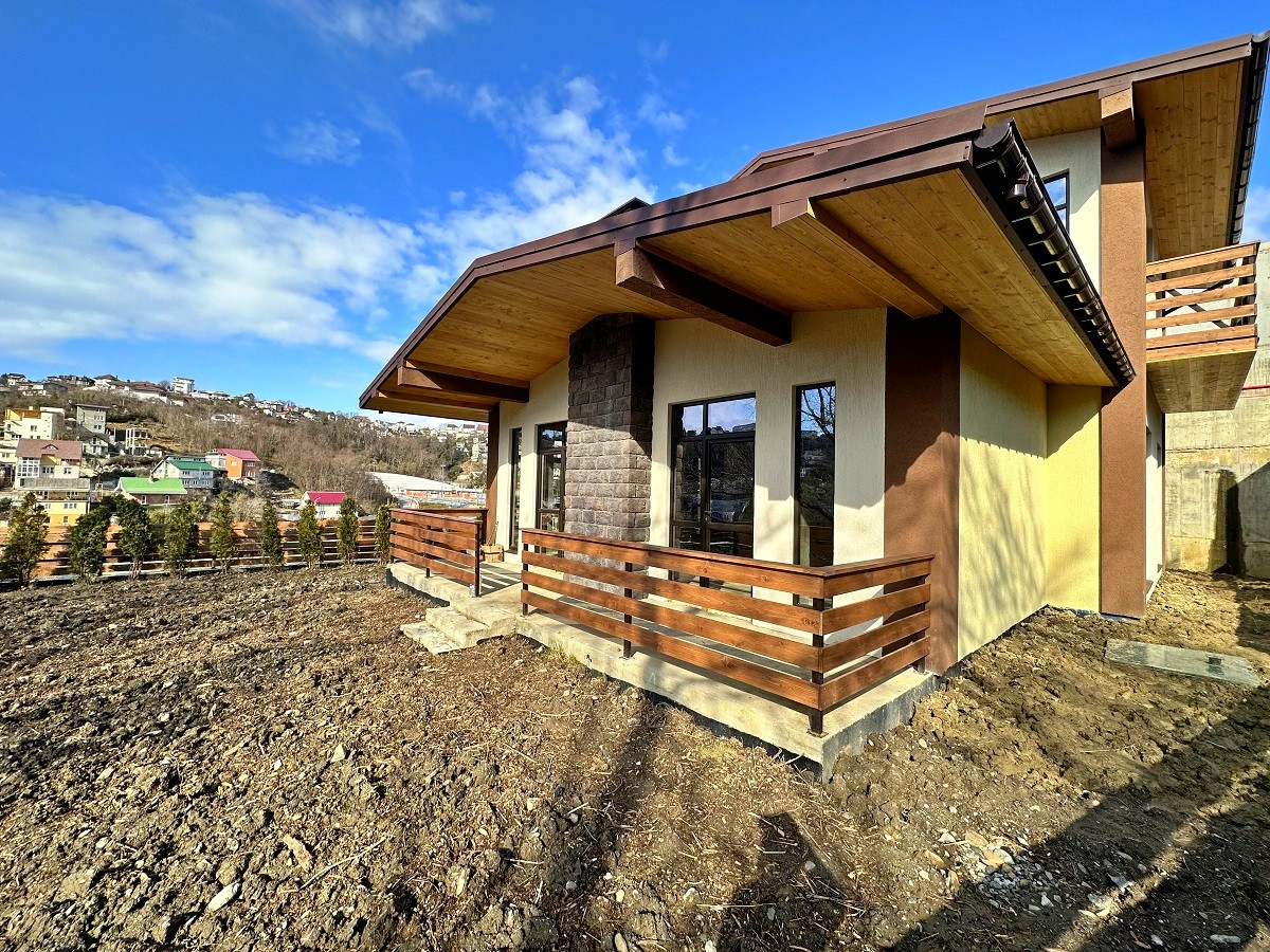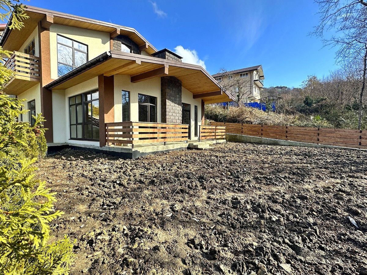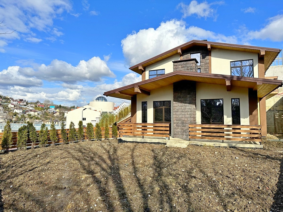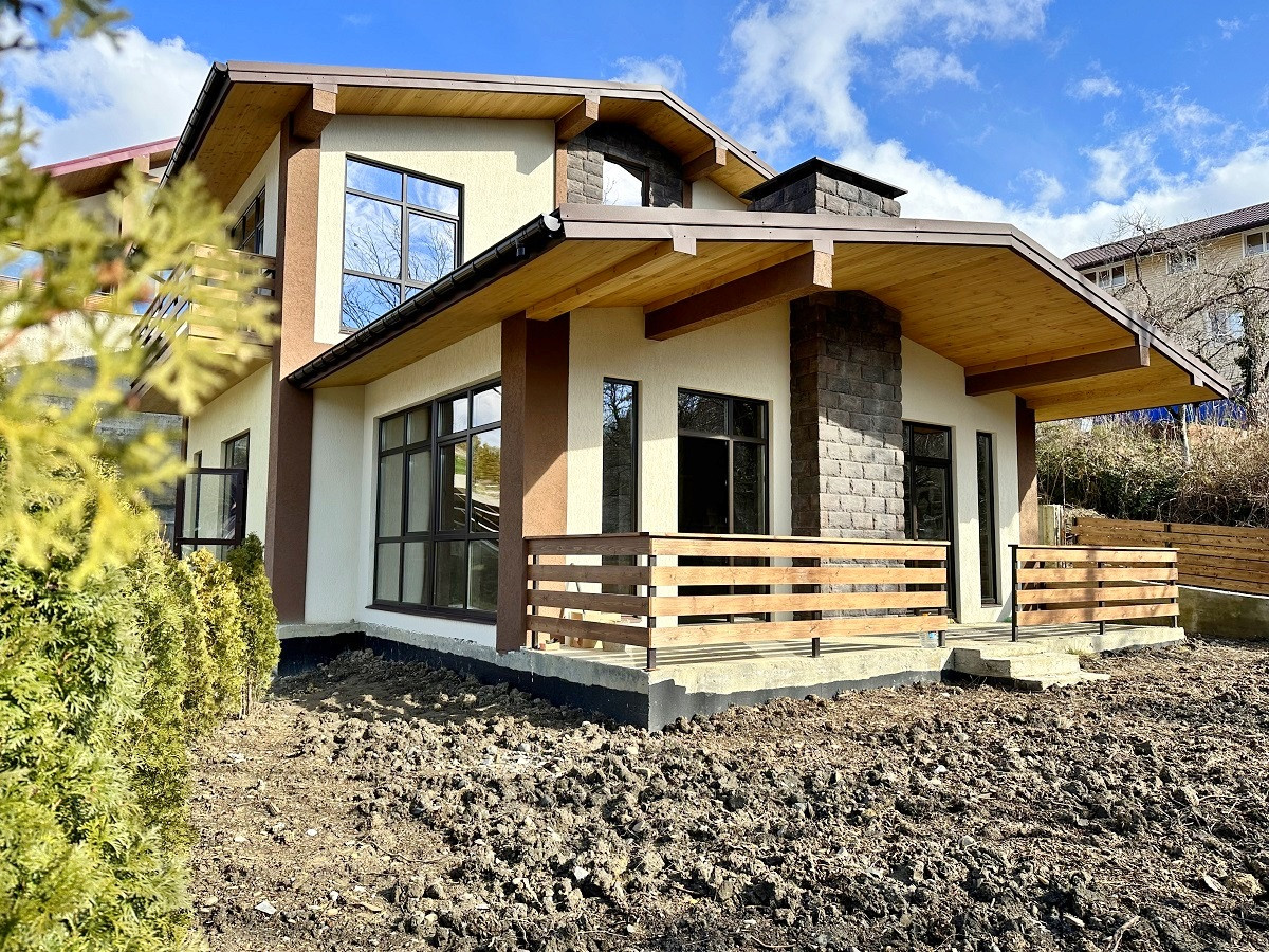 Площадь дома 170 кв.м.,  без внутренней отделки, что позволит выполнить дизайн интерьера на Ваш вкус. На первом этаже планируется просторная кухня-гостиная, ванная комната, спальня, каминный зал с выходом на террасу. Второй этаж - 3 спальни, гардеробная, санузел и балконы. Благодаря рациональному  расположению окон все помещения светлые и просторные. С балкона открывается красивый вид на горные вершины и жилой массив.