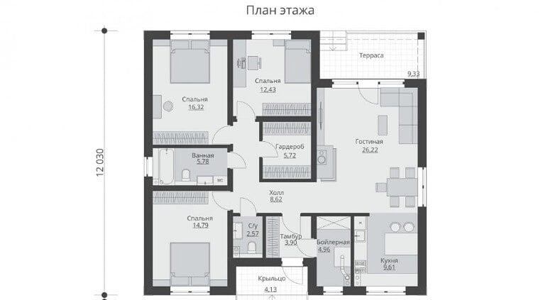 Тамбур - 3,90 м2С/у - 2,57 м2Спальня - 14,79 м2Ванная - 5,78 м2Спальня - 16,32 м2Спальня - 12,43 м2Гардероб - 5,72 м2Гостиная - 26,22 м2Кухня - 9,61 м2Бойлерная - 4,96 м2Холл - 8,62 м2