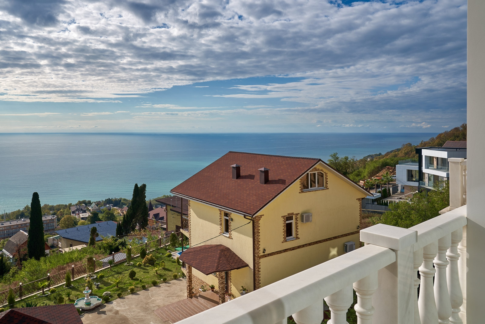 Просторная элитная резиденция с живописным видом на Черноморское побережье, находится в престижном коттеджном поселке, в Хостинском районе города Сочи.
