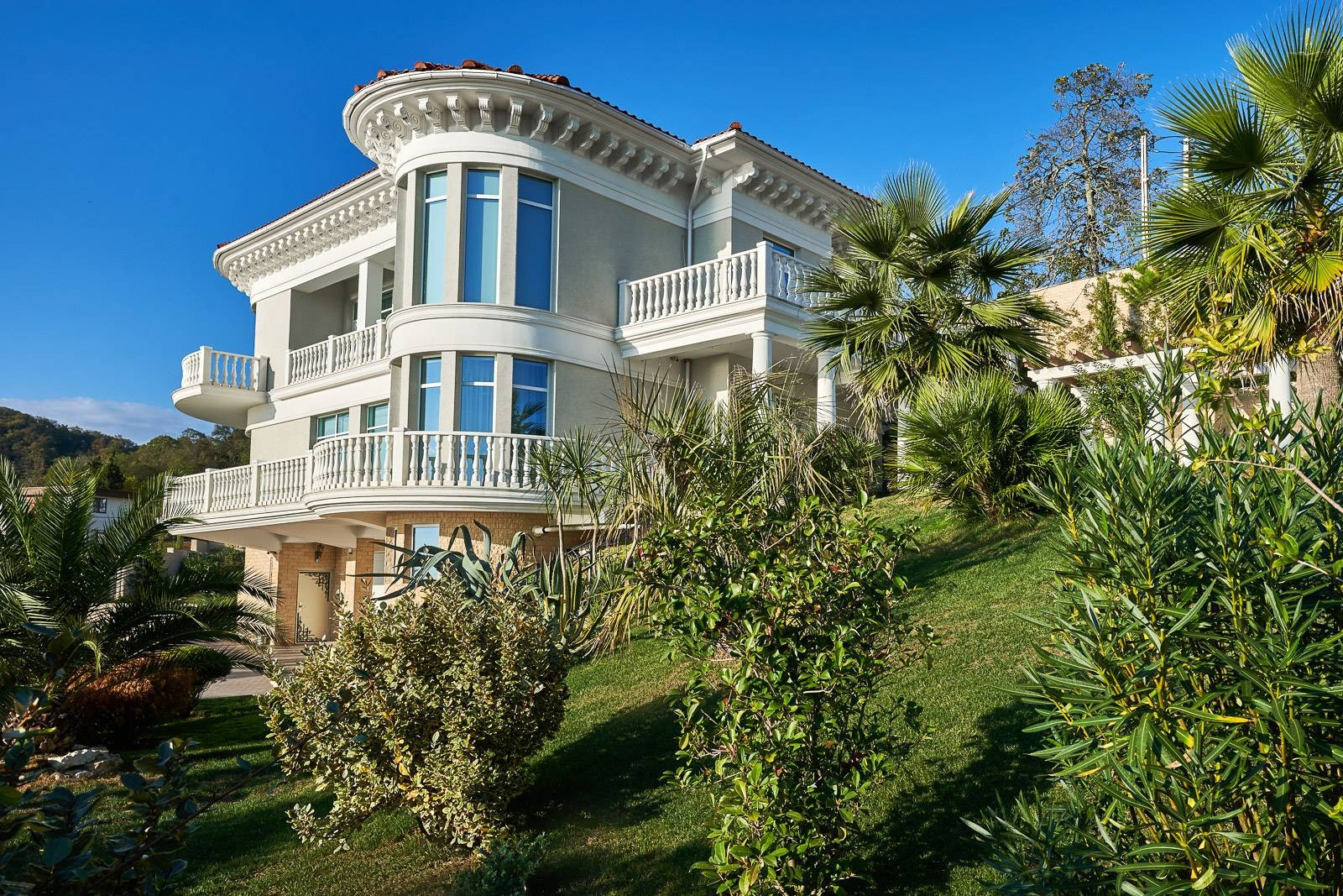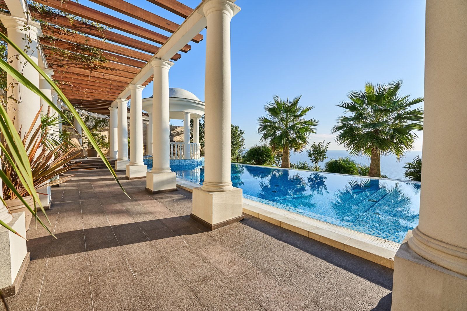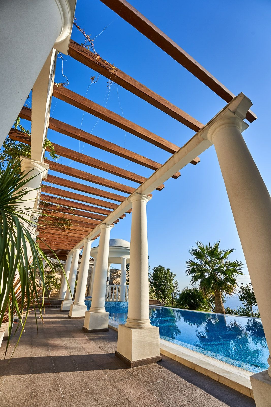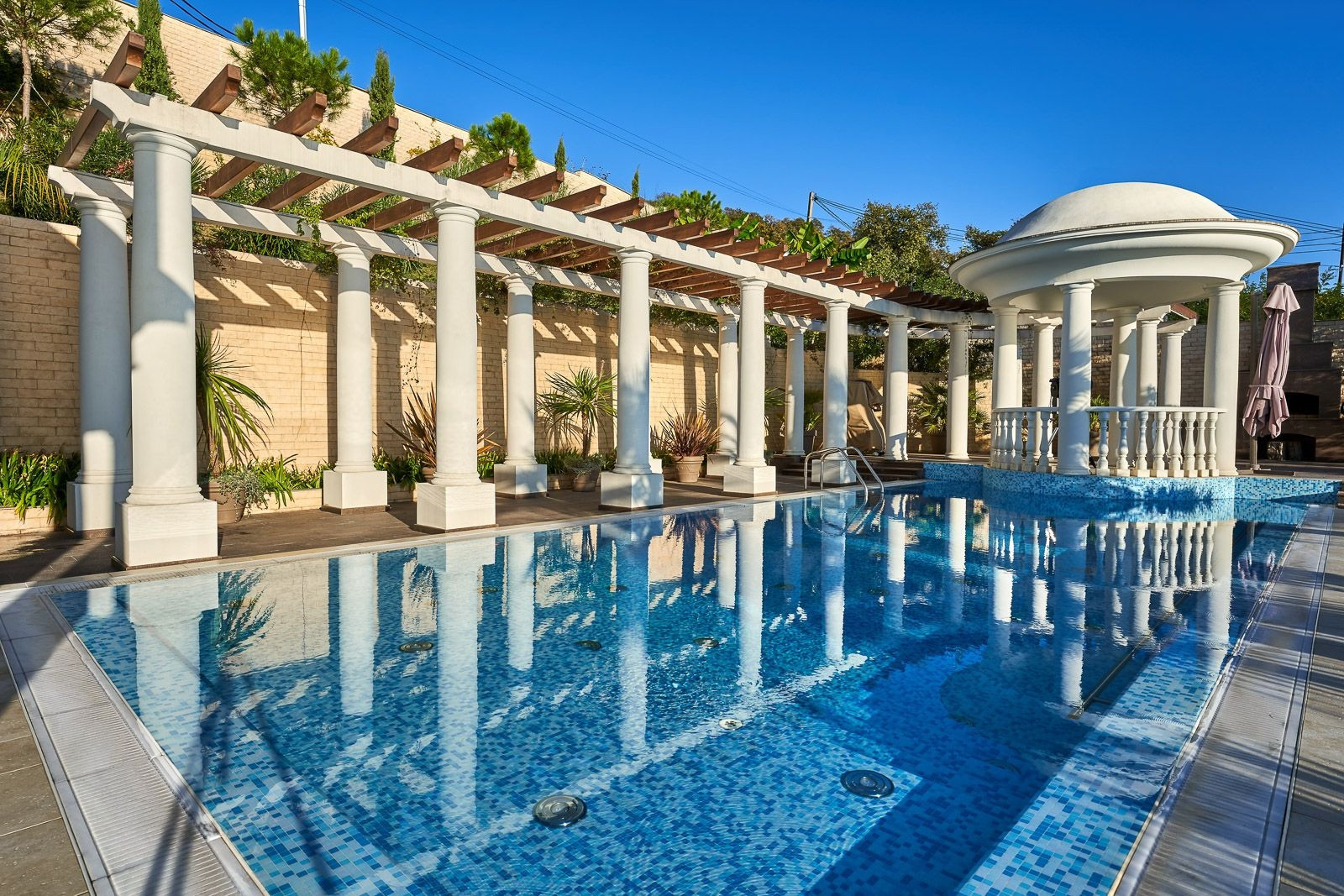 На территории участка располагается круглогодичный подогреваемый бассейн с зоной отдыха окруженной колоннадой и ландшафтным дизайном. Резиденция сочетает в себе классическую архитектуру с средиземноморским стилем, что привлекает внимание к деталям. Общая площадь земли 21 сотка.