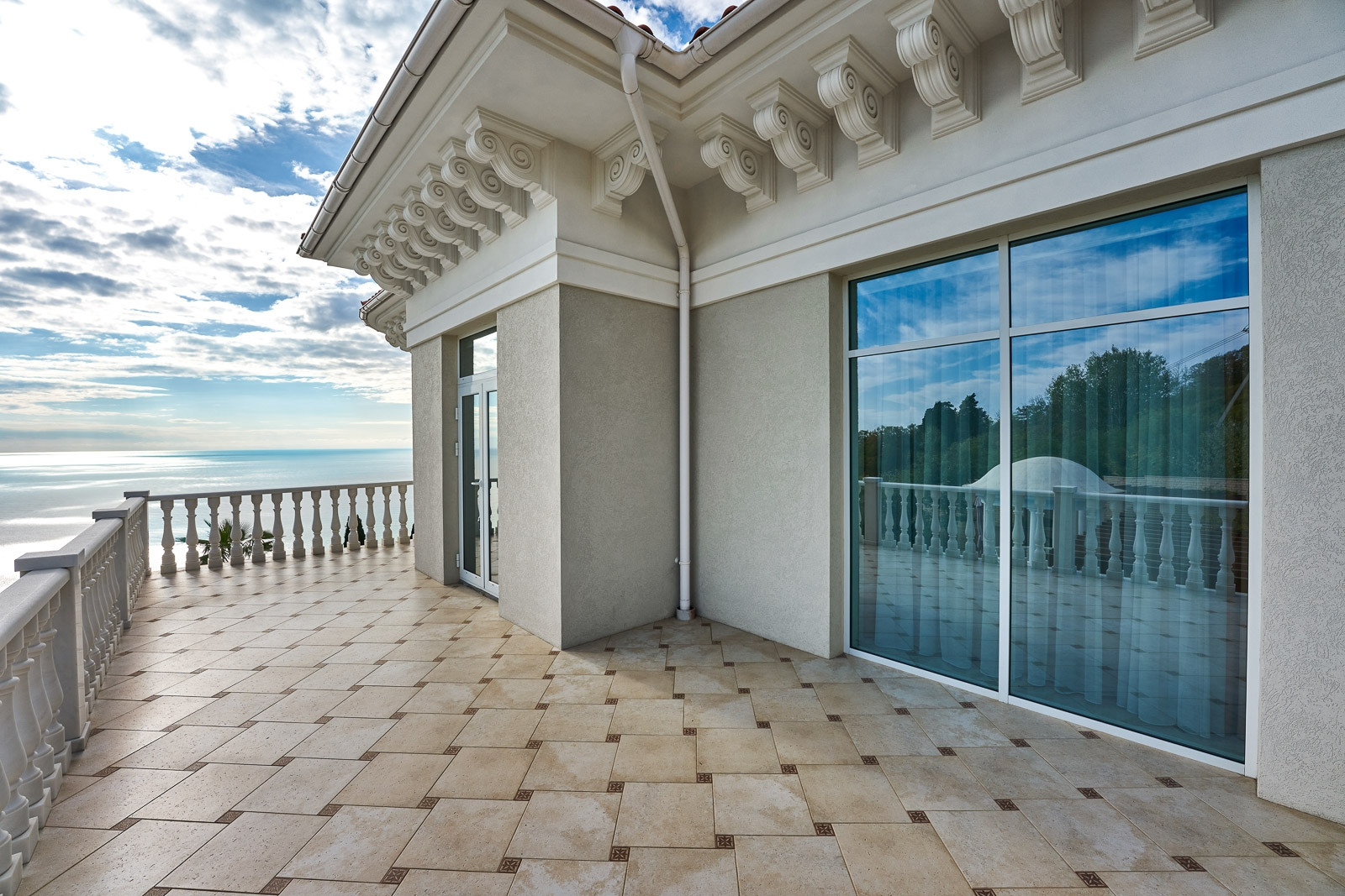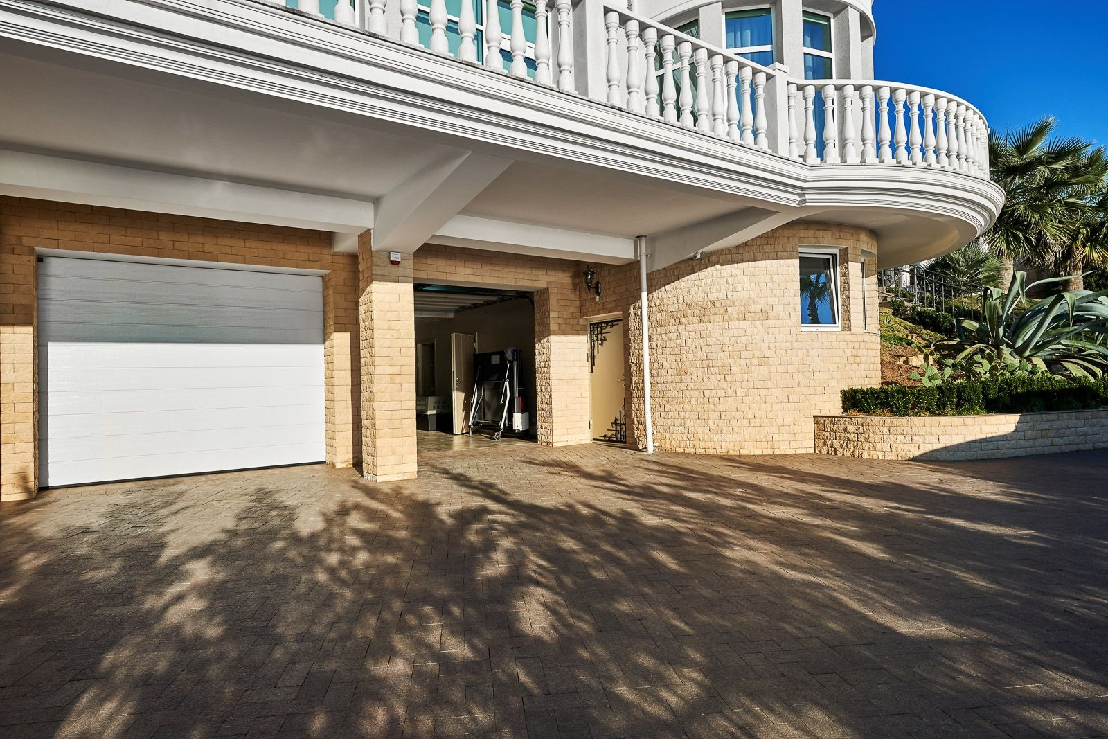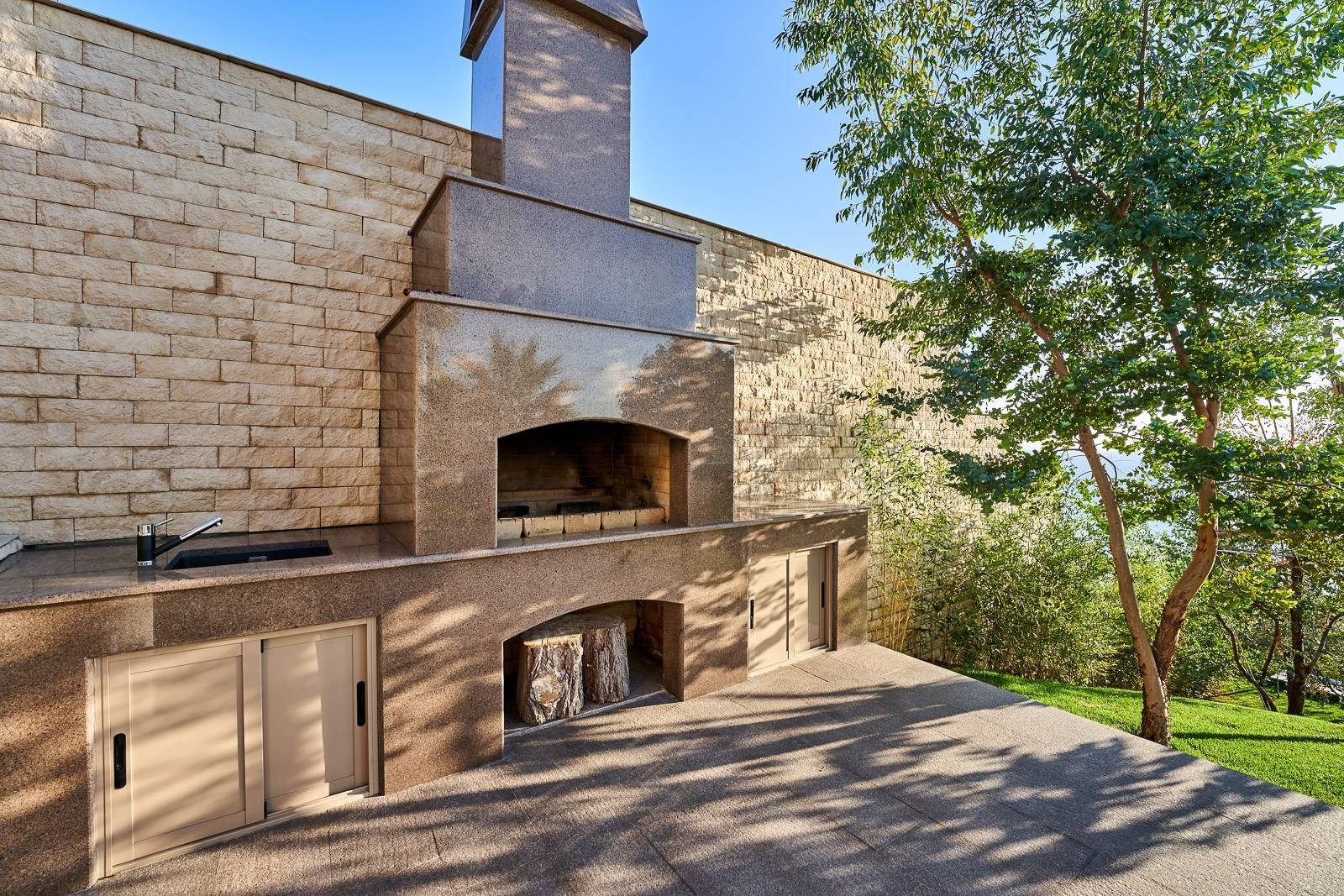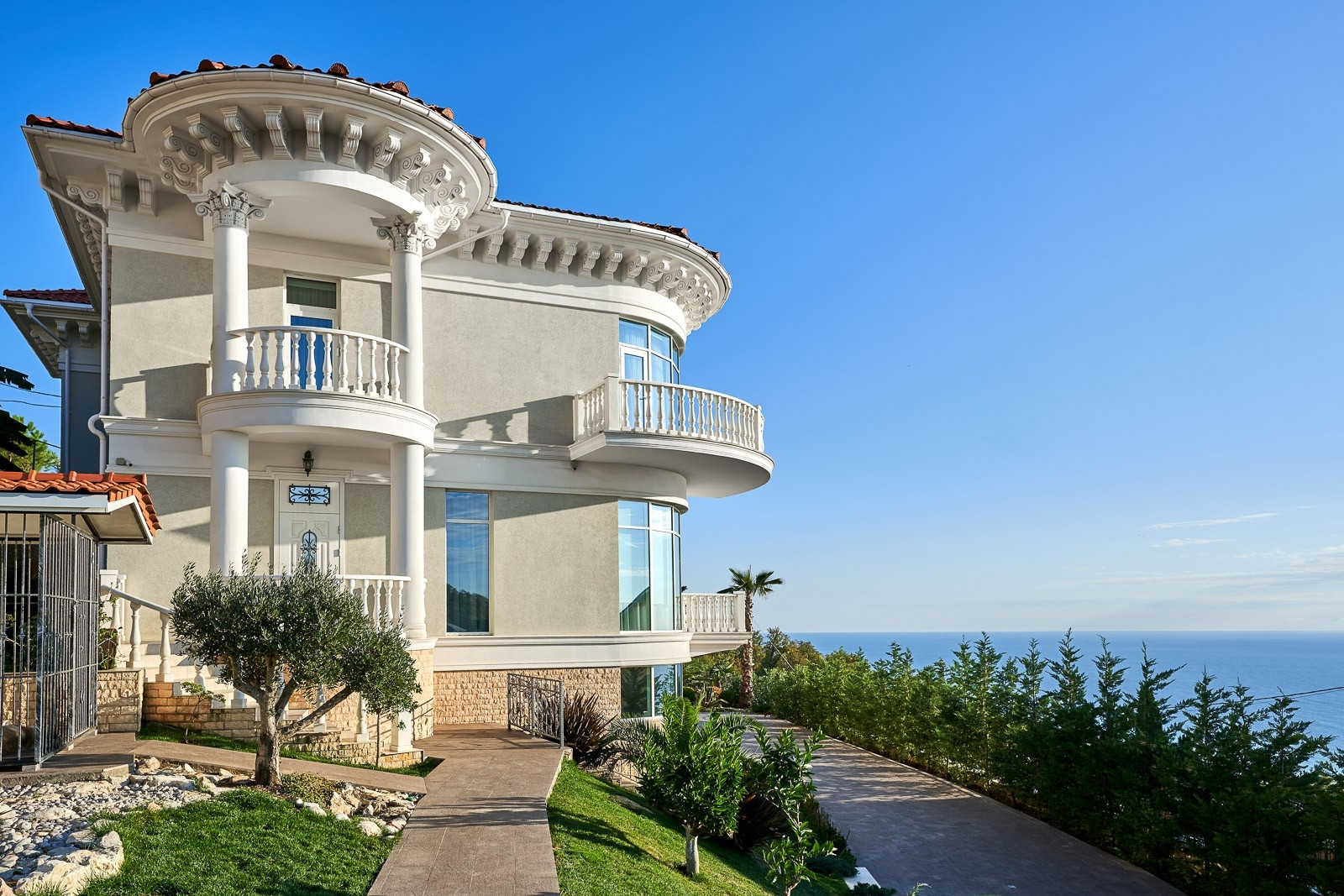 На территории участка располагается круглогодичный подогреваемый бассейн с зоной отдыха окруженной колоннадой и ландшафтным дизайном. Резиденция сочетает в себе классическую архитектуру с средиземноморским стилем, что привлекает внимание к деталям. Общая площадь земли 21 сотка.