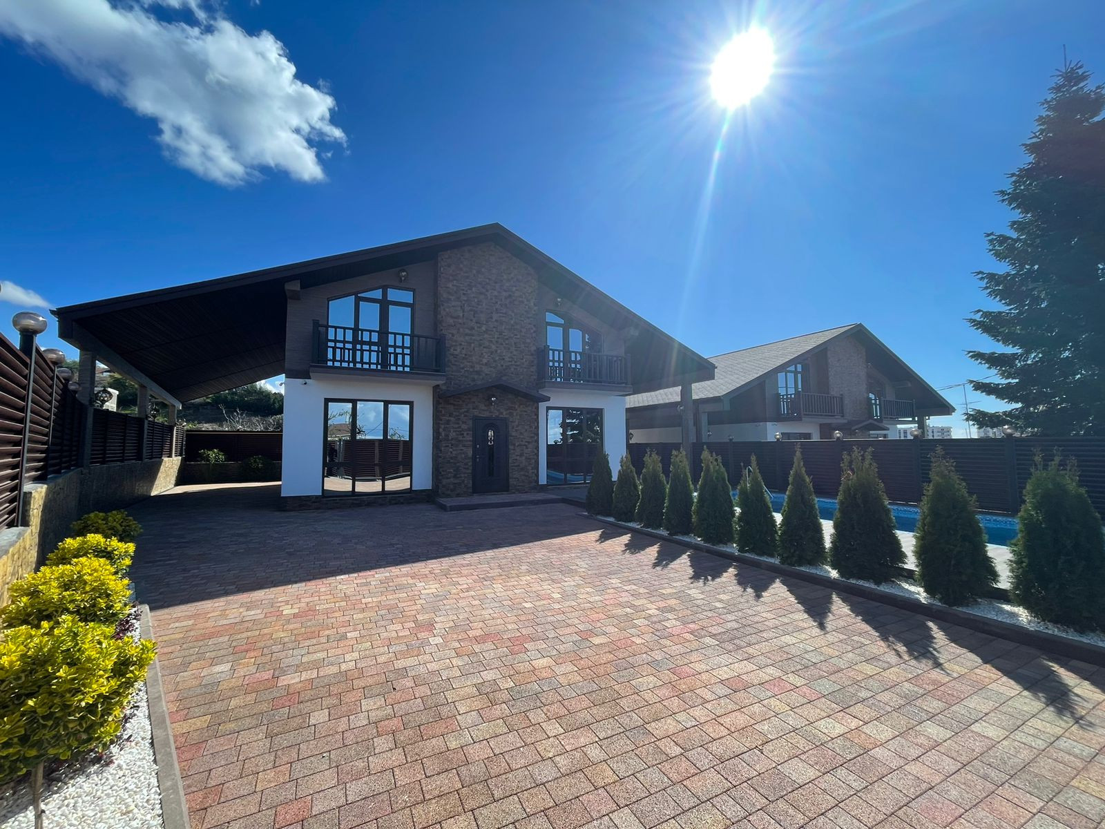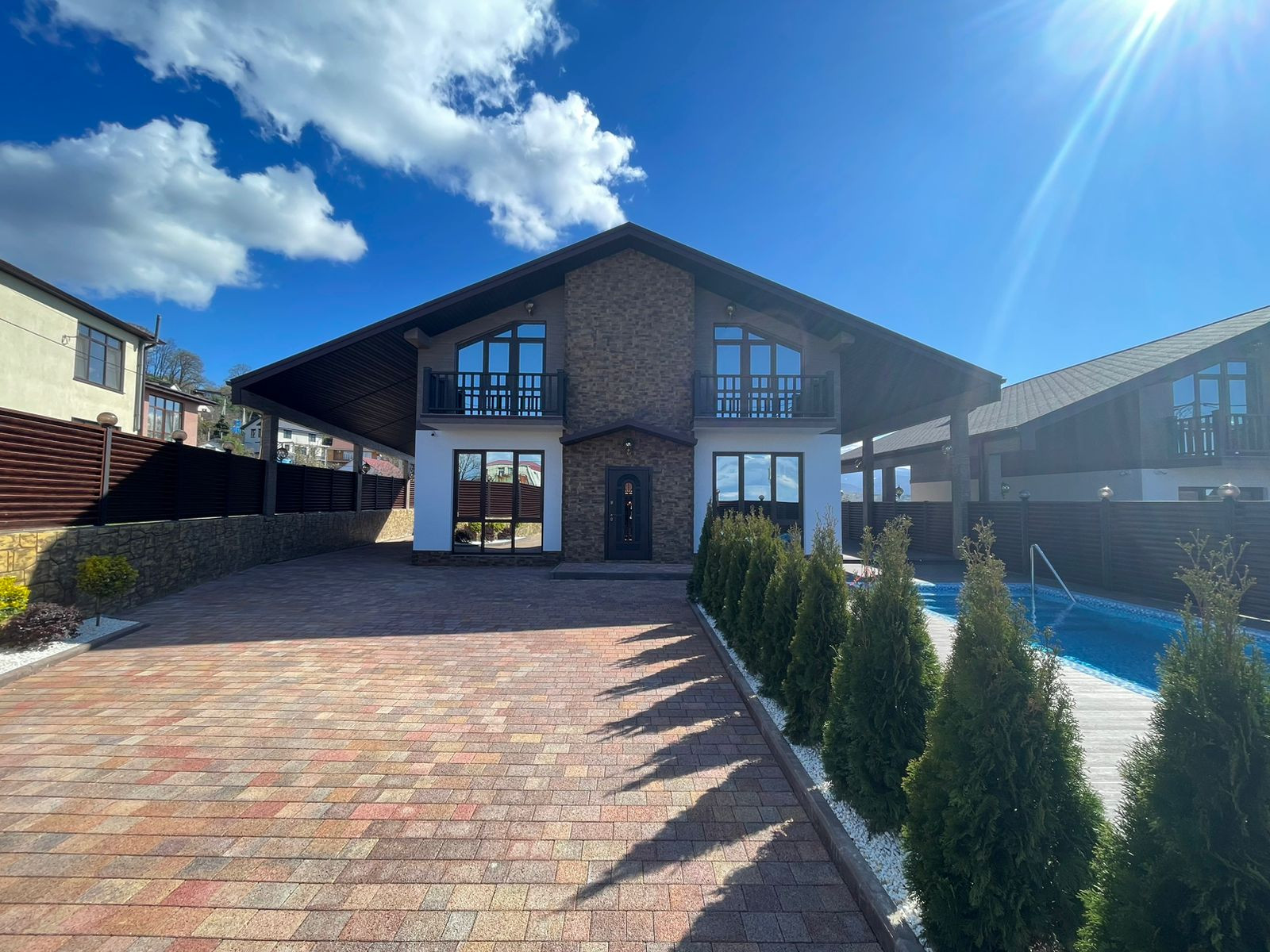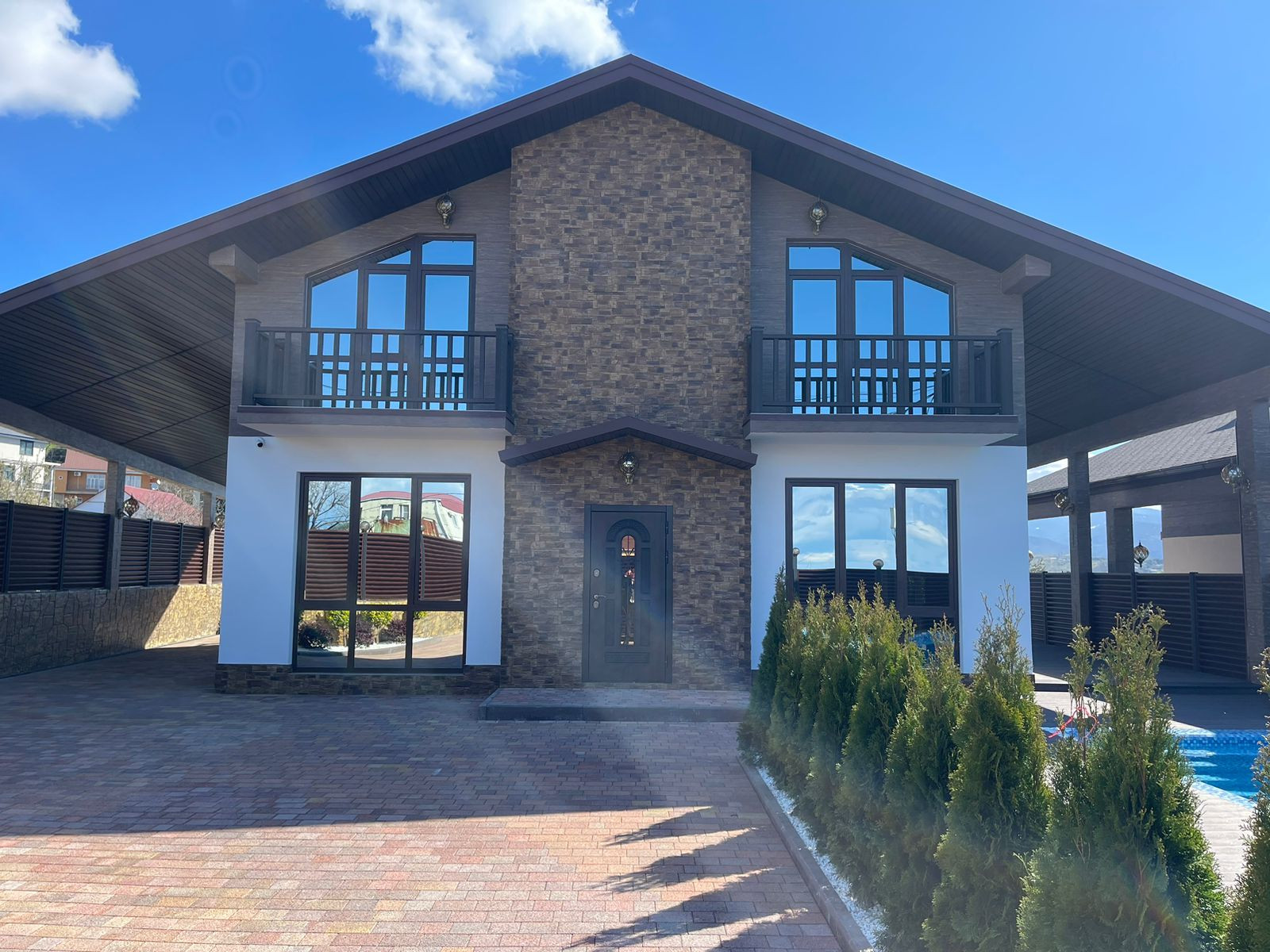 Дом построен в стиле шале! Имеется бассейн, отличный вид на горы и море!