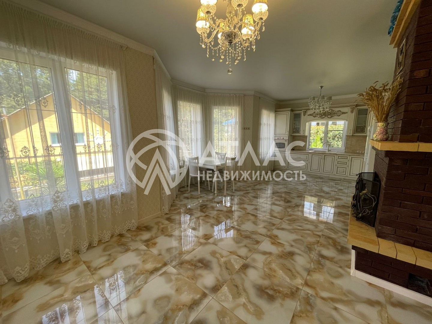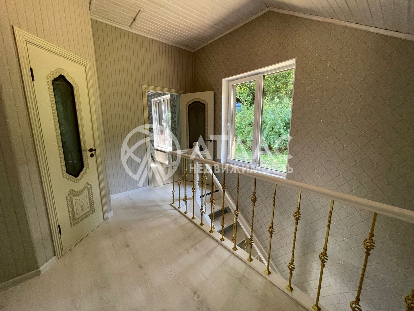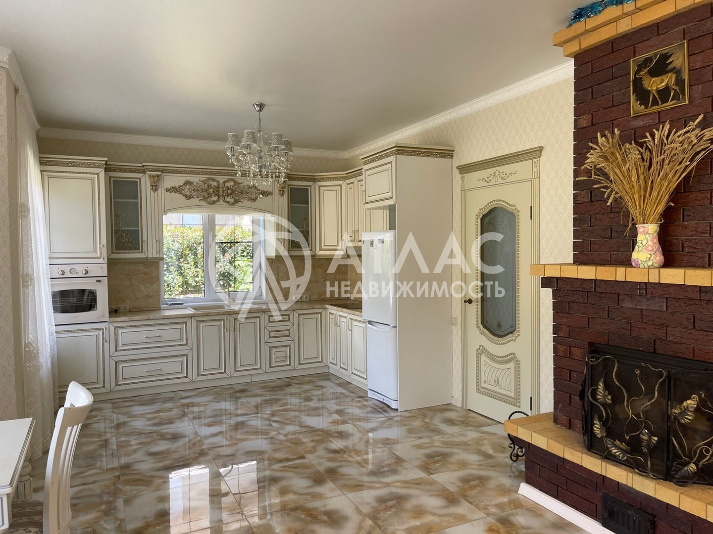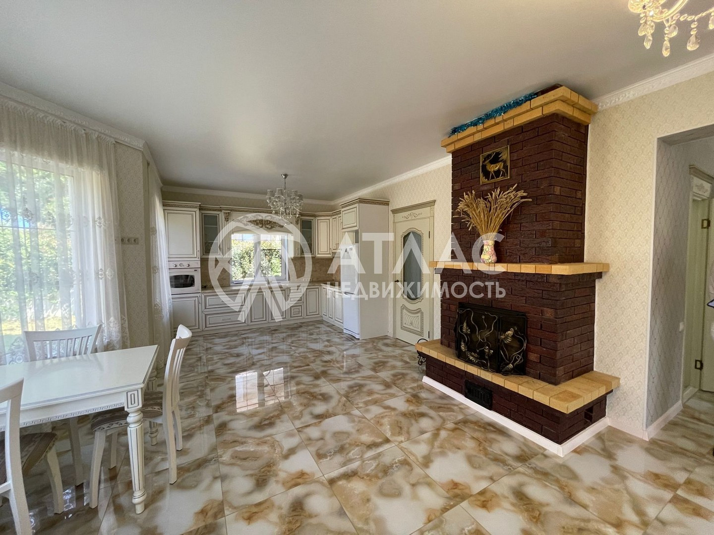 Внутри выполнен ремонт в светлых тонах и установлена кухонная мебель с техникой. По периметру первого этажа разведены тёплые полы, а на втором — батареи.