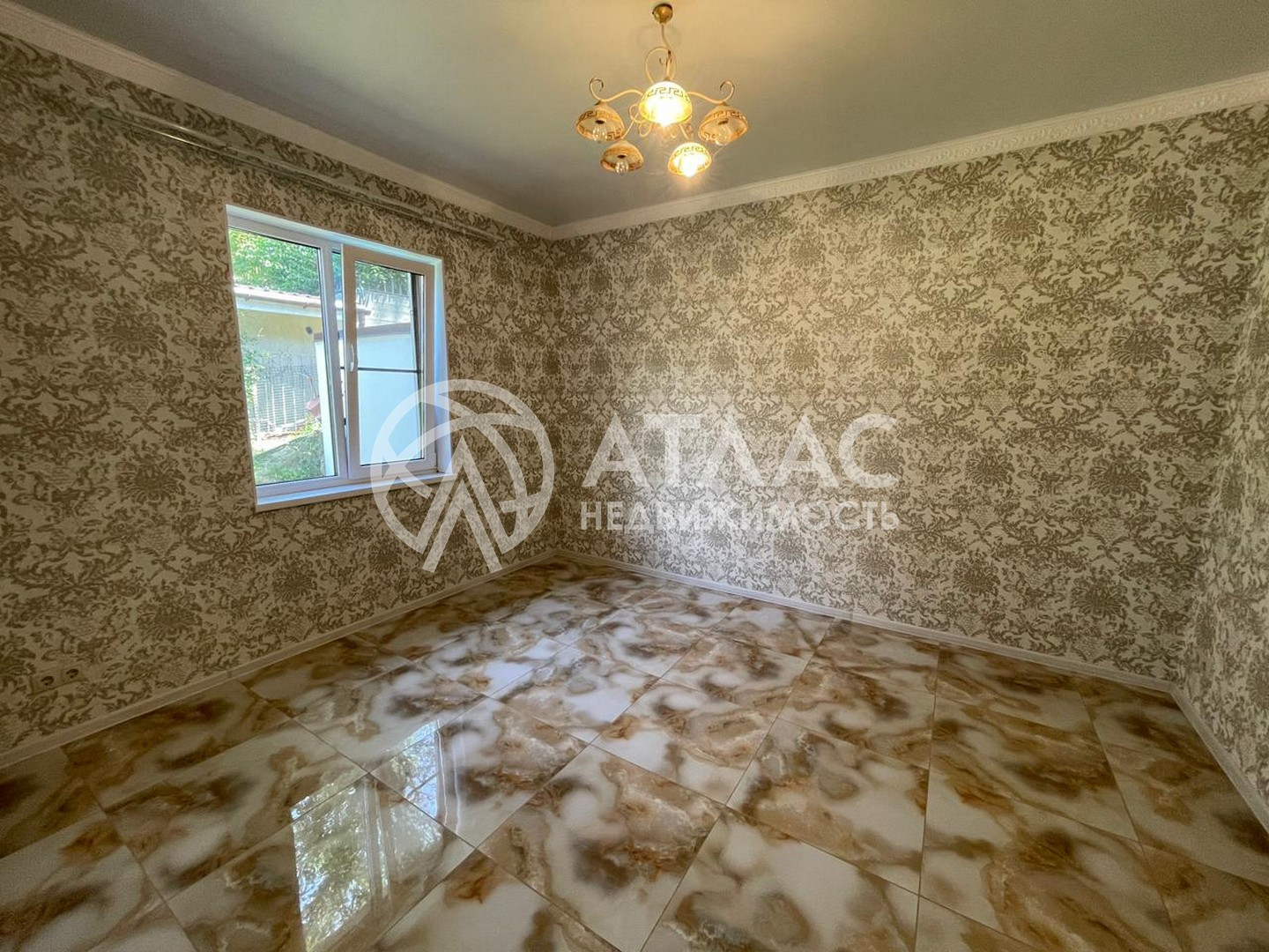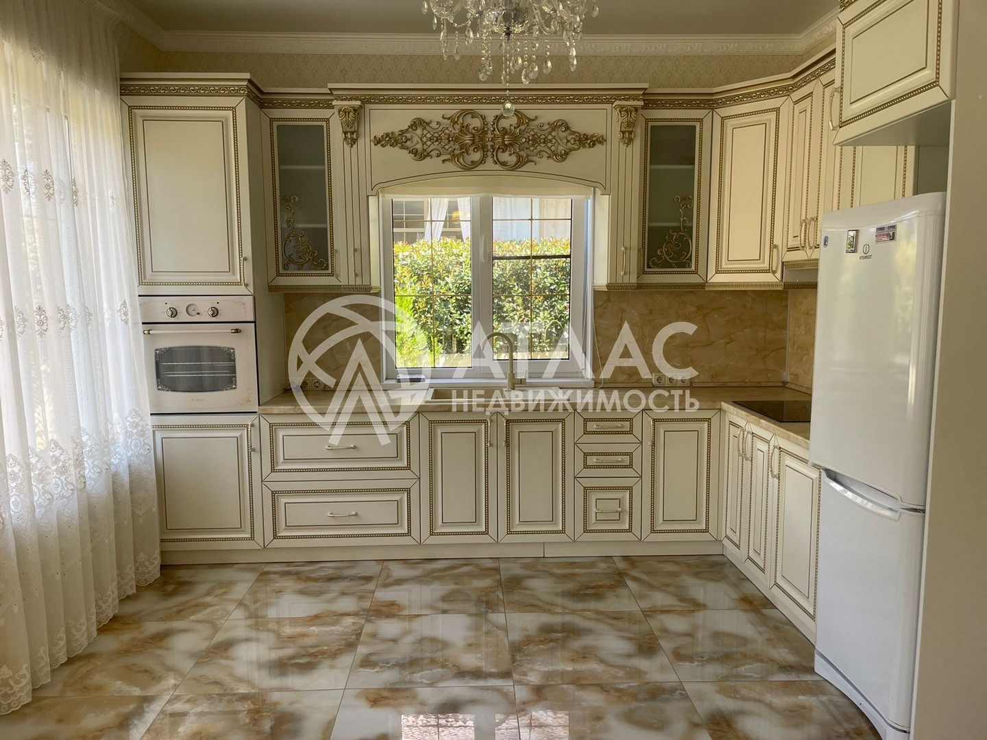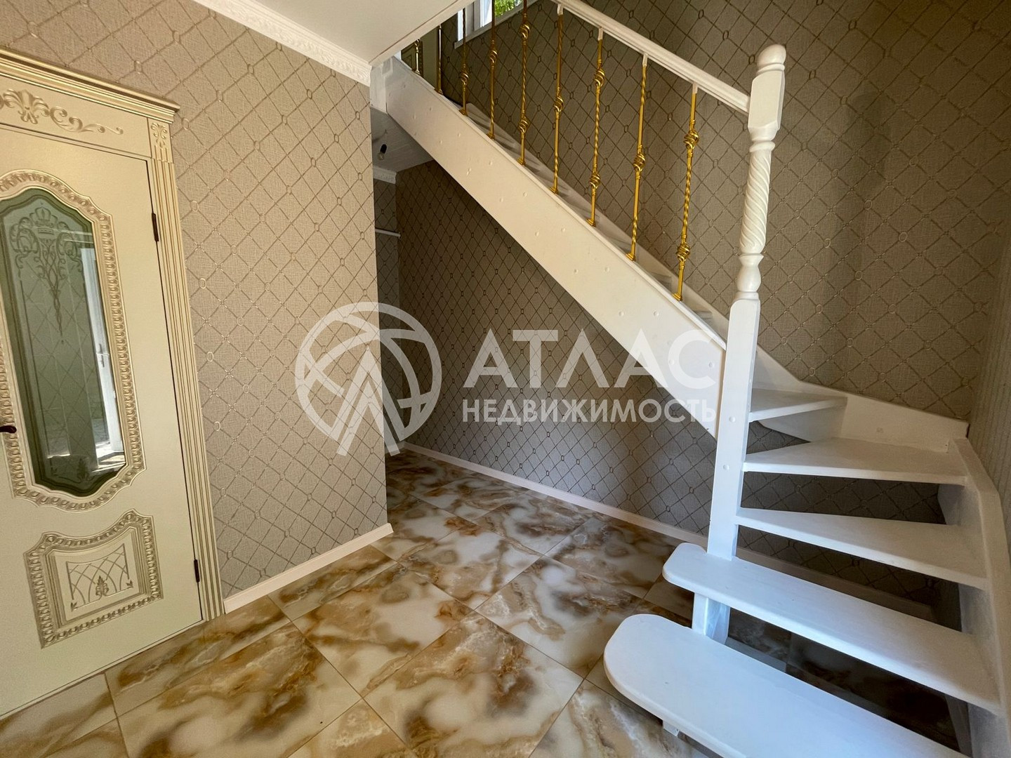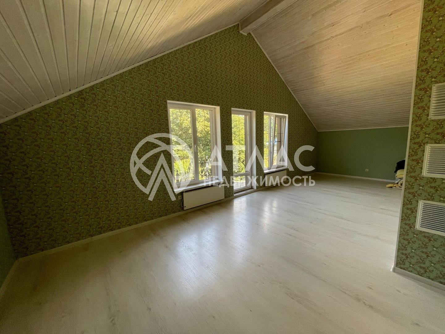 Внутри выполнен ремонт в светлых тонах и установлена кухонная мебель с техникой. По периметру первого этажа разведены тёплые полы, а на втором — батареи.