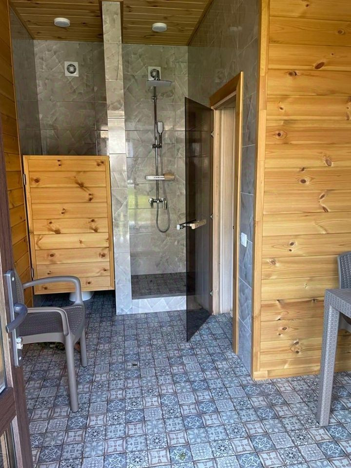 На первом этаже : кухня-столовая, и гостевая спальная комната с отдельным санузлом, Второй этаж: 2 спальни и сан узел.