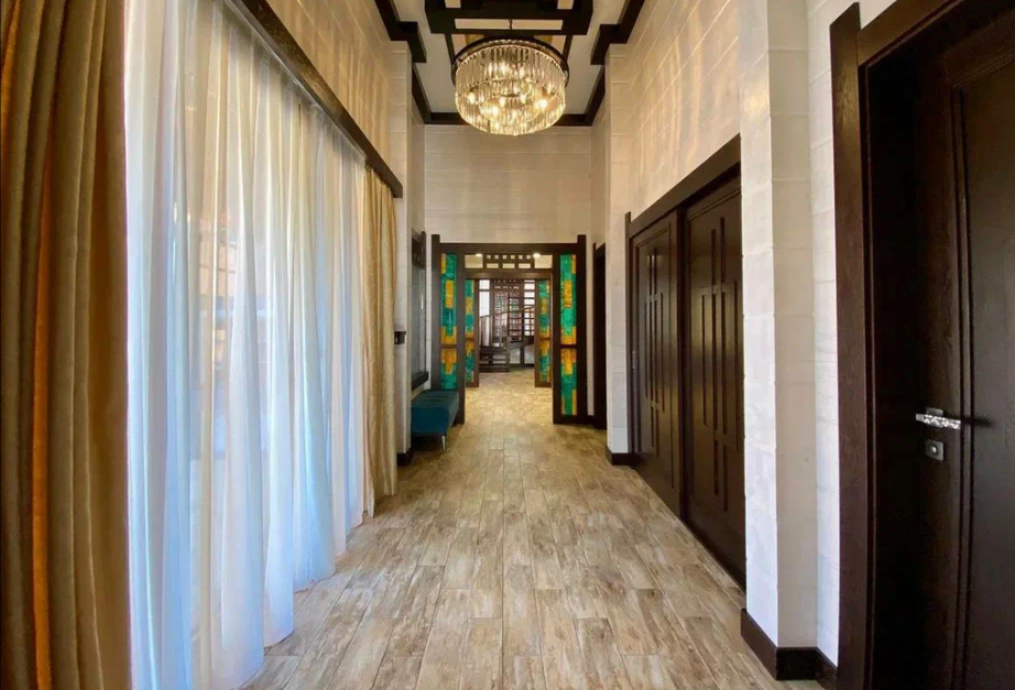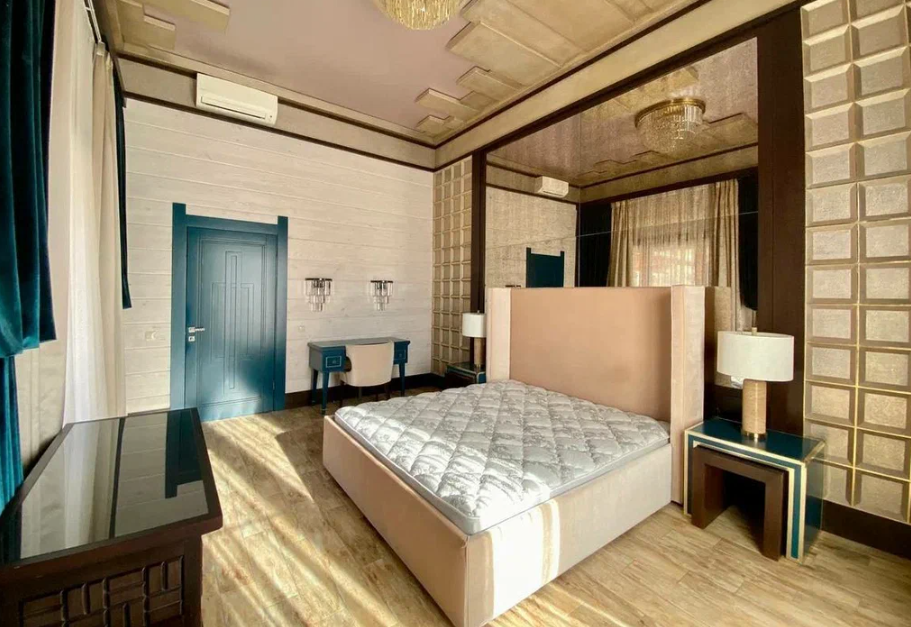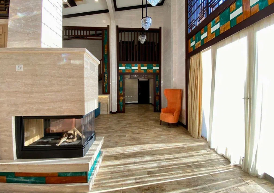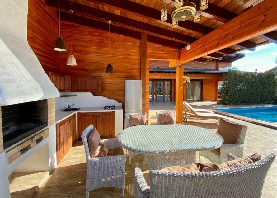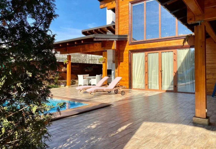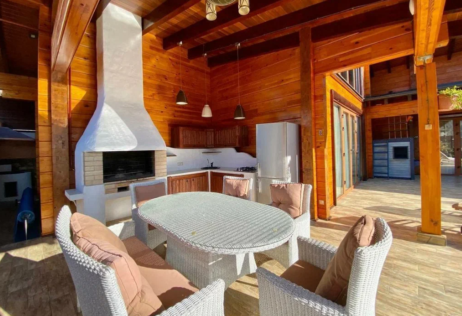 Продаю дом в Сочи, район Мацеста, выполненный из бруса с видом с видом на горы. Дом хорошо подойдет для большой семьи. Общая площадь - 400 м2.  На придомовой территории в 10 соток 2 парковочных места и плюс гараж в который войдет два – три автомобиля. Бассейн с подогревом и также подогрев пола возле бассейна. Возле бассейна расположена большая детская площадка, а также спортивная зона и место, где можно загорать лежа на шезлонгах. На улице имеется летняя кухня с мангальной зоной и тандыром. На 1 этаже расположена прихожая, мастер спальня (свой су, гардеробная, балкон), две детских комнаты, тех. помещение + гардеробная. Также расположена сауна с душем. Просторная гостиная с высокими потолками (самое высокое место 6 м. 25 см.), с камином за которым расположена столовая кухонная зона.