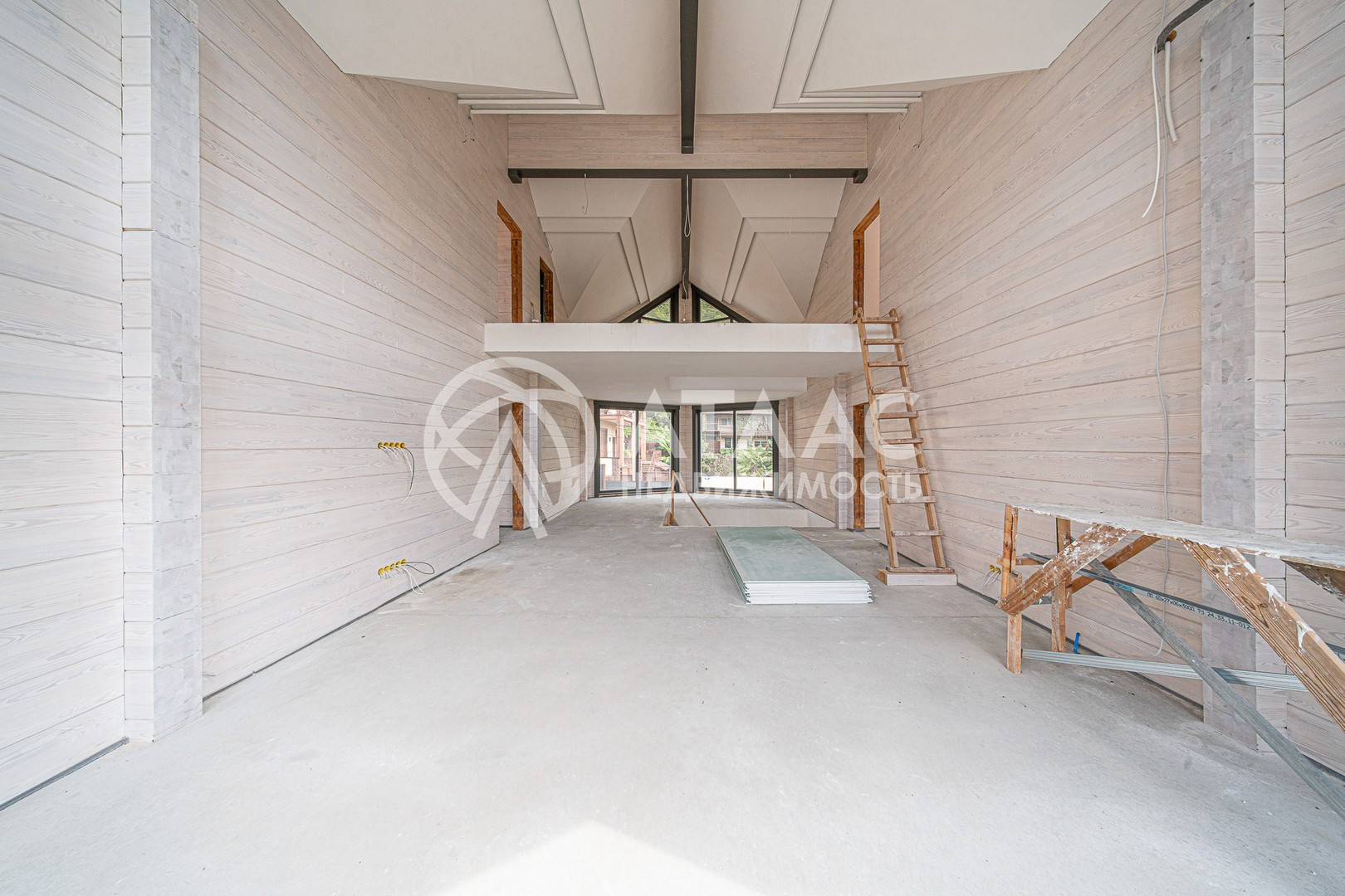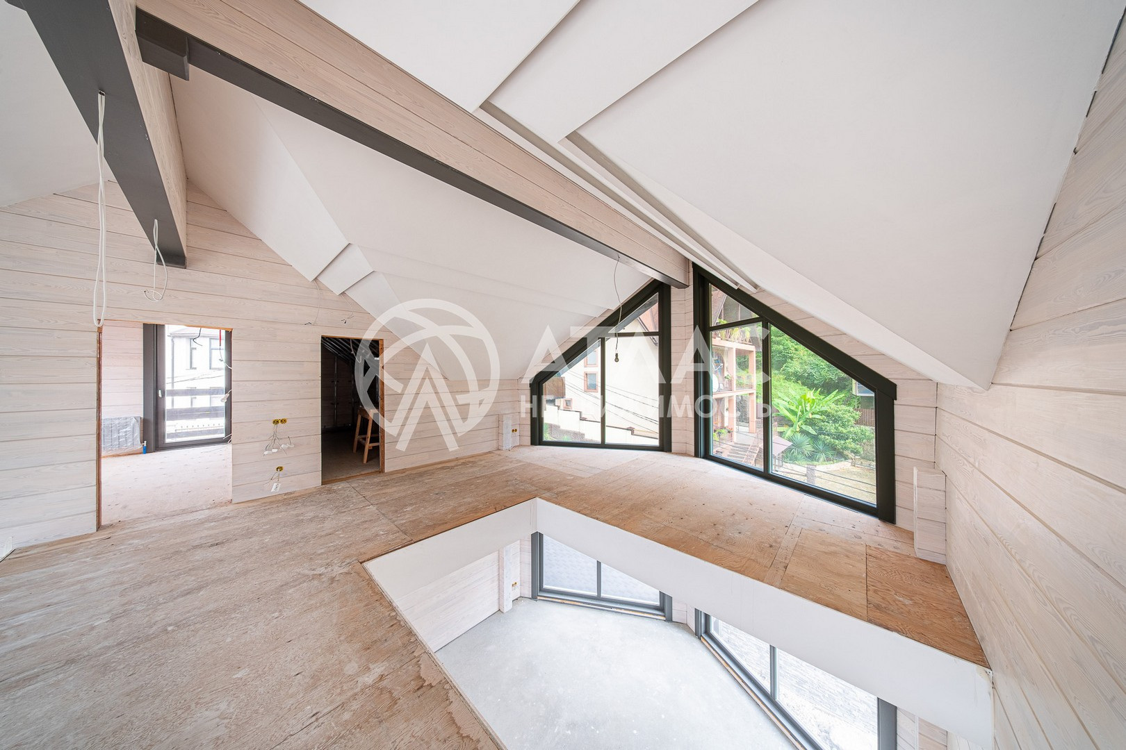 Общая площадь представленного дома – 450 м2 с учетом террас. На первом уровне располагается просторная гостиная, объединенная с кухней, рабочий кабинет, котельная и ванная комнаты. Второй уровень – две спальни с индивидуальными санузлами и холл со вторым светом. Третий уровень – мансарде, где расположено две спальни и ванная комната.