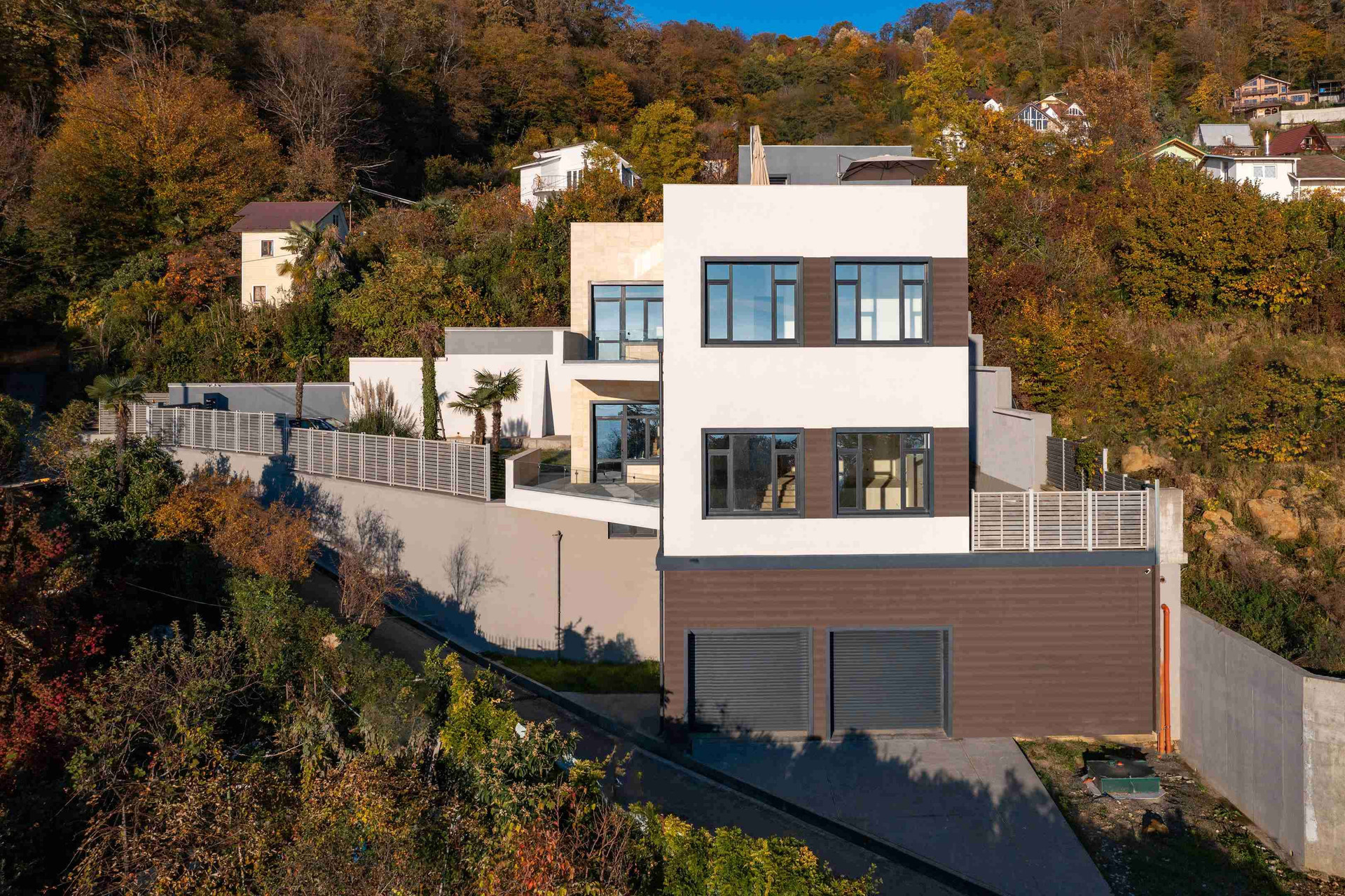 Участок 8 соток, ровный, сделан дренаж, водоотвод, все заезды с пульта. Установлено видеонаблюдение, автоматическая калитка и видеодомофон (всё управляется со смартфона). На участке взрослые пальмы и другие растения.