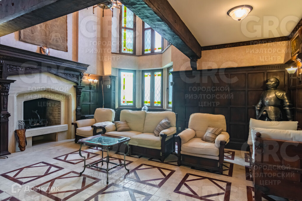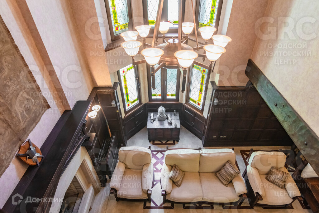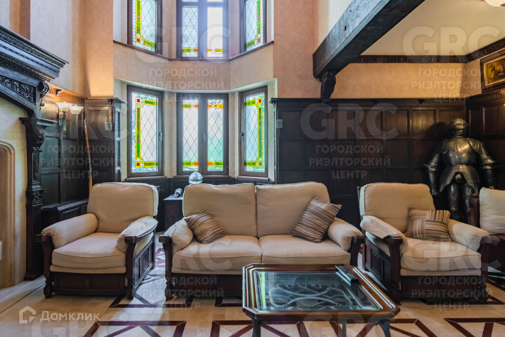 Огромная гостиная с витражными эркерными окнами, спальня и санузел.