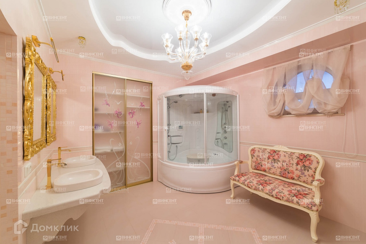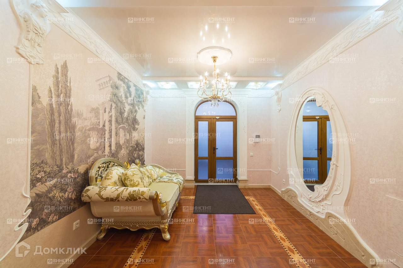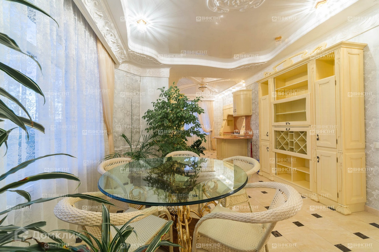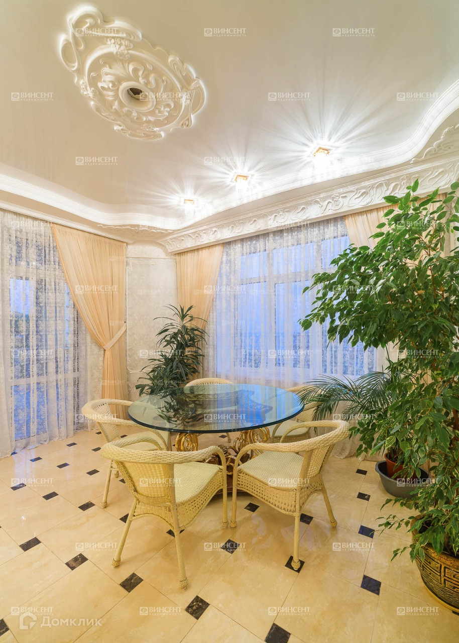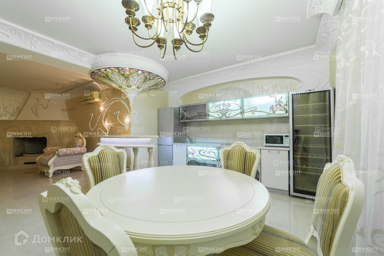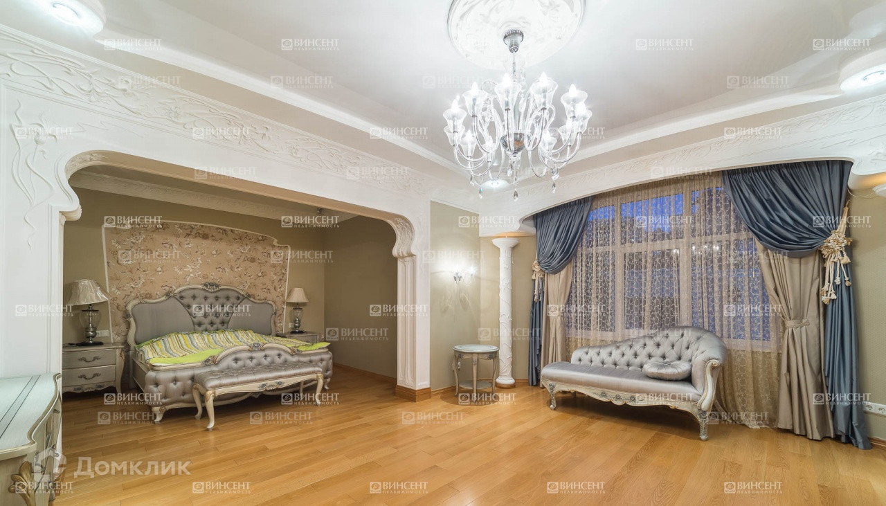 Внутреннее его убранство очень оригинально дополняет общий стилистический ансамбль и свидетельствует о безупречном чувстве вкуса владельцев! Изысканный классицизм, оригинально переплетающийся с мотивами неоклассики и романтичного средиземноморья, наполняет пространство дома невероятным уютом, легкостью и теплотой. В комнатах установлена дорогостоящая мебель, производства лучших фабрик Италии и Франции.  Гостиную комнату украшает лепнина – настоящее произведение искусства! Среди элементов декора также присутствует муранское стекло, бронза и т.д.