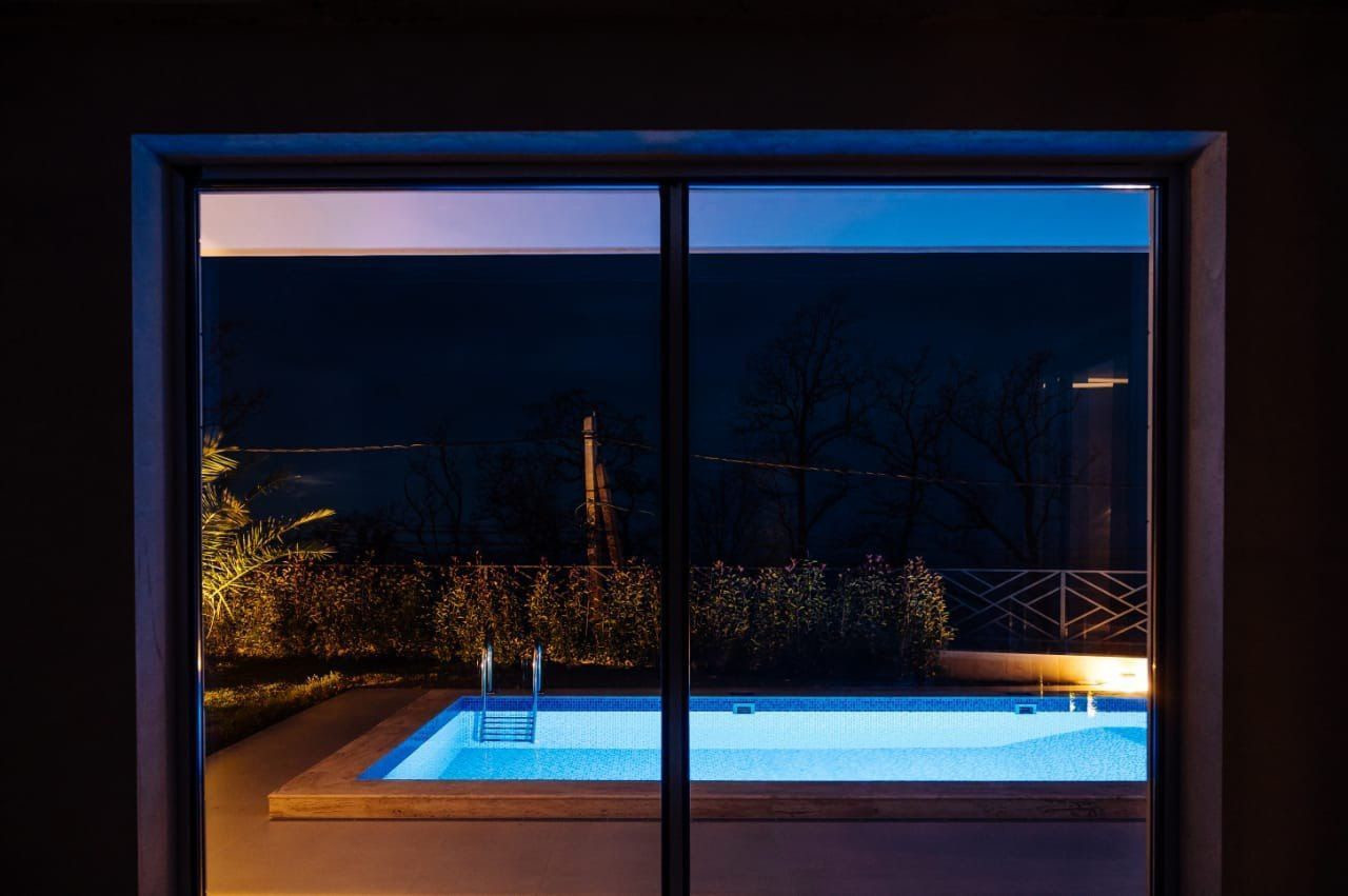 Из окон открывается великолепный вид на бассейн, на море, лес и ландшафтное озеленение участка.