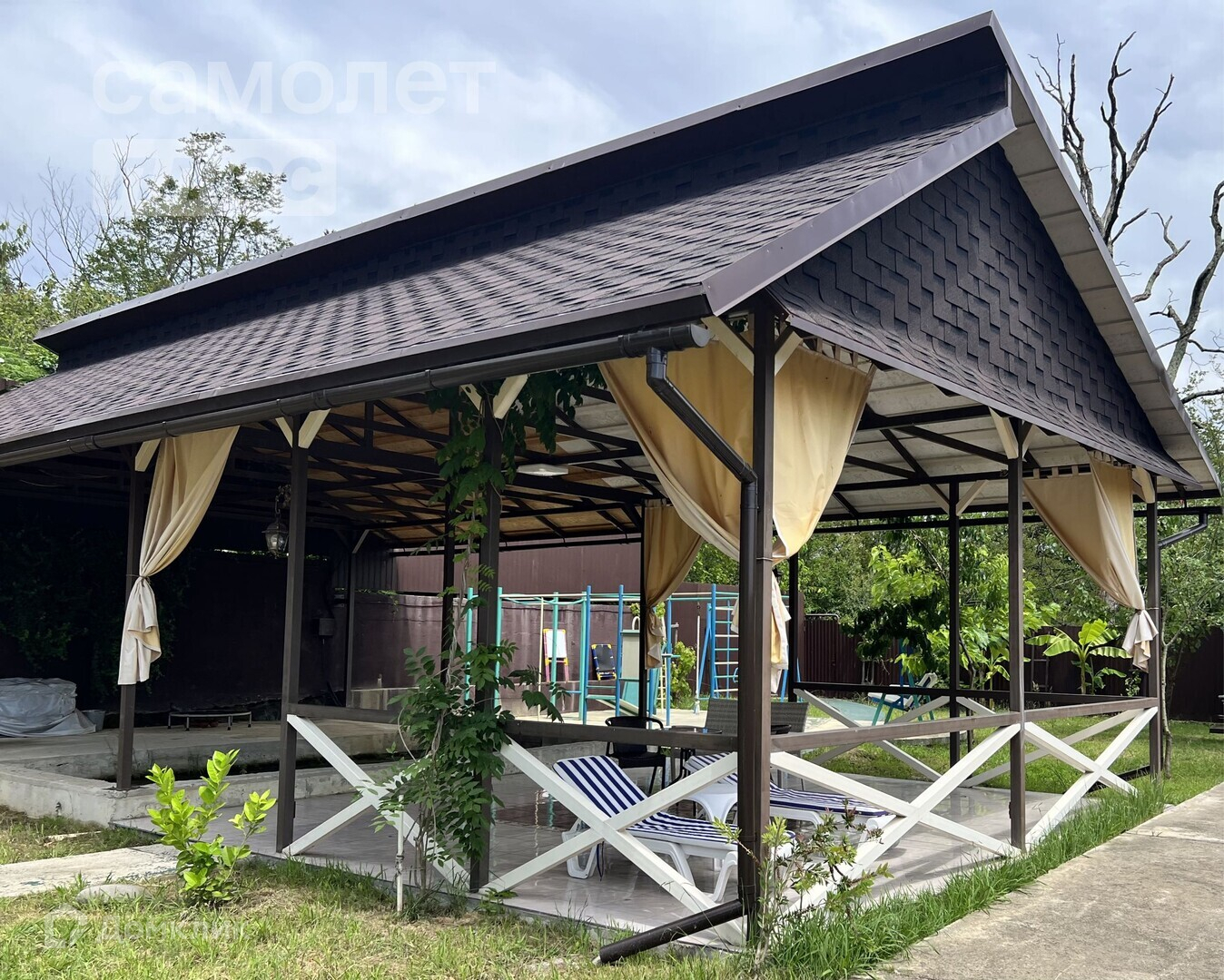 На территории расположены: Летняя кухня, навес для Машин, залита чаша под бассейн и фундамент под Баню, Хозяйский дом.