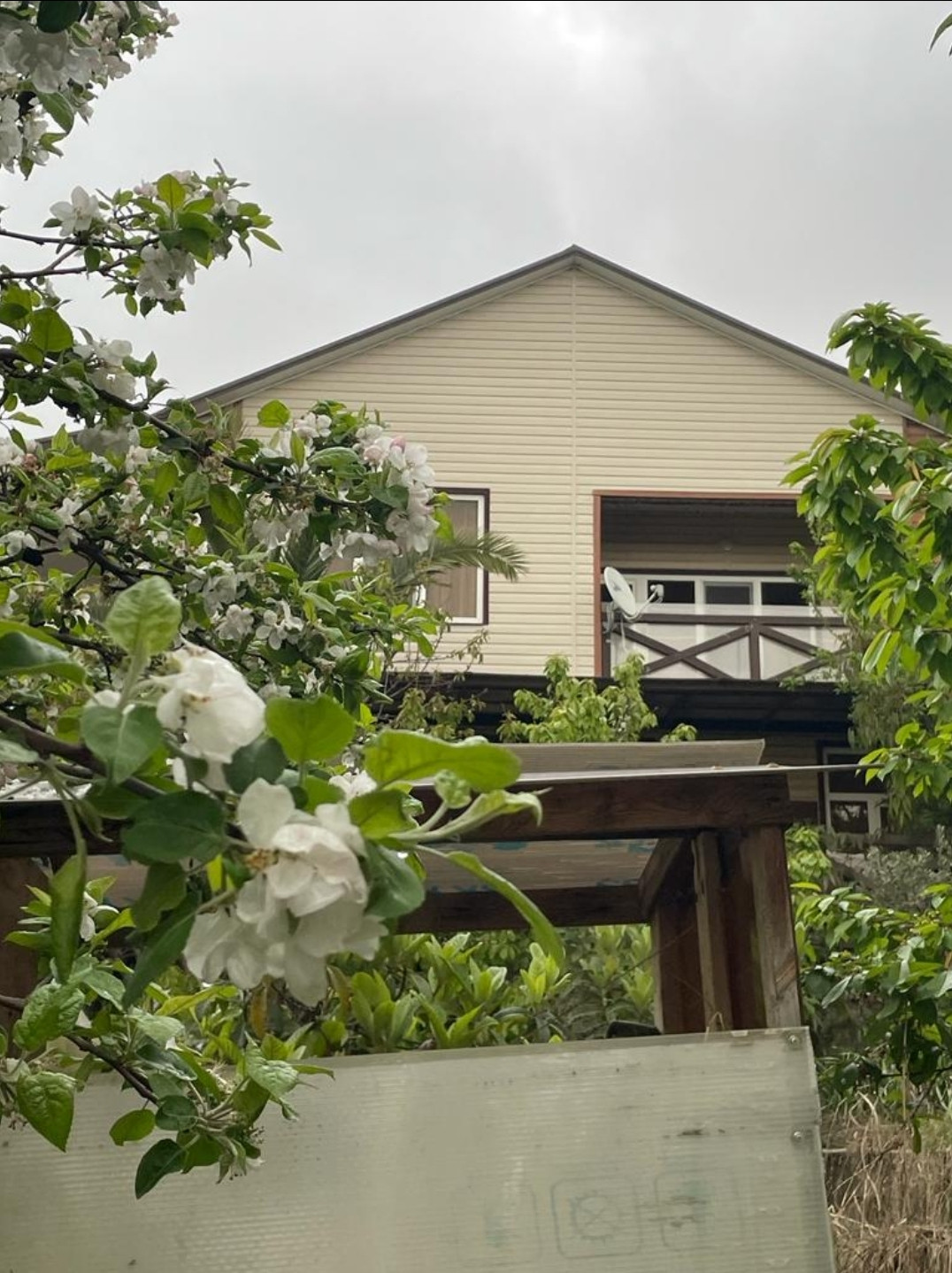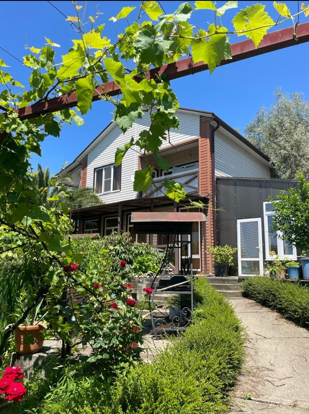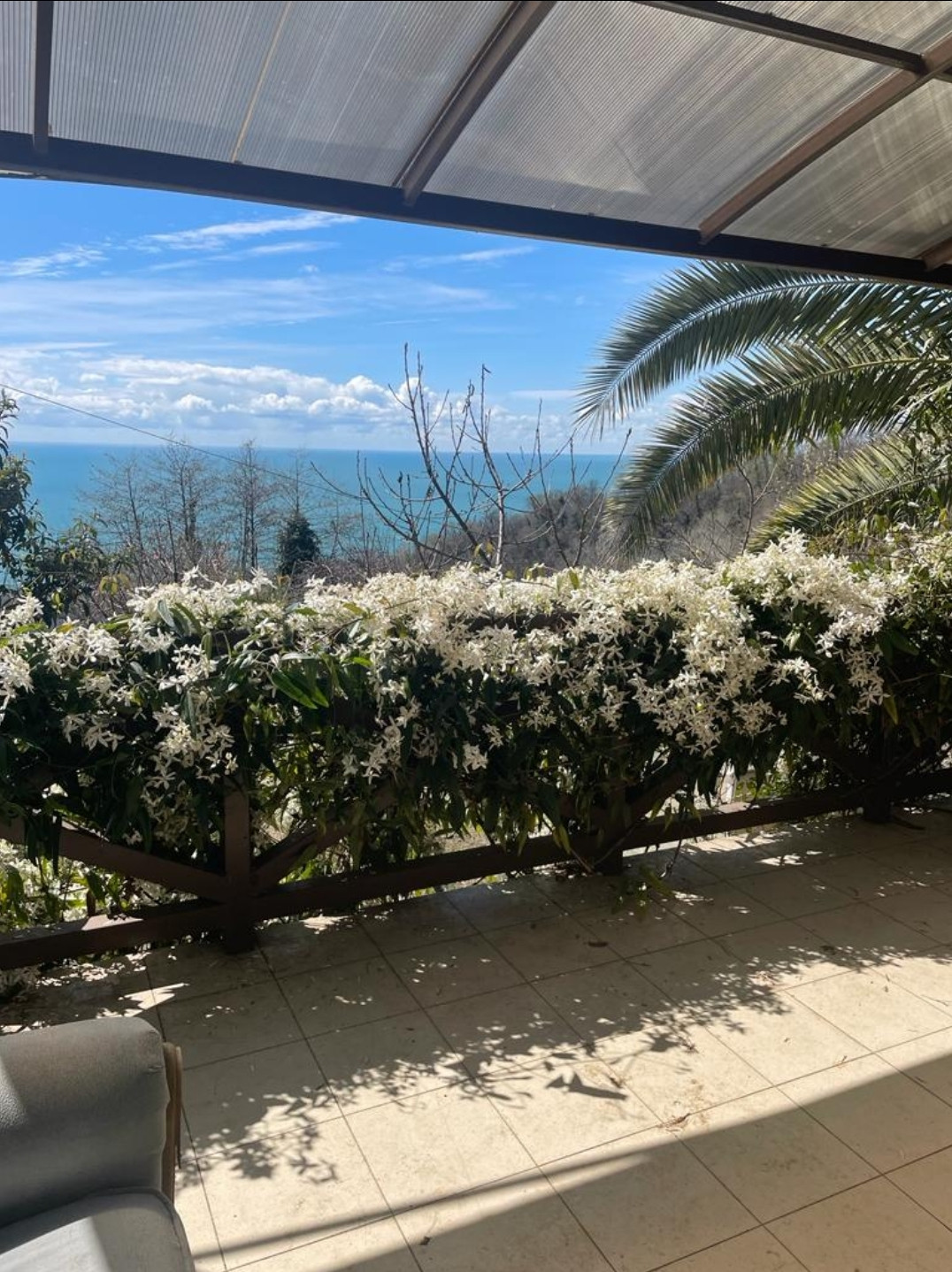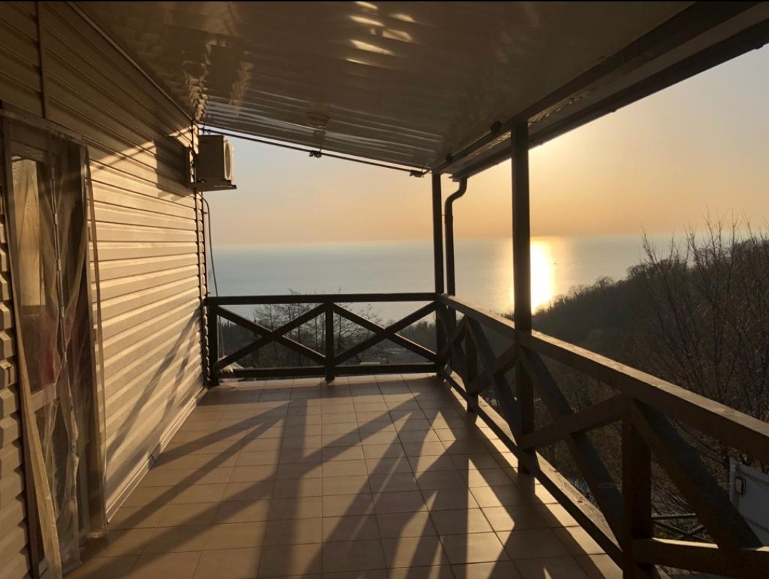 Продаю отличный дом в совхозе «Приморский». На первом этаже прихожая, большая кухня-столовая, санузел, на втором этаже две спальни и санузел. Обе спальни с терассами, с прямым видом на море. На территории дома есть летняя кухня, бассейн, зимний сад. Во дворе много плодовых деревьев, беседка с виноградом,экзотические растения и цветы.Вид на море с первого этажа.