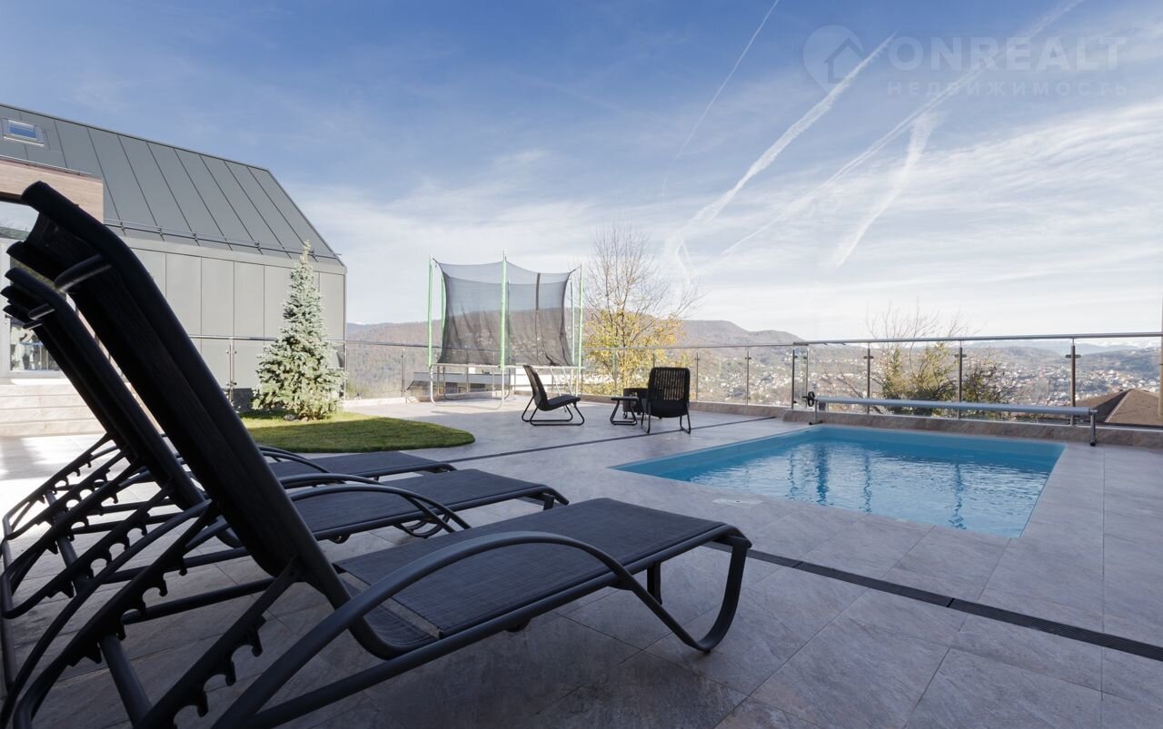 Территория дома  с зонами для отдыха, зона барбекю, бассейн с шезлонгами.