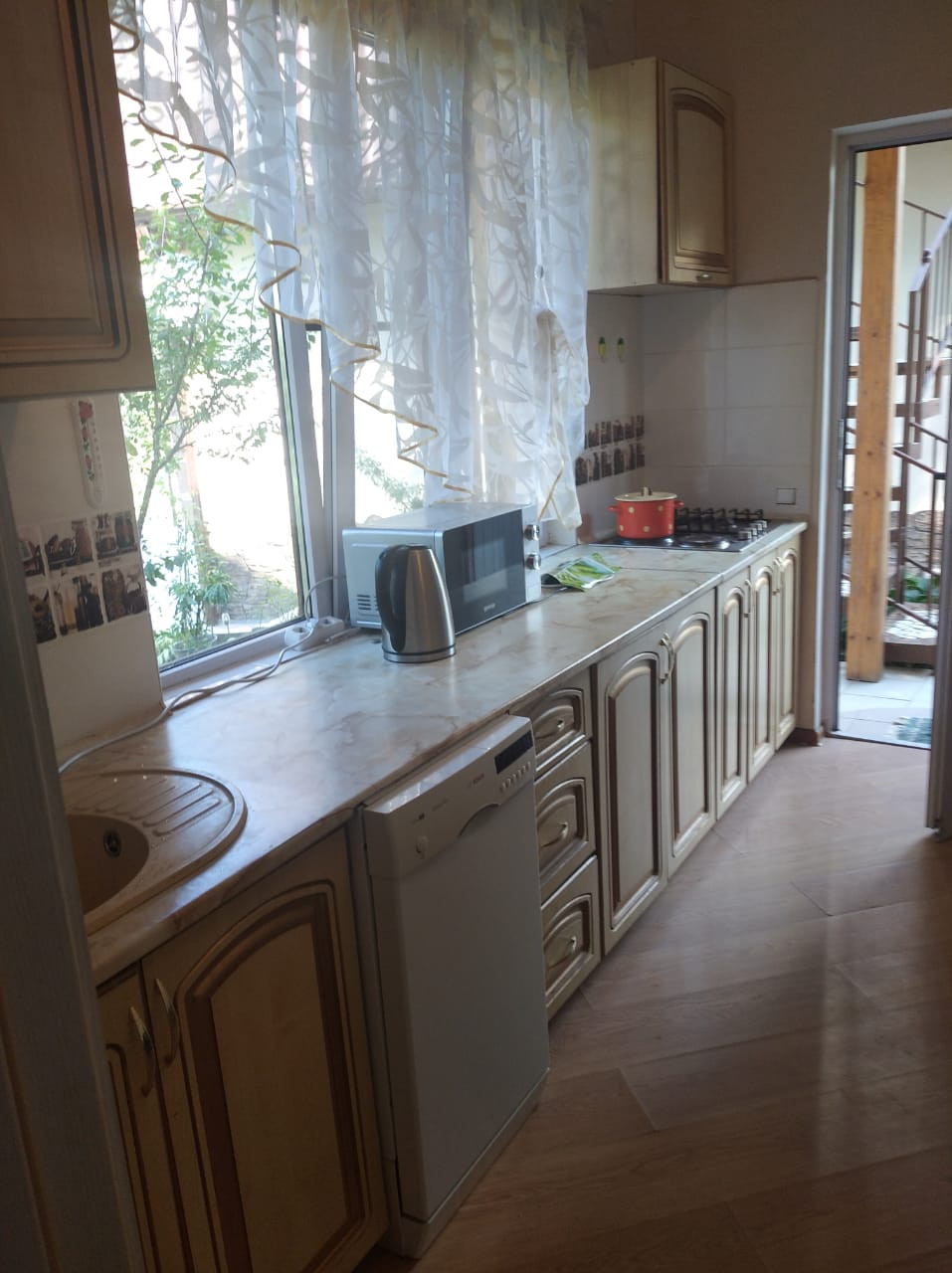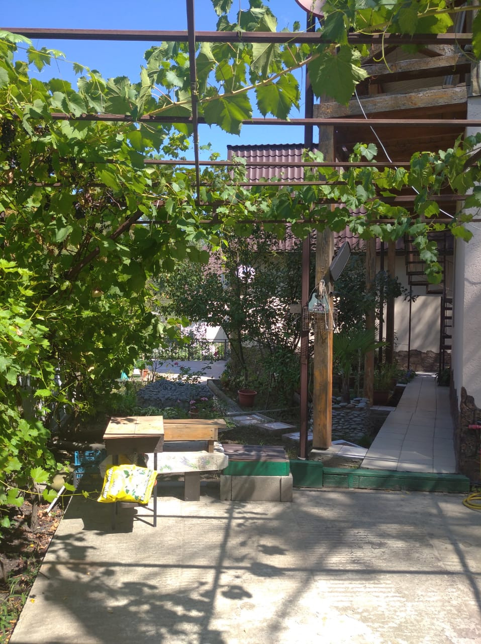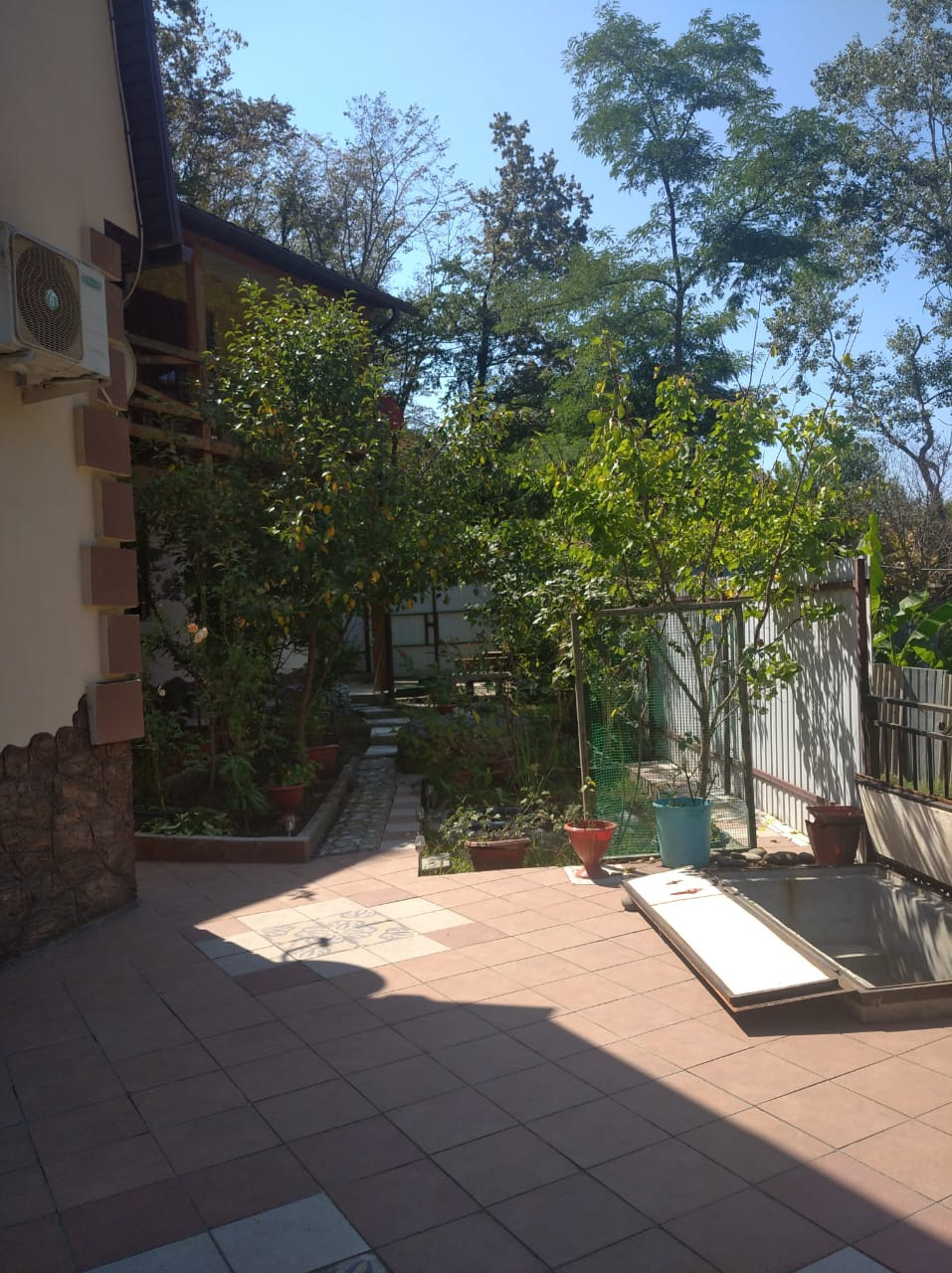 На участке растут фруктовые деревья: сливы, мандарин, персик, яблоня, виноград, груша и розы.