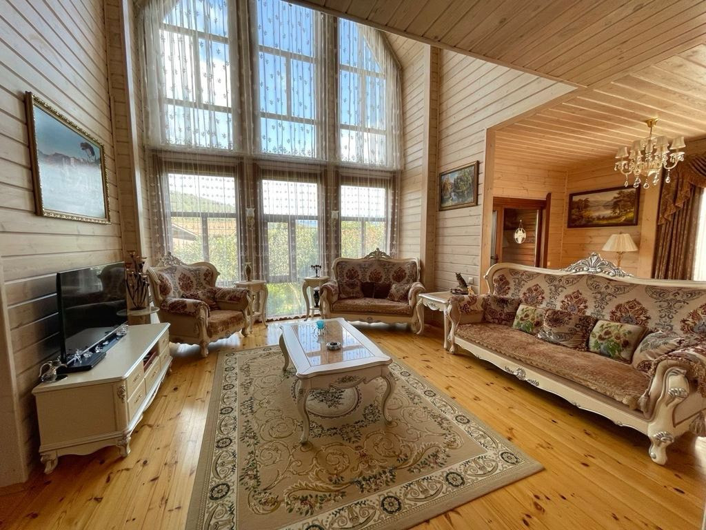 В гостиной организован второй свет с окнами во всю стену и панорамным видом на горы.