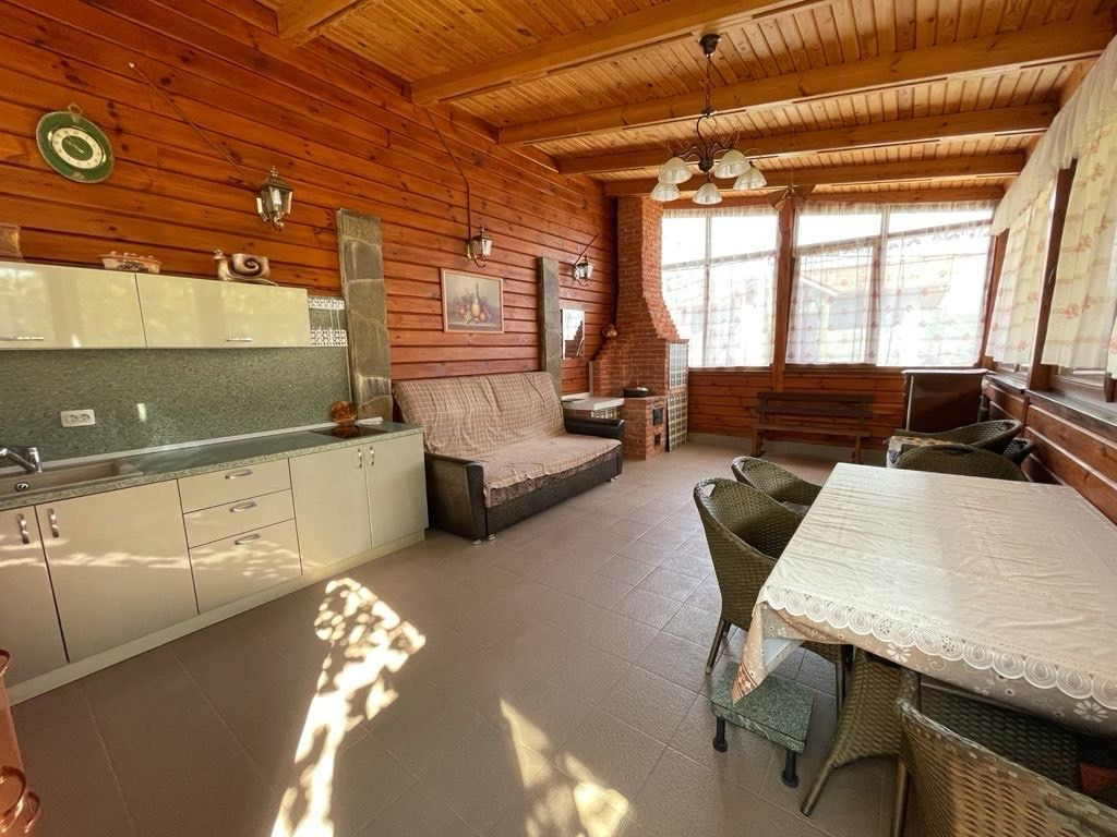 Над гаражом обустроена летняя кухня, в которой проведена вода, оборудована печь для шашлыков и казана.