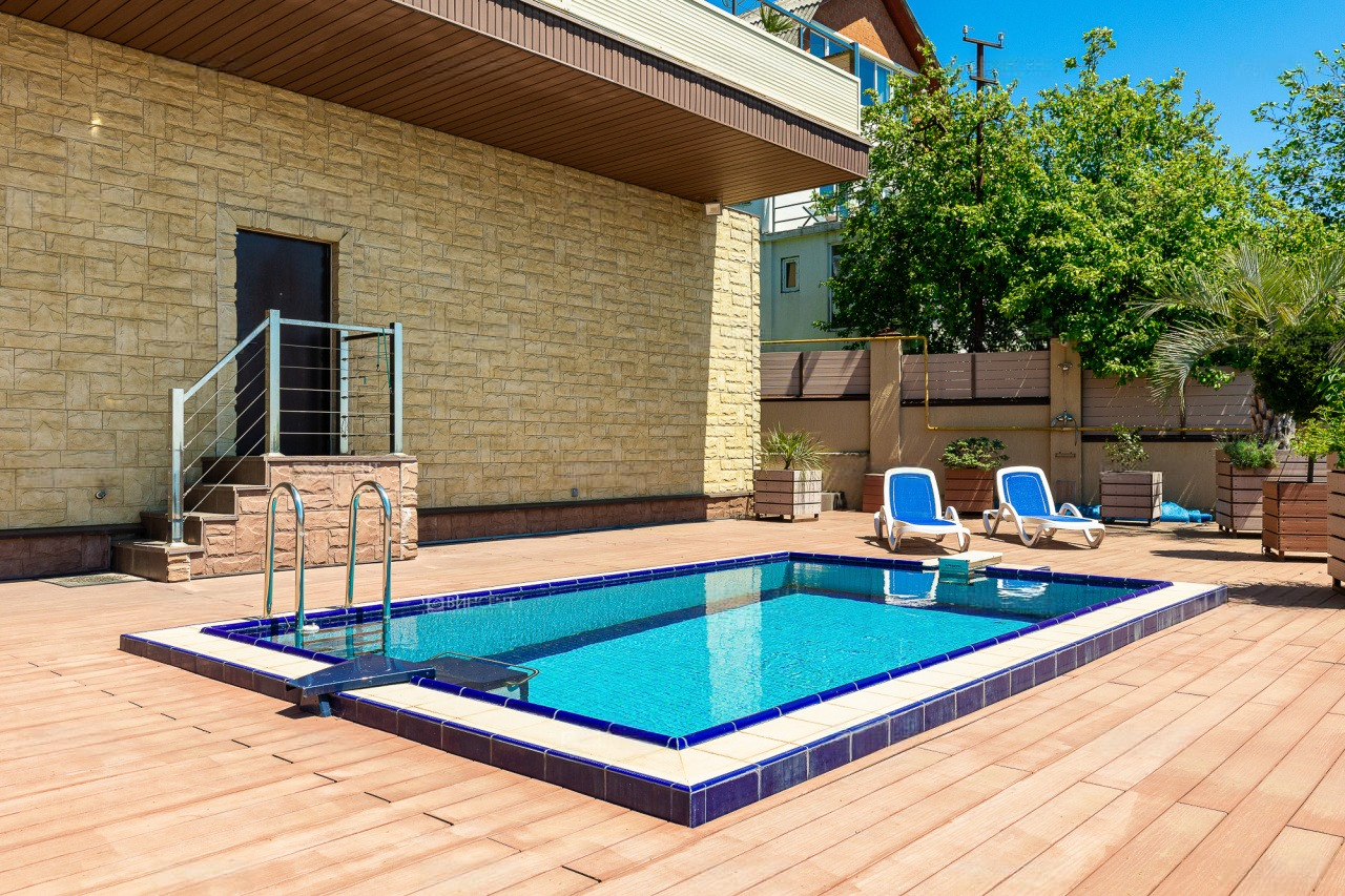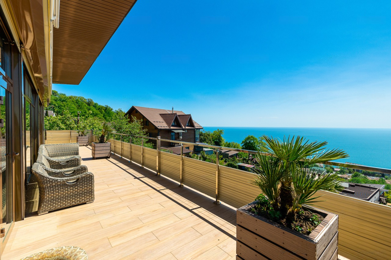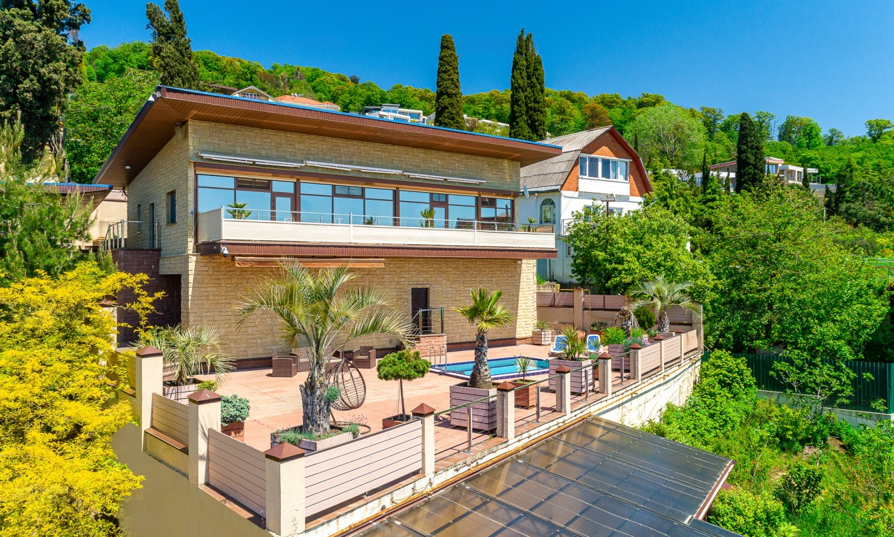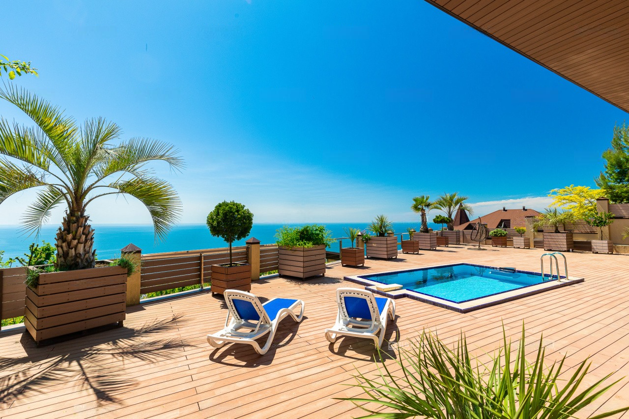 Перед домом располагается зона для отдыха с бассейном и местом для принятия солнечных ванн. Вид отсюда открывается просто потрясающий! Отлично просматриваются морская акватория и южная субтропическая зелень. К слову, ввиду расположения на возвышенной местности, вы можете не переживать о том, что вид кто-то может перекрыть.