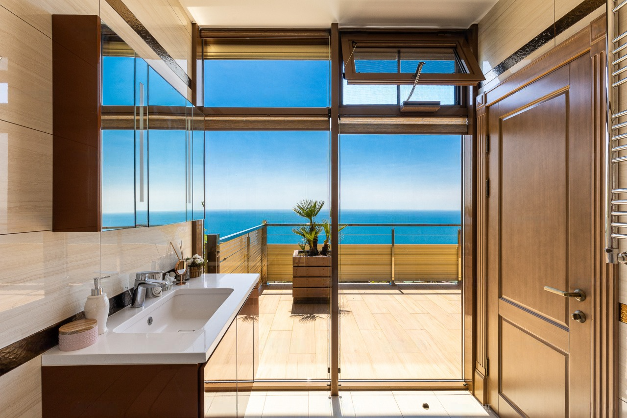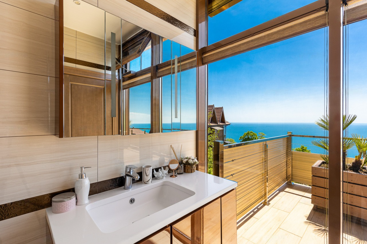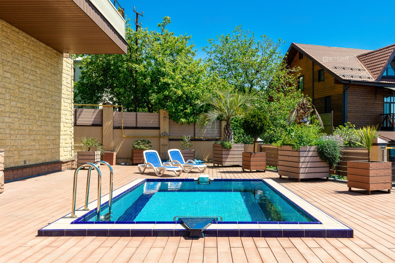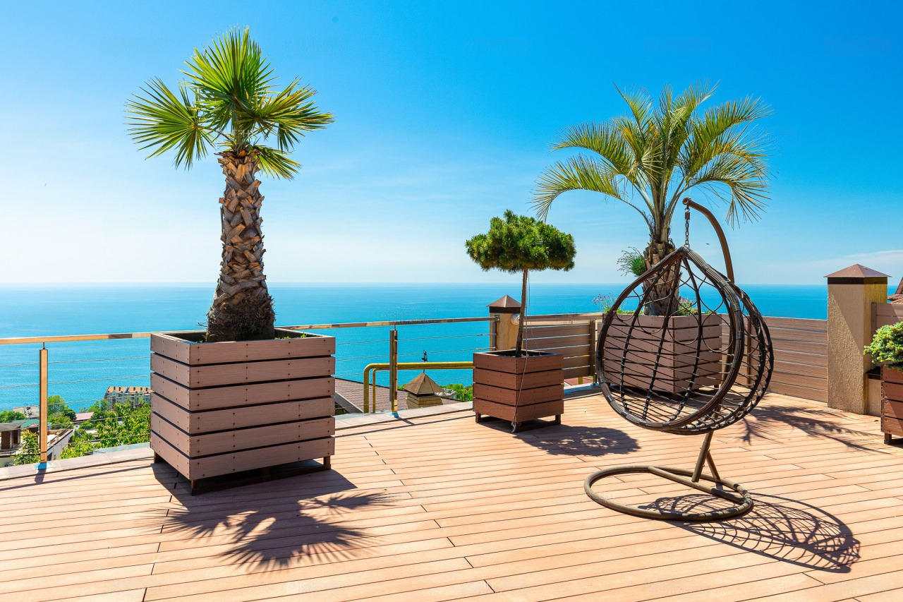 Перед домом располагается зона для отдыха с бассейном и местом для принятия солнечных ванн. Вид отсюда открывается просто потрясающий! Отлично просматриваются морская акватория и южная субтропическая зелень. К слову, ввиду расположения на возвышенной местности, вы можете не переживать о том, что вид кто-то может перекрыть.