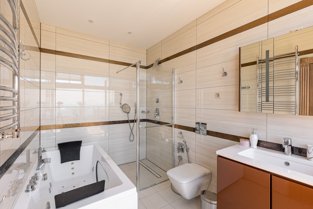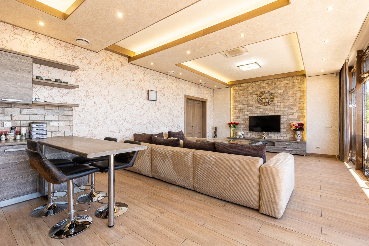 Спальные комнаты изолированы, а гостиная объединена вместе с кухонной зоной. Очень качественный и стильный ремонт, который не требует дополнительных вложений, наличие мебели и бытовой техники – этот аспект позволяет отпраздновать новоселье сразу же после покупки!