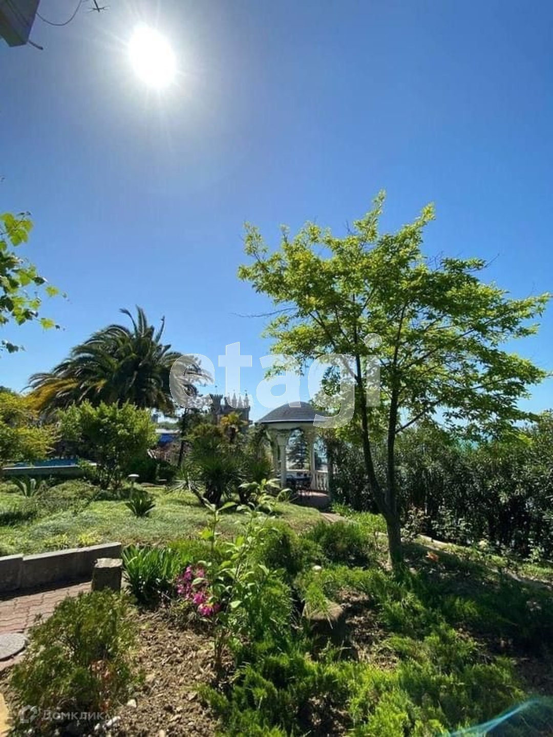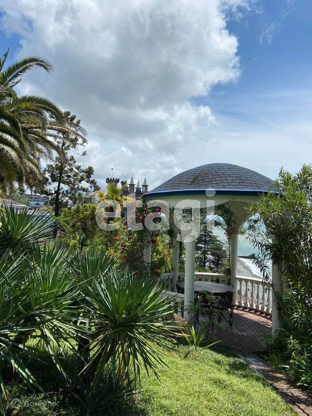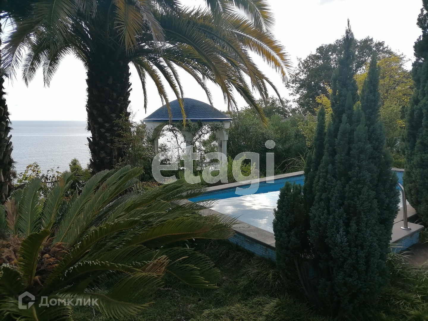 Придомовая территория общая, на ней бассейн с видом на море, беседка с видом на море, мануальная зона, парковочное место, зелень, пальмы!