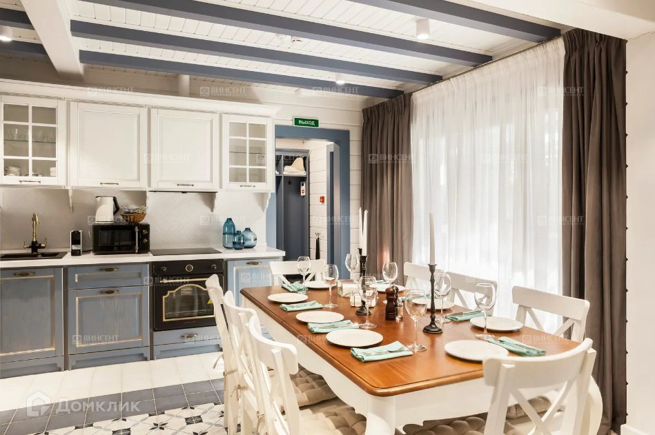 На первом этаже дома находится просторная кухня, совмещённая с гостиной, русская баня на дровах, душевые и туалетная комната.