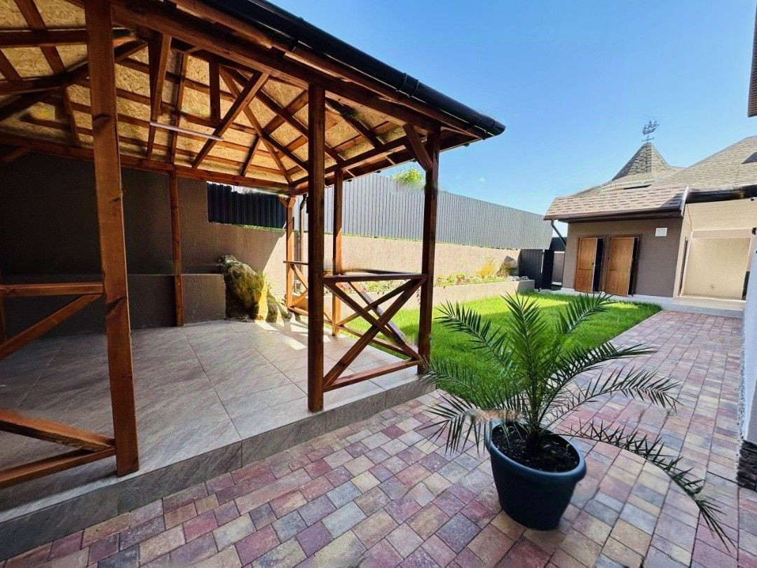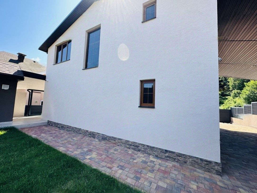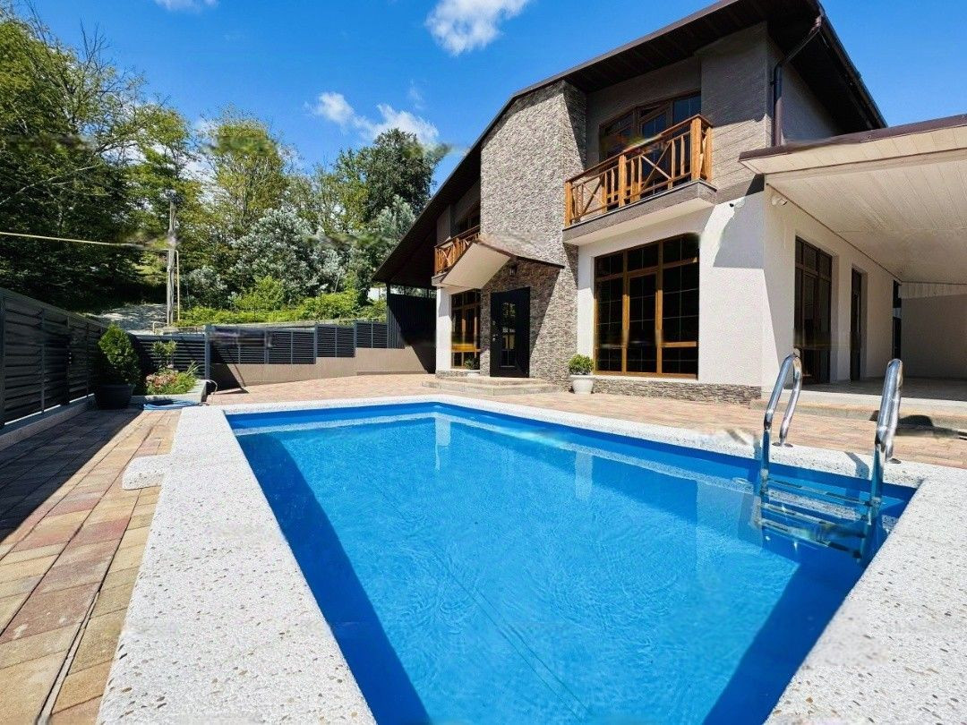 На первом этаже расположены гостиная с выходом на террасу, кабинет и санузел. Второй этаж включает три спальни и еще один санузел, обеспечивая комфортное размещение для всей семьи. Участок площадью 4,5 сотки предлагает множество удобств: установлен бассейн, беседка с мангалом, навес и парковочные места на два автомобиля, создавая идеальные условия для отдыха и развлечений.